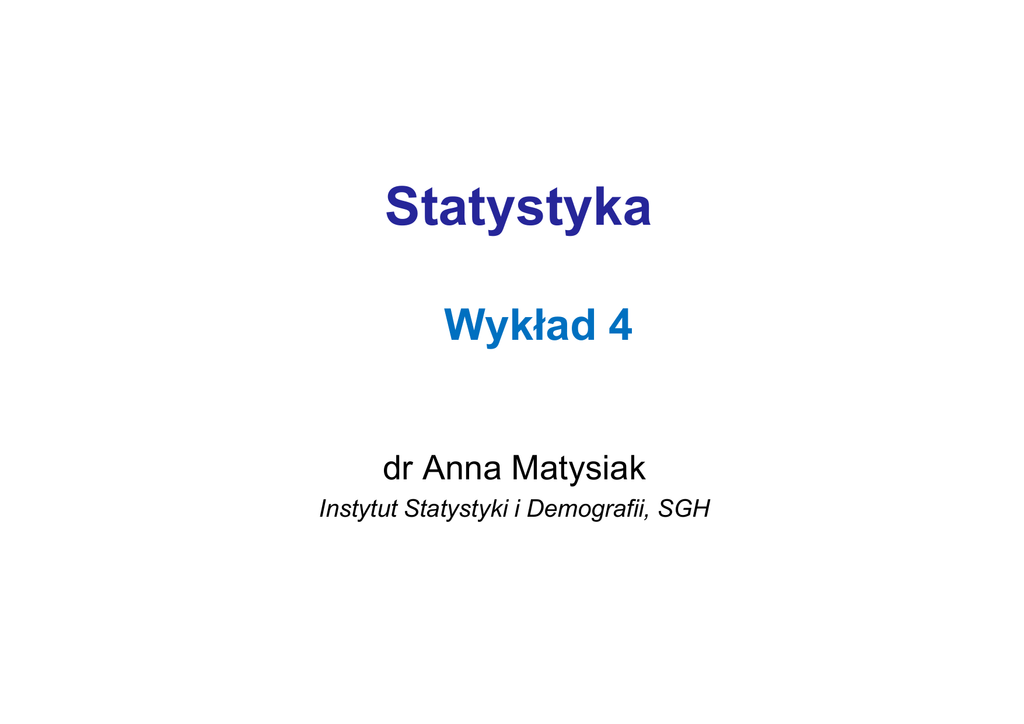 Statystyka Wykład 4 dr Anna Matysiak Instytut Statystyki i Demografii, SGH Metody Statystyczne Metody statystyczne Statystyka opisowa Wnioskowanie statystyczne Estymacja Weryfikacja hipotez Proces wnioskowania Estymacja & testowanie parametrów populacji Statystyki z próby (Zn) Populacja Próba Wnioskowanie statystyczne • Estymacja – szacowanie parametrów w populacji na podstawie informacji z próby • Testowanie hipotez o wartości parametrów w populacji – czy parametr jest „>”, „<” czy „≠” od wartości statystyki obliczonej na podstawie próby Podstawowe pojęcia • Wnioskowanie statystyczne to wnioskowanie o wartości parametru w populacji na podstawie informacji z próby (na podstawie statystyk z próby). • Parametr (w populacji) – statystyka opisowa obliczona na podstawie danych z całej populacji, jej wartość jest najczęściej nieznana i wymaga oszacowania, • Próba losowa – zbiór n elementów wybranych w sposób losowy z populacji; inaczej ciąg n zmiennych losowych (X1, X2,... Xn ) niezależnych o identycznych rozkładach takich jak zmiennej losowej X w populacji Przykład • Przyjmijmy, że wykonujemy serię doświadczeń polegających na trzykrotnym rzucie monetą. Oznaczmy 0-orzeł, 1-reszka Nr doświadczenia x1 x2 x3 1 1 1 1 2 1 1 0 3 1 0 1 4 1 0 0 5 0 1 1 6 0 1 0 7 0 0 1 8 0 0 0 Badana zmienna losowa X- wynik rzutu (orzeł lub reszka); ma rozkład określony prawdopodobieństwami (Xi=i)=1/2 Z populacji pobraliśmy serię 3elementowych prób Rezultat rzutu Przykład • Przyjmijmy, że wykonujemy serię doświadczeń polegających na trzykrotnym rzucie monetą. Oznaczmy 0-orzeł, 1-reszka Nr doświadczenia x1 x2 x3 1 1 1 1 2 1 1 0 3 1 0 1 4 1 0 0 5 0 1 1 6 0 1 0 7 0 0 1 8 0 0 0 Badana zmienna losowa X- wynik rzutu (orzeł lub reszka); ma rozkład określony prawdopodobieństwami (Xi=i)=1/2 Realizacje zmiennej losowej X1 – orzeł / reszka w I rzucie Realizacje zmiennej losowej X3 – orzeł / reszka w III rzucie Przykład • Przyjmijmy, że wykonujemy serię doświadczeń polegających na trzykrotnym rzucie monetą. Oznaczmy 0-orzeł, 1-reszka Nr doświadczenia x1 x2 x3 1 1 1 1 2 1 1 0 3 1 0 1 4 1 0 0 5 0 1 1 6 0 1 0 7 0 0 1 8 0 0 0 Badana zmienna losowa X- wynik rzutu (orzeł lub reszka); ma rozkład określony prawdopodobieństwami (Xi=i)=1/2 X1, X2,X3 to niezależne zmienne losowe o rozkładach identycznych z rozkładem zmiennej X. Realizacje tych zmiennych losowych tworzą próbę losową. Podstawowe pojęcia • Statystyka z próby – statystyka opisowa obliczona na podstawie danych z próby. Jest zmienną losową Zn będącą funkcją zmiennych X1, X2,... Xn , które tworzą próbę losową, np. średnia w próbie, wariancja w próbie, frakcja w próbie. • Rozkład statystyki z próby jest określony przez wartości statystyki z próby oraz prawdopodobieństwa wystąpienia tych wartości. Przykład Nr doświadczenia x1 x2 x3 średnia 1 1 1 1 1 2 1 1 0 2/3 3 1 0 1 2/3 4 1 0 0 1/3 5 0 1 1 2/3 6 0 1 0 1/3 7 0 0 1 1/3 8 0 0 0 0 Rozkład zmiennej losowej X: X P(x=i) 1 0 1/2 1/2 Rozkład średniej z próby: x P( x =j) 0 1/3 2/3 1 1/8 3/8 3/8 1/8 Rozkłady średniej z próby 1. z populacji normalnej ze znanym σ 2. z populacji normalnej z nieznanym σ 3. graniczny, z populacji o dowolnym rozkładzie Rozkład średniej z próby z populacji o rozkładzie N ( µ , σ ) Średnia arytmetyczna z próby X = ∑X i i n posiada przy powyższych założeniach rozkład normalny ze średnią E (X ) = µ σ i odchyleniem standardowym D( X ) = n X ~ N (µ , σ n ) Im liczebność próby większa tym , zróżnicowanie średniej z próby względem średniej w populacji mniejsze Przykład Wiedząc, że waga noworodków chłopców (X w kg) może być aproksymowana za pomocą rozkładu normalnego : N(4; 0.8), oblicz, jakie jest prawdopodobieństwo, że: A) losowo wybrany noworodek-chłopiec będzie ważył powyżej 3,8 kg; B) średnia waga w grupie 25 noworodków będzie większa od 3,8 kg? Przykład f(X) X ~ N (4;0,8) B σx= 0.8 0,8 X ~ N (4; ) → X ~ N (4;0,16) 25 n =25 σX = 0.16 A X µ =4 A. Rozkład populacji B. Rozkład próby Przykład A) Prawdopodobieństwo, że losowo wybrany noworodek-chłopiec będzie ważył powyżej 3,8 kg: X ~ N (4;0,8) P(X>3,8) = P(Z>(3,8-4)/0,8)=P(Z>-0,25) = 1-P(Z<-0,25) = 1-F(-0,25) = F(0,25)=0.5987 B) Prawdopodobieństwo, że średnia waga w grupie 25 noworodków będzie większa od 3,8 kg? 0,8 X ~ N (4; ) → X ~ N (4;0,16) 25 P(X>3,8) = P(Z>(3.8-4)/0.16) = P(Z> -1.25) = 1-P(Z<-1,25) = = 1-F(-1.25)= 0.8944 Rozkład średniej z próby z populacji o rozkładzie N ( µ , σ ) σ - nieznane Do wnioskowania o średniej wykorzystuje się statystykę X − µ t= S n gdzie S – odchylenie standardowe Statystyka t ma rozkład t-Studenta z v=n-1 stopniami swobody ROZKŁAD t-Studenta Jeśli zmienna losowa ciągła t ma funkcję gęstości postaci: v +1 v +1 Γ 2− 2 t 2 f (t ) = 1 + v v vπ Γ 2 gdzie: dla t ∈(−∞,+∞) +∞ Γ(x ) = ∫ t x −1 ⋅ e −t dt 0 to zmienna losowa t ma rozkład t-Studenta Kształt funkcji gęstości rozkładu t-Studenta przypomina kształt funkcji gęstości rozkładu normalnego (krzywą Gaussa) Jest to rozkład symetryczny zawsze względem wartości 0 Przy t ±∞ wartości funkcji f(t) zbiegają do 0 ROZKŁAD t-Studenta ROZKŁAD t-Studenta W tym rozkładzie jedynym parametrem (jedyną stałą) jest „liczba stopni swobody” v Oznacza to, że kształt wykresu funkcji f(t) zależy tylko od wartości v y=student(x;30) y=student(x;15) y=student(x;2) 0,5 0,5 0,5 v=2 0,4 v= 15 0,4 0,3 0,3 0,2 0,2 0,1 0,1 0,3 0,2 0,1 0,0 0,0 0,0 -3 -2 -1 0 1 2 -3 3 v= 30 0,4 -2 -1 0 1 2 3 -3 -2 -1 0 1 Dla v > 30 rozkład t-Studenta jest zbieżny z rozkładem standardowym normalnym N(0,1) Parametry w tym rozkładzie: 1. 2. Wartość oczekiwana E(t) = 0 2 Wariancja D (t) = v v −2 2 3 ROZKŁAD t-Studenta Wartości prawdopodobieństw w rozkładzie t-Studenta zostały policzone i zawierają je tablice statysty