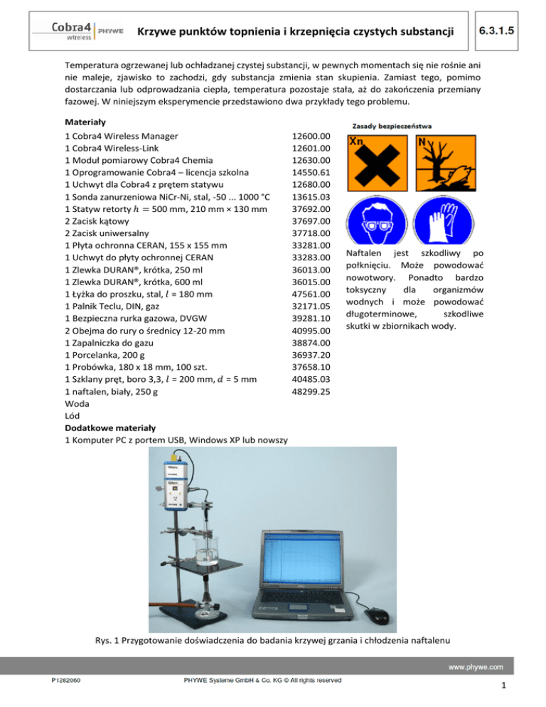 Krzywe punktów topnienia i krzepnięcia czystych substancji Temperatura ogrzewanej lub ochładzanej czystej substancji, w pewnych momentach się nie rośnie ani nie maleje, zjawisko to zachodzi, gdy substancja zmienia stan skupienia. Zamiast tego, pomimo dostarczania lub odprowadzania ciepła, temperatura pozostaje stała, aż do zakończenia przemiany fazowej. W niniejszym eksperymencie przedstawiono dwa przykłady tego problemu. Materiały 1 Cobra4 Wireless Manager 1 Cobra4 Wireless-Link 1 Moduł pomiarowy Cobra4 Chemia 1 Oprogramowanie Cobra4 – licencja szkolna 1 Uchwyt dla Cobra4 z prętem statywu 1 Sonda zanurzeniowa NiCr-Ni, stal, -50 ... 1000 °C 1 Statyw retorty ℎ = 500 mm, 210 mm × 130 mm 2 Zacisk kątowy 2 Zacisk uniwersalny 1 Płyta ochronna CERAN, 155 x 155 mm 1 Uchwyt do płyty ochronnej CERAN 1 Zlewka DURAN®, krótka, 250 ml 1 Zlewka DURAN®, krótka, 600 ml 1 Łyżka do proszku, stal, 𝑙 = 180 mm 1 Palnik Teclu, DIN, gaz 1 Bezpieczna rurka gazowa, DVGW 2 Obejma do rury o średnicy 12-20 mm 1 Zapalniczka do gazu 1 Porcelanka, 200 g 1 Probówka, 180 x 18 mm, 100 szt. 1 Szklany pręt, boro 3,3, 𝑙 = 200 mm, 𝑑 = 5 mm 1 naftalen, biały, 250 g Woda Lód Dodatkowe materiały 1 Komputer PC z portem USB, Windows XP lub nowszy 12600.00 12601.00 12630.00 14550.61 12680.00 13615.03 37692.00 37697.00 37718.00 33281.00 33283.00 36013.00 36015.00 47561.00 32171.05 39281.10 40995.00 38874.00 36937.20 37658.10 40485.03 48299.25 Naftalen jest szkodliwy po połknięciu. Może powodować nowotwory. Ponadto bardzo toksyczny dla organizmów wodnych i może powodować długoterminowe, szkodliwe skutki w zbiornikach wody. Rys. 1 Przygotowanie doświadczenia do badania krzywej grzania i chłodzenia naftalenu 1 Krzywe punktów topnienia i krzepnięcia czystych substancji Uwagi Naftalen (s) R: 22 - 40 - 50/53 S: 36/37 - 46 - 60 - 61 Naftalen tworzy bezbarwne kryształy, łatwo rozpuszczalne w większości rozpuszczalników organicznych. Może sublimować i pali się jasnym i bardzo dymiącym płonieniem. Zagrożenia: Działa szkodliwie po połknięciu. Może powodować nowotwory. Bardzo toksyczny dla organizmów wodnych, szkodliwe, powoduje długotrwałe, szkodliwe skutki dla zbiorników wodnych. Środki ostrożności: Unikać kontaktu ze skórą i oczami, założyć odzież ochronną, rękawice i okulary ochronne. W razie połknięcia niezwłocznie zasięgnąć porady lekarza, pokazując mu opakowanie lub etykietę. Wyrzucaj naftalen do pojemnika za odpady niebezpieczne. Nie uwalniaj do środowiska. Zapytaj o specjalne instrukcje w karcie bezpieczeństwa. Pierwsza pomoc: W razie połknięcia niezwłocznie zasięgnąć porady lekarza i pokazać opakowanie lub etykietę. Utylizacja: Zbieraj łatwopalne, wolne od halogenów organiczne rozpuszczalniki do specjalnie oznakowanych pojemników. Przygotowanie doświadczenia Podłącz czujnik Cobra4 Chemia do Cobra4 Wireless -Link, a następnie zamocuj go za pomocą uchwytu na pręcie statywu (patrz Rysunek 1). Podłącz elektrodę pH do czujnika Chemia. Uruchom komputer i system operacyjny Windows®. Podłącz Wireless Manager Cobra4 do gniazda USB. Rys. 2: Przygotowanie doświadczenia - zapisu krzywej podgrzewania lodu 2 Krzywe punktów topnienia i krzepnięcia czystych substancji Uruchom pakiet oprogramowania measure na PC. Włącz Wireless Link. Czujnik zostanie wykryty automatycznie i połączy się z programem (Nawigator), uzyskując numer identyfikacyjny (01) - można go zobaczyć na wyświetlaczu Cobra4 Wireless- Link. Komunikacja między Cobra4 Wireless – Manager i Cobra4 Wireless - Link jest sygnalizowana diodą Data LED. Załaduj doświadczenie „Krzywe topnienia i krzepnięcia czystych substancji” (Eksperyment > Otwórz eksperyment). Wszystkie ustawienia niezbędne do zapisu wartości pomiarowych zostaną załadowane. 1. Krzywa topnienia i krzepnięcia naftalenu: Przygotowanie i wykonanie doświadczenia Przygotuj eksperyment zgodnie z Rysunkiem 1. Wypełnij zlewkę o pojemności 600 ml 200 ml wody i dodać kilka porcelanek (kamieni wrzenia). Umieść około 2 ml naftalenu w jednej z probówek. Umieść w statywie czujnik temperatury oraz tę probówkę tak, aby sonda była całkowicie otoczona naftalenem. Za pomocą zacisku uniwersalnego umieść probówkę w łaźni wodnej. Lekko ogrzewaj wodę palnikiem. Kliknij na ikonę w menu, aby rozpocząć pomiary. Gdy zostanie osiągnięta temperatura około 90 °C, zatrzymaj pomiary klikając na . Przenieś wartości pomiarowe do „measure”. Kliknij na menu „Plik” i „Zapisz pomiar”, aby zapisać dane pomiarowe dla wszystkich pomiarów do dalszej analizy. Zdejmij łaźnię wodną i kliknij , aby zarejestrować krzywą chłodzenia naftalenu. Gdy temperatura osiągnie wartość około 50 °C, zatrzymaj pomiar klikając na w pasku ikon. Przenieś wartości pomiarowe do „measure”. Kliknij na menu „Plik” i „Zapisz pomiar”, aby zapisać dane pomiarowe dla wszystkich pomiarów do dalszej analizy. 2. Krzywa ogrzewania lodu/wody Przygotowanie i wykonanie doświadczenia Przygotuj eksperyment zgodnie z Rysunkiem 2. Umieścić w 250 ml zlewce lód rozdrobniony tak bardzo, jak to jest możliwe i dodaje niewielką ilość wody. Zamontuj w mieszaninie lód/woda czujnik temperatury w taki sposób, aby uzyskał wystarczający kontakt z cieczą. Dodatkowo dodaj kilka porcelanek. Lekko ogrzewaj mieszaninę za pomocą palnika, delikatnie mieszając ją bagietką szklaną. Kliknij na ikonę , aby rozpocząć pomiary. Gdy woda wyraźnie zaczyna wrzeć, zatrzymaj pomiar klikając na w pasku narzędzi. Przenieś wartości pomiarowe do „measure”. Kliknij na menu „Plik” i „Zapisz pomiar”, aby zapisać dane pomiarowe dla wszystkich pomiarów do dalszej analizy. 3 Krzywe punktów topnienia i krzepnięcia czystych substancji Wyniki Krzywe zmian temperatury zarejestrowane podczas ogrzewania i podczas chłodzenia nie są nachylone równomiernie w górę lub w dół. Zamiast tego, 