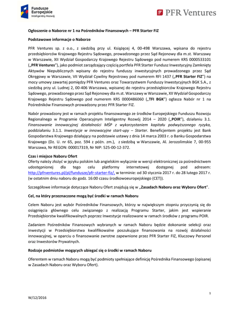 http://pfrventures.pl/pl/fundusze/pfr-starter-fiz/, w terminie: od 30 stycznia 2017 r. do 28 lutego 2017 r.