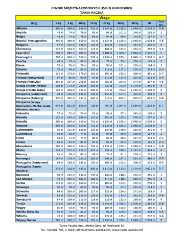 CENNIK MIĘDZYNARODOWYCH USŁUG KURIERSKICH TANIA-PACZKA Waga Kraj Czas dor. 2 kg 5 kg 10 kg 15 kg 25 kg 30 kg 40 kg 50 Albania Austria Belgia Bosnia i Herzegowina Bułgaria Chorwacja Cypr (EU) Czarnogóra Czechy Dania Estonia Finlandia Francja (kontynent) Francja (Korsyka) Grecja (Ateny,Pireus) Grecja (reszta kraju) Hiszpania (kontynent) Hiszpania (Baleary) Hiszpania (Wyspy 290 zł 48 zł 48 zł 290 zł 57 zł 115 zł 188 zł 290 zł 48 zł 52 zł 78 zł 111 zł 67 zł 255 zł 108 zł 145 zł 83 zł 370 zł 369 zł 74 zł 74 zł 369 zł 132 zł 164 zł 285 zł 369 zł 59 zł 76 zł 94 zł 173 zł 85 zł 257 zł 174 zł 204 zł 136 zł 391 zł 559 zł 78 zł 78 zł 559 zł 138 zł 167 zł 489 zł 559 zł 62 zł 78 zł 99 zł 178 zł 90 zł 258 zł 290 zł 321 zł 139 zł 437 zł 752 zł 85 zł 85 zł 752 zł 141 zł 173 zł 694 zł 752 zł 64 zł 87 zł 102 zł 181 zł 97 zł 260 zł 405 zł 440 zł 143 zł 482 zł 1 134 zł 95 zł 94 zł 1 134 zł 152 zł 181 zł 1 104 zł 1 134 zł 71 zł 97 zł 111 zł 190 zł 113 zł 262 zł 637 zł 677 zł 150 zł 616 zł 1 325 zł 101 zł 99 zł 1 325 zł 152 zł 183 zł 1 309 zł 1 325 zł 73 zł 101 zł 117 zł 195 zł 117 zł 264 zł 752 zł 794 zł 167 zł 642 zł 2 048 zł 146 zł 143 zł 2 048 zł 197 zł 234 zł 2 064 zł 2 048 zł 102 zł 150 zł 216 zł 409 zł 201 zł 374 zł 1 179 zł 1 235 zł 265 zł 903 zł 2 508 zł 162 zł 157 zł 2 508 zł 220 zł 262 zł 2 556 zł 2 508 zł 145 zł 164 zł 243 zł 461 zł 222 zł 397 zł 1 456 zł 1 519 zł 288 zł 1 023 zł 5-9 Kanaryjskie, Melilla, Ceuta, Gibraltar, Andora) 649 zł 651 zł 656 zł 729 zł 967 zł 1 094 zł 1 559 zł 1 829 zł 6-7 Holandia Irlandia Islandia Kosowo Lichtenstein Luxemburg Litwa Łotwa Macedonia Malta Niemcy Norwegia Portugalia (kontynent) Portugalia (Azory, Madera) Rumunia San Marino Serbia Słowacja Słowenia Szwecja Szwajcaria Turcja Węgry Wielka Brytania Włochy Wyspy Owcze 52 zł 125 zł 290 zł 290 zł 99 zł 53 zł 64 zł 69 zł 290 zł 153 zł 43 zł 197 zł 69 zł 71 zł 145 zł 369 zł 369 zł 115 zł 69 zł 71 zł 83 zł 369 zł 222 zł 59 zł 278 zł 138 zł 74 zł 146 zł 559 zł 559 zł 120 zł 74 zł 74 zł 85 zł 559 zł 323 zł 62 zł 281 zł 143 zł 81 zł 152 zł 752 zł 752 zł 124 zł 81 zł 80 zł 87 zł 752 zł 437 zł 69 zł 285 zł 150 zł 92 zł 155 zł 1 134 zł 1 134 zł 134 zł 94 zł 85 zł 92 zł 1 134 zł 651 zł 74 zł 293 zł 162 zł 97 zł 185 zł 1 325 zł 1 325 zł 139 zł 99 zł 88 zł 95 zł 1 325 zł 750 zł 81 zł 297 zł 162 zł 145 zł 278 zł 2 048 zł 2 048 zł 265 zł 150 zł 167 zł 159 zł 2 048 zł 1 157 zł 174 zł 355 zł 208 zł 160 zł 297 zł 2 508 zł 2 508 zł 295 zł 167 zł 204 zł 181 zł 2 508 zł 1 414 zł 201 zł 489 zł 223 zł 3 4 5 5 4 2 2-3 2-3 5-9 4 2 4-7 4-5 232 zł 318 zł 449 zł 806 zł 1 113 zł 1 113 zł 2 179 zł 3 021 zł 5-7 83 zł 71 zł 111 zł 50 zł 64 zł 83 zł 87 zł 173 zł 60 zł 59 zł 73 zł 290 zł 131 zł 101 zł 162 zł 78 zł 106 zł 115 zł 108 zł 330 zł 92 zł 74 zł 108 zł 369 zł 134 zł 102 zł 166 zł 83 zł 109 zł 120 zł 113 zł 558 zł 95 zł 81 zł 109 zł 559 zł 139 zł 108 zł 173 zł 90 zł 117 zł 129 zł 118 zł 785 zł 99 zł 85 zł 115 zł 752 zł 148 zł 115 zł 183 zł 97 zł 127 zł 139 zł 129 zł 1 241 zł 104 zł 92 zł 122 zł 1 134 zł 148 zł 118 zł 183 zł 97 zł 134 zł 143 zł 132 zł 1 468 zł 108 zł 109 zł 125 zł 1 325 zł 192 zł 202 zł 239 zł 131 zł 171 zł 262 zł 258 zł 2 309 zł 138 zł 188 zł 211 zł 2 048 zł 215 zł 216 zł 258 zł 153 zł 183 zł 293 zł 288 zł 2 855 zł 180 zł 208 zł 232 zł 2 508 zł 3 4 7 2 3 4-6 4 5-6 2 3-5 3-4 9 Tania-Paczka.net, Jelenia Góra, ul. Wolności 50 Tel. 730 081 703, e-mail: [email protected], www.tania-paczka.net 2 3 4-6 4 3-4 5 4-7 2 3 2-3 5-7 3-4 4-5 4 5 4 5-6