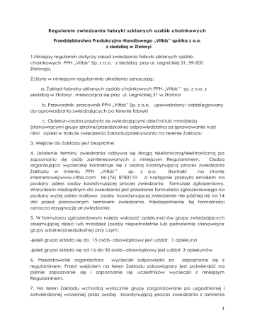 Regulamin zwiedzania fabryki szklanych ozdób choinkowych Przedsiębiorstwa Produkcyjno-Handlowego „Vitbis’’ spółka z o.o. z siedzibą w Złotoryi 1.Niniejszy regulamin dotyczy zasad zwiedzania fabryki szklanych ozdób choinkowych PPH „Vitbis” Sp. z o.o. z siedzibą przy ul. Legnickiej 31, 59-500 Złotoryja. 2.Użyte w niniejszym regulaminie określenia oznaczają: a. Zakład-fabryka szklanych ozdób choinkowych PPH „Vitbis’’ sp. z o.o. z siedzibą w Złotoryi , mieszcząca się przy ul. Legnickiej 31 w Złotoryi b. Przewodnik- pracownik PPH „Vitbis” Sp. z o.o. upoważniony i oddelegowany do oprowadzania zwiedzających po terenie fabryki c. Opiekun-osoba przybyła ze zwiedzającymi dziećmi lub młodzieżą (stanowiącymi grupy szkolne/przedszkolne) odpowiedzialna za sprawowanie nad nimi opieki w trakcie zwiedzenia Zakładu/przebywania na terenie Zakładu 3. Wejście do Zakładu jest bezpłatne. 4. Ustalenie terminu zwiedzania odbywa się drogą telefoniczną/elektroniczną po zapoznaniu się osób zainteresowanych z niniejszym Regulaminem. Osoba organizująca wycieczkę kontaktuje się z osobą koordynującą proces zwiedzania Zakładu w imieniu PPH „Vitbis’’ sp. z o.o. (kontakt na stronie internetowej:www.vitbis.com tel.(76) 8783110 a następnie przesyła emailem na podany adres osoby koordynującej proces zwiedzania formularz zgłoszeniowy. Warunkiem niezbędnym do zwiedzenia jest przesłanie formularza zgłoszeniowego na podany wyżej adres mailowy osoby koordynującej zwiedzenie nie później niż na 14 dni przed planowanym terminem zwiedzania. Niedopełnienie tej formalności oznacza rezygnację ze zwiedzania. 5. W formularzu zgłoszeniowym należy wskazać opiekuna/-ów grupy zwiedzających obejmującej dzieci lub młodzież (osoby niepełnoletnie lub pełnoletnie stanowiące grupy szkolne/przedszkolne) przy czym: -jeżeli grupa składa się do 15 osób- obowiązkowy jest udział 1 opiekuna -jeżeli grupa składa się od 16 do 50 osób- obowiązkowy jest udział 3 opiekunów 6. Przedstawiciel organizatora wycieczki odpowiada za zapoznanie się z regulaminem. Przed wejściem na teren Zakładu zobowiązany jest potwierdzić na piśmie zapoznanie się i zapoznanie się uczestników wycieczki z niniejszym Regulaminem. 7. Na teren Zakładu wchodzą wyłącznie grupy zorganizowane po uzgodnionej i zatwierdzonej wcześniej przez osobę koordynującą proces zwiedzania z ramienia 1 PPH „Vitbis” Sp. z o.o rezerwacji oraz uzgodnionej/zatwierdzonej liczbie osób. Grupa zwiedzająca nie może liczyć mniej niż 5 osób i więcej niż 50 osób (wliczając w to opiekunów). 8. Ze względu na to, iż w trakcie zwiedzania fabryki chcemy by osoby zwiedzające zobaczyły oraz dowiedziały się od Przewodnika jak najwięcej na temat produkcji oraz tworzenia ozdób choinkowych, grupy powyżej 30 osób będą dzielone na mniejsze. 9.Istnieje możliwość wzięcia udziału w odpłatnych warsztatach malowania bombek po wcześniejszej rezerwacji dokonanej na warunkach określonych w/na stronie internetowej www.vitbis.com w zakładce wycieczki. 10. Każdej grupie zostaje przydzielony Przewodnik, który oprowadzając przez wszystkie działy produkcyjne, opowiada oraz pokazuje poszczególne etapy tworzenia szklanych ozdób choinkowych. 11. Zwiedzanie odbywa się wyłącznie po wyznaczonej trasie, w obecności Przewodnika. Przewodnik ma prawo odmówić oprowadzenia osób, w stosunku do których istnieje podejrzenie, że są pod wpływem alkoholu lub środków odurzających. Przewodnik ma prawo przerwania zwiedzania w przypadkach rażącego łamania zasad bezpieczeństwa i zasad Regulaminu. 12. Osoby małoletnie wchodzą na Zakład wyłącznie w towarzystwie Opiekuna, przedstawiciela ustawowego/opiekuna prawnego. 13. Zwiedzanie fabryki odbywa się w godzinach pracy Zakładu, dlatego też wymaga się od zwiedzających: a. zachowania wszelkiej ostrożności na terenie Zakładu, b. stosowanie się do poleceń Przewodnika, c. stosowanie się do wszelkich oznaczeń na terenie Zakładu, d. zachowanie odpowiedniej odległości od pracujących urządzeń, e. niezakłócania procesu produkcji 14. Zwiedzający mają obowiązek stosowania się do zasad Regulaminu oraz ogólnych, powszechnych zasad bezpieczeństwa. Podczas zwiedzania obowiązuje trzymanie się w zwartej , zdyscyplinowanej grupie oraz zakaz hałasowania i zakłócenia porządku panującego na terenie firmy. 15. Zwiedzający nie wnoszą na teren zakładu żadnych niezbędnych toreb, plecaków oraz innych zbędnych rzeczy-przedmioty te należy pozostawić przed wejściem na teren Zakładu ( np. w samochodzie, autokarze). Zabrania się wnoszenia na teren Zakładu niebezpiecznych przedmiotów oraz chemikaliów. 2 16. Na terenie zakładu obowiązuję zakaz palenia papierosów , spożywania posiłków oraz napojów. 17. W przypadku, gdy zwiedzającymi są osoby niepełnosprawne organizator wyjazdu powinien zadbać o odpowiednią ilość opiekunów dla swojej grupy w taki sposób by zwiedzanie oraz pobyt w Zakładzie był dla zwiedzających komfortowy oraz bezpieczny. 18. Wszelkie objawy chorobowe w trakcie pobytu w fabryce powinny być niezwłocznie zgłoszone Przewodnikowi. 19. PPH „Vitbis” spółka z o.o. nie ponosi żadnej odpowiedzialności prawnej z tytułu jakichkolwiek opłat uiszczanych przez osoby zwiedzające biurom podróży oraz biurom turystycznym. 20. Na terenie zakładu obowiązuje zakaz rejestrowania obrazu i dźwięku, w szczególności przy użyciu aparatów fotograficznych, kamer video, dyktafonów, telefonów komórkowych oraz innych sprzętów elektronicznych, za wyjątkiem sytuacji gdy Przewodnik wyraźnie zezwoli na korzystanie z ww. urządzeń. 21. PPH „Vitbis” Sp. z o.o. nie ponosi odpowiedzialności za: -wszelkie przedmioty pozostawione przez zwiedzających na terenie Zakładu , w tym również za przedmioty wartościowe -szkody poniesione przez zwiedzających w wyniku Regulaminu i powszechnych z