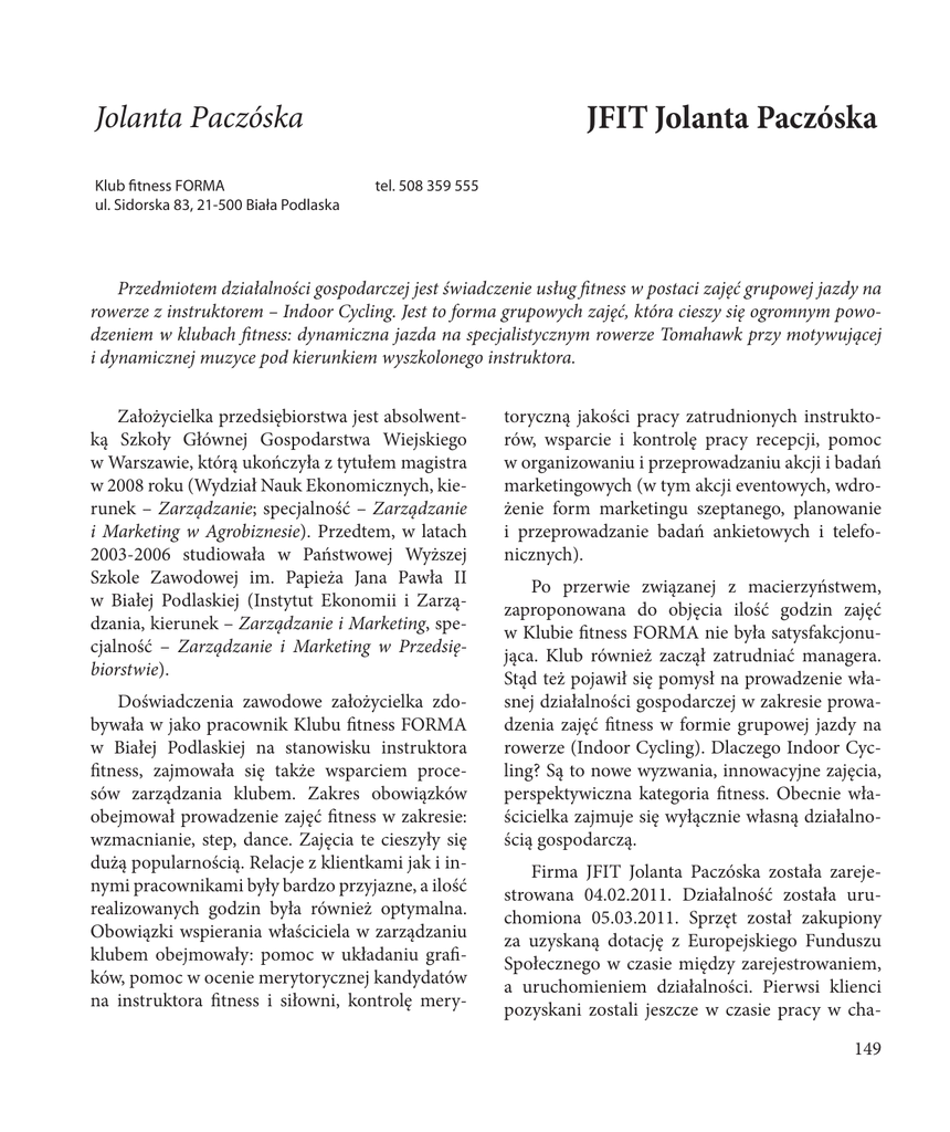 JFIT Jolanta Paczóska Jolanta Paczóska Klub fitness FORMA ul. Sidorska 83, 21-500 Biała Podlaska tel. 508 359 555 Przedmiotem działalności gospodarczej jest świadczenie usług fitness w postaci zajęć grupowej jazdy na rowerze z instruktorem – Indoor Cycling. Jest to forma grupowych zajęć, która cieszy się ogromnym powodzeniem w klubach fitness: dynamiczna jazda na specjalistycznym rowerze Tomahawk przy motywującej i dynamicznej muzyce pod kierunkiem wyszkolonego instruktora. Założycielka przedsiębiorstwa jest absolwentką Szkoły Głównej Gospodarstwa Wiejskiego w Warszawie, którą ukończyła z tytułem magistra w 2008 roku (Wydział Nauk Ekonomicznych, kierunek – Zarządzanie; specjalność – Zarządzanie i Marketing w Agrobiznesie). Przedtem, w latach 2003-2006 studiowała w Państwowej Wyższej Szkole Zawodowej im. Papieża Jana Pawła II w Białej Podlaskiej (Instytut Ekonomii i Zarządzania, kierunek – Zarządzanie i Marketing, specjalność – Zarządzanie i Marketing w Przedsiębiorstwie). Doświadczenia zawodowe założycielka zdobywała w jako pracownik Klubu fitness FORMA w Białej Podlaskiej na stanowisku instruktora fitness, zajmowała się także wsparciem procesów zarządzania klubem. Zakres obowiązków obejmował prowadzenie zajęć fitness w zakresie: wzmacnianie, step, dance. Zajęcia te cieszyły się dużą popularnością. Relacje z klientkami jak i innymi pracownikami były bardzo przyjazne, a ilość realizowanych godzin była również optymalna. Obowiązki wspierania właściciela w zarządzaniu klubem obejmowały: pomoc w układaniu grafików, pomoc w ocenie merytorycznej kandydatów na instruktora fitness i siłowni, kontrolę mery- toryczną jakości pracy zatrudnionych instruktorów, wsparcie i kontrolę pracy recepcji, pomoc w organizowaniu i przeprowadzaniu akcji i badań marketingowych (w tym akcji eventowych, wdrożenie form marketingu szeptanego, planowanie i przeprowadzanie badań ankietowych i telefonicznych). Po przerwie związanej z macierzyństwem, zaproponowana do objęcia ilość godzin zajęć w Klubie fitness FORMA nie była satysfakcjonująca. Klub również zaczął zatrudniać managera. Stąd też pojawił się pomysł na prowadzenie własnej działalności gospodarczej w zakresie prowadzenia zajęć fitness w formie grupowej jazdy na rowerze (Indoor Cycling). Dlaczego Indoor Cycling? Są to nowe wyzwania, innowacyjne zajęcia, perspektywiczna kategoria fitness. Obecnie właścicielka zajmuje się wyłącznie własną działalnością gospodarczą. Firma JFIT Jolanta Paczóska została zarejestrowana 04.02.2011. Działalność została uruchomiona 05.03.2011. Sprzęt został zakupiony za uzyskaną dotację z Europejskiego Funduszu Społecznego w czasie między zarejestrowaniem, a uruchomieniem działalności. Pierwsi klienci pozyskani zostali jeszcze w czasie pracy w cha149 Jolanta Paczóska rakterze instruktora fitness. Pomocne w pozyskaniu pierwszych klientów były osobiste predyspozycje właścicielki: obowiązkowość i pracowitość z pozytywnym nastawieniem do innych ludzi oraz swoich obowiązków. Ważne są również inne jej cechy: ambicja, zdolność pracy w zespole i kierowania zespołem, rzetelność wykonywanej pracy, komunikatywność, łatwość nawiązywania kontaktów. Właścicielka zdobywa nowe kwalifikacje oraz aktywnie uczestniczy w licznych konwencjach fitness. Uzyskała stopień instruktora Rekreacji Ruchowej fitness – nowoczesne formy gimnastyki oraz brała udział w szkolenie „Sculpt” (wzmacnianie) – Masters Edukacja w fitnessie. 150 JFIT Jolanta Paczóska Zdobyte doświadczenia zawodowe i związane z otwarciem i prowadzeniem własnej działalności gospodarczej założycielka firmy JFIT Jolanta Paczóska charakteryzuje następująco: „Wydaje mi się, że najbardziej istotną rzeczą jest konsekwencja oraz dbałość o szczegóły w realizacji założonych w biznes planie celów. Przekonanie to jest bardziej intuicyjne, niż wynikające z doświadczenia, jednak już teraz widzę, że nawet jeśli nie udaje się zrobić czegoś jak założyłam, potrzebna jest chwila refleksji, ewentualnie korekty założeń i dalsza praca nakierowana na ostateczny sukces. W usługach uważam za najważniejsze dbałość o jakość świadczonej usługi oraz umiejętność komunikacji z odbiorcami moich usług językiem korzyści”.