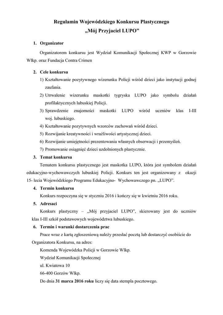 Regulamin Wojewódzkiego Konkursu Plastycznego „Mój Przyjaciel LUPO” 1. Organizator Organizatorem konkursu jest Wydział Komunikacji Społecznej KWP w Gorzowie Wlkp. oraz Fundacja Contra Crimen 2. Cele konkursu 1) Kształtowanie pozytywnego wizerunku Policji wśród dzieci jako instytucji godnej zaufania. 2) Utrwalenie wizerunku maskotki tygryska LUPO jako symbolu działań profilaktycznych lubuskiej Policji. 3) Sprawdzenie znajomości maskotki LUPO wśród uczniów klas I-III woj. lubuskiego. 4) Kształtowanie pozytywnych wzorców zachowań wśród dzieci. 5) Rozwijanie kreatywności i wrażliwości artystycznej dzieci. 6) Rozwijanie umiejętności prezentowania własnych obserwacji i przemyśleń. 7) Promowanie osiągnięć dzieci uzdolnionych plastycznie. 3. Temat konkursu Tematem konkursu plastycznego jest maskotka LUPO, która jest symbolem działań edukacyjno-wychowawczych lubuskiej Policji. Konkurs ten jest organizowany z okazji 15- lecia Wojewódzkiego Programu Edukacyjno- Wychowawczego pn. „LUPO”. 4. Termin konkursu Konkurs rozpoczyna się w styczniu 2016 i kończy się w kwietniu 2016 roku. 5. Adresaci Konkurs plastyczny – „Mój przyjaciel LUPO”, skierowany jest do uczniów klas I-III szkół podstawowych województwa lubuskiego. 6. Termin i warunki dostarczenia prac Prace wraz z kartą zgłoszeniową należy przesłać pocztą lub dostarczyć osobiście do Organizatora Konkursu, na adres: Komenda Wojewódzka Policji w Gorzowie Wlkp. Wydział Komunikacji Społecznej ul. Kwiatowa 10 66-400 Gorzów Wlkp. Do dnia 31 marca 2016 roku liczy się data stempla pocztowego. 7. Ogólne założenia 1. Prace konkursowe należy wykonać na papierze dowolną techniką plastyczną (rysunek, malunek, grafika, collage) itp. 2. Format pracy plastycznej A3. 3. Zadaniem konkursowym jest stworzenie pracy plastycznej przedstawiającej maskotkę LUPO. 4. Autor może nadesłać jedną pracę plastyczną. 5. Pracę należy podpisać czytelnie z tyłu podając imię, nazwisko, klasę, miejscowość oraz nazwę szkoły. 6. Do prac należy dołączyć kartę uczestnictwa (załącznik nr 1), którą powinien podpisać rodzic lub osoba uprawniona do reprezentowania dziecka. 8. Kryteria oceny Komisja przy ocenie prac weźmie pod uwagę: 1) zgodność tematu pracy z tematem konkursu, 2) wartość estetyczną i techniczną wykonania pracy, 3) oryginalność podejścia do tematu. 9. Skład Komisji Konkursowej Przewodniczący: Naczelnik Wydziału Komunikacji Społecznej KWP w Gorzowie Wlkp. Członkowie Komisji – przedstawiciele 1) Wydziału Prewencji KWP w Gorzowie Wlkp., 2) Fundacji Contra Crimen, 3) Lubuskiego Urzędu Wojewódzkiego, 4) Kuratorium Oświaty w Gorzowie Wlkp., 5) Wojewódzkiego Ośrodka Metodycznego w Gorzowie Wlkp., 6) ICT Poland. 10. Rozstrzygnięcie konkursu Komisja Konkursowa wybierze najciekawsze prace ilustrujące temat przewodni „Mój przyjaciel LUPO”. Spośród nich wybrane zostaną trzy najlepsze prace oraz trzy wyróżnienia. 11. Uwagi dodatkowe 1) Przystąpienie do konkursu jest jednoznaczne z wyrażeniem zgody na przetwarzanie danych osobowych uczestników na potrzeby konkursu, w tym publikowania wyników na stronie internetowej lubuskiej Policji. 2) Organizatorzy konkursu nabywają nieodpłatnie prawa autorskie do zgłoszonych prac w rozumieniu ustawy z dnia 4 lutego 1994 r. o prawie autorskim i prawach pokrewnych ( Dz. U. z 2006 r. Nr 90, poz. 631, z późn. zm.) na wszystkich polach eksploatacji. 3) Prace niezgodne z regulaminem nie będą brane pod uwagę. 4) Rozstrzygnięcie Komisji Konkursowej jest ostateczne (od werdyktu nie przysługuje odwołanie). 5) Osoby nagrodzone i wyróżnione zostaną powiadomione osobiście o miejscu i godzinie uroczystego rozdania nagród. 6) Wszelkie sprawy nie uwzględnione w regulaminie rozstrzyga Organizator. 12. Kontakt Osoba do kontaktu – w przypadku pytań odnośnie konkursu: Patrycja Taler-Ślusarczyk, tel. 957381414 e-mail [email protected] Przygotowała: Patrycja Taler - Ślusarczyk …………………………………………….. Załącznik nr 1 Karta uczestnika w Wojewódzkim Konkursie Plastycznym „Mój przyjaciel LUPO” DANE SZKOŁY Nazwa Adres telefon fax email Imię i nazwisko dyrektora szkoły Imię i nazwisko opiekuna artystycznego DANE AUTORA PRACY Imię i nazwisko Klasa Tytuł pracy ............................................................... Data i podpis Dyrektora szkoły pieczęć szkoły Akceptuję/-my określone w regulaminie warunki udziału w konkursie: …………………………………… Podpis rodzica (prawnego opiekuna) autora pracy lub autora pełnoletniego pracy