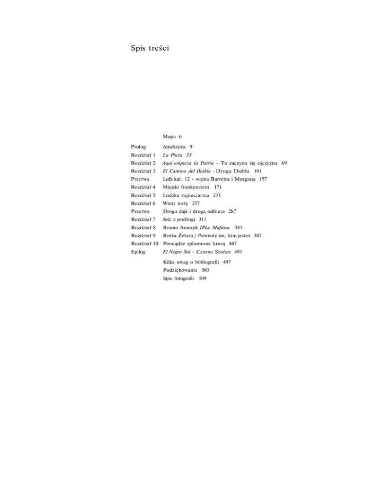 Spis treści Mapa 6 Prolog Ameksyka 9 Rozdział 1 La Plaża 33 Rozdział 2 Aąui empieza la Patria - Tu zaczyna się ojczyzna 69 Rozdział 3 El Camino del Diablo -Droga Diabła 101 Przerwa Lufa kal. 12 - wojna Barretta i Morgana 157 Rozdział 4 Miejski frankenstein 171 Rozdział 5 Ludzka rupieciarnia 231 Rozdział 6 Wiatr noży 257 Przerwa Droga daje i droga odbiera 287 Rozdział 7 Jeść z podłogi 311 Rozdział 8 Brama Ameryk IPax Mafiosa 343 Rozdział 9 Rzeka Żelaza / Powiedz im, kim jesteś 387 Rozdział 10 Pieniądze splamione krwią 467 Epilog El Negro Sol - Czarne Słońce 491 Kilka uwag o bibliografii 497 Podziękowania 503 Spis fotografii 509