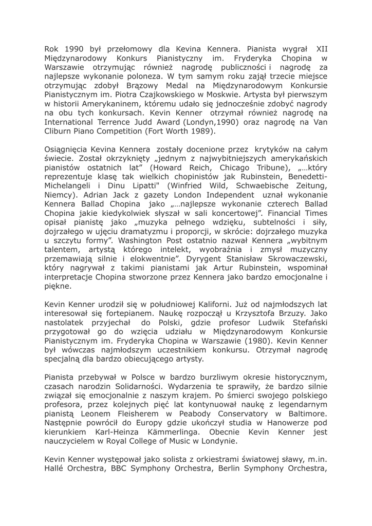 Rok 1990 był przełomowy dla Kevina Kennera. Pianista wygrał XII Międzynarodowy Konkurs Pianistyczny im. Fryderyka Chopina w Warszawie otrzymując również nagrodę publiczności i nagrodę za najlepsze wykonanie poloneza. W tym samym roku zajął trzecie miejsce otrzymując zdobył Brązowy Medal na Międzynarodowym Konkursie Pianistycznym im. Piotra Czajkowskiego w Moskwie. Artysta był pierwszym w historii Amerykaninem, któremu udało się jednocześnie zdobyć nagrody na obu tych konkursach. Kevin Kenner otrzymał również nagrodę na International Terrence Judd Award (Londyn,1990) oraz nagrodę na Van Cliburn Piano Competition (Fort Worth 1989). Osiągnięcia Kevina Kennera zostały docenione przez krytyków na całym świecie. Został okrzyknięty „jednym z najwybitniejszych amerykańskich pianistów ostatnich lat” (Howard Reich, Chicago Tribune), „…który reprezentuje klasę tak wielkich chopinistów jak Rubinstein, BenedettiMichelangeli i Dinu Lipatti" (Winfried Wild, Schwaebische Zeitung, Niemcy). Adrian Jack z gazety London Independent uznał wykonanie Kennera Ballad Chopina jako „…najlepsze wykonanie czterech Ballad Chopina jakie kiedykolwiek słyszał w sali koncertowej”. Financial Times opisał pianistę jako „muzyka pełnego wdzięku, subtelności i siły, dojrzałego w ujęciu dramatyzmu i proporcji, w skrócie: dojrzałego muzyka u szczytu formy”. Washington Post ostatnio nazwał Kennera „wybitnym talentem, artystą którego intelekt, wyobraźnia i zmysł muzyczny przemawiają silnie i elokwentnie”. Dyrygent Stanisław Skrowaczewski, który nagrywał z takimi pianistami jak Artur Rubinstein, wspominał interpretacje Chopina stworzone przez Kennera jako bardzo emocjonalne i piękne. Kevin Kenner urodził się w południowej Kaliforni. Już od najmłodszych lat interesował się fortepianem. Naukę rozpoczął u Krzysztofa Brzuzy. Jako nastolatek przyjechał do Polski, gdzie profesor Ludwik Stefański przygotował go do wzięcia udziału w Międzynarodowym Konkursie Pianistycznym im. Fryderyka Chopina w Warszawie (1980). Kevin Kenner był wówczas najmłodszym uczestnikiem konkursu. Otrzymał nagrodę specjalną dla bardzo obiecującego artysty. Pianista przebywał w Polsce w bardzo burzliwym okresie historycznym, czasach narodzin Solidarności. Wydarzenia te sprawiły, że bardzo silnie związał się emocjonalnie z naszym krajem. Po śmierci swojego polskiego profesora, przez kolejnych pięć lat kontynuował naukę z legendarnym pianistą Leonem Fleisherem w Peabody Conservatory w Baltimore. Następnie powrócił do Europy gdzie ukończył studia w Hanowerze pod kierunkiem Karl-Heinza Kämmerlinga. Obecnie Kevin Kenner jest nauczycielem w Royal College of Music w Londynie. Kevin Kenner występował jako solista z orkiestrami światowej sławy, m.in. Hallé Orchestra, BBC Symphony Orchestra, Berlin Symphony Orchestra, Orkiestrą Symfoniczną Filharmonii Narodowej, Czech Philharmonic, Belgian Radio and Television Philharmonic, NHK Symphony of Japan, oraz z najlepszymi orkiestrami amerykańskimi z San Francisco, San Diego, Salt Lake City, Kansas City, New Jersey, Rochester, Baltimore, St. Paul i innymi. Pianista pracował z wybitnymi dyrygentami, takimi jak Sir Charles Groves, Andrew Davis, Hans Vonk, Stanislaw Skrowaczewski, Jerzy Maksymiuk, Kazimierz Kord, Jiri Belohlavek, Antoni Wit. Artysta gra również muzykę kameralną i występował z takimi kwartetami jak Belcea, Tokyo, Endellion, Vogler i Panocha. Koncertował również i nagrywał z grupą Piazzoforte, wykonując specjalne aranżacje utworów Astora Piazzolli, Chopina i Bacha. Pianista jest twórcą i dyrektorem artystycznym zespołu Ensemble XIX, wykonującym muzykę Chopina na dziewiętnastowiecznych instrumentach. Kevin Kenner zasiada w jury w prestiżowych konkursach w Azji, Europie i Stanach Zjednoczonych. W roku 2010 artysta był jurorem na XVI Międzynarodowym Konkursie Pianistycznym im. Fryderyka Chopina w Warszawie. Płyty z nagraniami Kevina Kennera zawierają utwory Chopina, Ravela, Schumanna, Beethovena i Piazzolli. Za wykonanie tych ostatnich otrzymał w Polsce nagrodę Fryderyka w kategorii muzyki kameralnej. Artysta nagrał utwory Chopina na Pleyelu z 1848 roku (seria NiFC 2008). Nagranie to zostało ocenione przez francuski magazyn Diapason jako znakomite.
