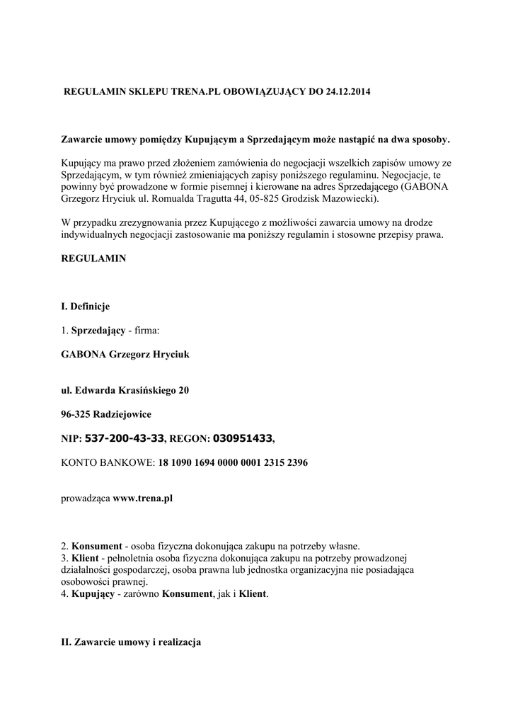REGULAMIN SKLEPU TRENA.PL OBOWIĄZUJĄCY DO 24.12.2014 Zawarcie umowy pomiędzy Kupującym a Sprzedającym może nastąpić na dwa sposoby. Kupujący ma prawo przed złożeniem zamówienia do negocjacji wszelkich zapisów umowy ze Sprzedającym, w tym również zmieniających zapisy poniższego regulaminu. Negocjacje, te powinny być prowadzone w formie pisemnej i kierowane na adres Sprzedającego (GABONA Grzegorz Hryciuk ul. Romualda Tragutta 44, 05-825 Grodzisk Mazowiecki). W przypadku zrezygnowania przez Kupującego z możliwości zawarcia umowy na drodze indywidualnych negocjacji zastosowanie ma poniższy regulamin i stosowne przepisy prawa. REGULAMIN I. Definicje 1. Sprzedający - firma: GABONA Grzegorz Hryciuk ul. Edwarda Krasińskiego 20 96-325 Radziejowice NIP: 537-200-43-33, REGON: 030951433, KONTO BANKOWE: 18 1090 1694 0000 0001 2315 2396 prowadząca www.trena.pl 2. Konsument - osoba fizyczna dokonująca zakupu na potrzeby własne. 3. Klient - pełnoletnia osoba fizyczna dokonująca zakupu na potrzeby prowadzonej działalności gospodarczej, osoba prawna lub jednostka organizacyjna nie posiadająca osobowości prawnej. 4. Kupujący - zarówno Konsument, jak i Klient. II. Zawarcie umowy i realizacja 5. Zamówienia można składać 24 godziny na dobę. 6. Wszystkie ceny podawane przez Sprzedającego wyrażone są w polskiej walucie i są cenami brutto (zawierają podatek VAT). Ceny towarów nie zawierają kosztu dostawy, który określony jest w cenniku dostaw. 7. Zawarcie umowy z Konsumentem następuje z chwilą złożenia zamówienia. 8. Zamówienie Konsumenta płatne za pobraniem realizowane jest niezwłocznie, maksymalnie do dwóch dni roboczych. Zamówienia płatne przelewem lub za pośrednictwem systemu płatności elektronicznych realizowane są do dwóch dni roboczych po zaksięgowaniu wpłaty Konsumenta na koncie Sprzedającego. Status zamówienia „zrealizowane” oznacza przekazanie przesyłki kurierowi. 9. Zawarcie umowy z Klientem następuje z chwilą przyjęcia zamówienia przez Sprzedającego, o czym informuje on Klienta w terminie do 48 godzin od złożenia zamówienia. 10. Realizacja zamówienia Klienta następuje w terminie podanym w opisie produktu, a w przypadku zamówień składających się z wielu produktów w najdłuższym terminie spośród terminów podanych na kartach wszystkich produktów. 11. Realizacja zamówienia Klienta może być uzależniona od dokonania wpłaty całości lub części wartości zamówienia lub uzyskania limitu kredytu kupieckiego co najmniej wartości zamówienia lub zgody Sprzedającego na wysłanie zamówienia za obraniem (płatnego przy odbiorze). 12. Zakupiony towar wraz z wybranym przez Kupującego dokumentem sprzedaży jest wysyłany wybranym przez Kupującego przewoźnikiem na podany przez Kupującego w formularzu zamówienia adres. III. Odpowiedzialność Sprzedającego 13. Sprzedający ponosi wobec Konsumenta odpowiedzialność przez dwa lata od daty zakupu w przypadku niezgodności towaru z umową zgodnie z art. 10 Ustawy o szczególnych warunkach sprzedaży konsumenckiej z 27 lipca 2002 roku i pozostałymi stosownymi przepisami prawa. 14. W przypadku niezgodności towaru z umową, pismo określające niezgodność oraz oczekiwania dotyczące sposobu realizacji zobowiązania, Konsument powinien przesłać na adres Sprzedającego. 15. W okresie 14 dni od odebrania zamówionego towaru, Konsument ma prawo do odstąpienia od umowy bez podania przyczyn, według ogólnych zasad wynikających z przepisów dotyczących zawierania umów na odległość. 16. Zgodnie z art. 10 pkt. 3 Ustawy z dnia 2 marca 2000 r. o ochronie niektórych praw konsumentów oraz o odpowiedzialności za szkodę wyrządzoną przez produkt niebezpieczny (Dz. U. z dnia 31 marca 2000 r.) zwrotowi przez Konsumenta nie podlegają produkty: a. o właściwościach określonych przez Konsumenta w złożonym przez niego zamówieniu lub ściśle związanych z jego osobą; b. audialne i wizualne oraz zapisane na informatycznych nośnikach danych po usunięciu przez konsumenta ich oryginalnego opakowania. 17. Sprzedający ponosi odpowiedzialność wobec Klienta wyłącznie na zasadach rękojmi. 18. Sprzedający zobowiązuje się do ochrony danych osobowych zgodnie z ustawą o ochronie danych osobowych z 29.08.1997 r (Dz. U. Nr 133, poz. 883) oraz Ustawą o świadczeniu usług drogą elektroniczną (Dz. U. Nr 133, poz. 1204). Kupujący podając przy składaniu zamówienia swoje dane osobowe Sprzedającemu wyraża zgodę na ich przetwarzanie przez Sprzedającego w celu realizacji złożonego zamówienia. Kupujący ma w każdej chwili możliwość wglądu, poprawiania, aktualizacji oraz usuwania swoich danych osobowych. IV. Postanowienia końcowe 19. Żadne z postanowień niniejszego regulaminu nie ma na celu naruszenia praw Kupującego. Nie może być również w ten sposób interpretowane, gdyż w przypadku niezgodności jakiejkolwiek części regulaminu z obowiązującym prawem Sprzedający deklaruje bezwzględne podporządkowanie się i stosowanie tego prawa w miejsce zakwestionowanego przepisu regulaminu. 20. O zmianach regulaminu i ich zakresie zarejestrowani Kupujący będą powiadomieni drogą elektroniczną (na wskazany przy rejestracji lub zamówieniu e-mail). Powiadomienie zostanie wysłane co najmniej na 30 dni przed wejściem w życie nowego regulaminu. Zmiany wprowadzane będą w celu dostosowania regulaminu do obowiązującego stanu prawnego. 21. Aktualna wersja regulaminu jest zawsze dostępna dla Kupującego w zakładce regulamin (http://trena.pl/content/3-regulamin-sklepu). W trakcie realizacji zamówienia oraz w całym okresie opieki posprzedażowej Kupującego obowiązuje regulamin zaakceptowany przez niego przy składaniu zamówienia. Za wyjątkiem sytuacji, kiedy Konsument uzna go za mniej korzystny od aktualnego i poinformuje Sprzedającego o wyborze aktualnego jako obowiązującego. 22. Sprzedający zapewnia Kupującemu poprawność działania