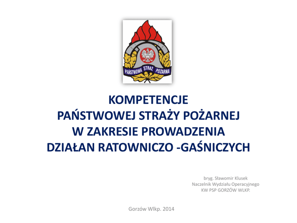 KOMPETENCJE PAŃSTWOWEJ STRAŻY POŻARNEJ W ZAKRESIE PROWADZENIA DZIAŁAN RATOWNICZO -GAŚNICZYCH bryg. Sławomir Klusek Naczelnik Wydziału Operacyjnego KW PSP GORZÓW WLKP. Gorzów Wlkp. 2014 akty prawne • Ustawa z dnia 24 sierpnia 1991r. o ochronie przeciwpożarowej • Ustawa z dnia 24 sierpnie 1991r. o Państwowej Straży Pożarnej • Rozporządzanie MSWiA z dnia 18 lutego 2011 r. w sprawie szczegółowych zasad organizacji krajowego systemu ratowniczogaśniczego • Rozporządzenie Rady Ministrów z dnia 4 lipca 1992 r. w sprawie zakresu i trybu korzystania z praw przez kierującego działaniem ratowniczym • Zasady postępowania jednostek ochrony przeciwpożarowej w związku ze zdarzeniami na drogach zatwierdzone przez KG PSP w Warszawie Ustawa z dnia 24 sierpnia 1991r. o ochronie przeciwpożarowej Art. 1. Ochrona przeciwpożarowa polega na realizacji przedsięwzięć mających na celu ochronę życia, zdrowia, mienia lub środowiska przed pożarem, klęską żywiołową lub innym miejscowym zagrożeniem poprzez: 1) zapobieganie powstawaniu i rozprzestrzenianiu się pożaru, klęski żywiołowej lub innego miejscowego zagrożenia; 2) zapewnienie sił i środków do zwalczania pożaru, klęski żywiołowej lub innego miejscowego zagrożenia; 3) prowadzenie działań ratowniczych. Ustawa z dnia 24 sierpnia 1991r. o ochronie przeciwpożarowej Art. 14. 1. Krajowy system ratowniczo-gaśniczy ma na celu ochronę życia, zdrowia, mienia lub środowiska poprzez: 1) walkę z pożarami lub innymi klęskami żywiołowymi; 2) ratownictwo techniczne; 3) ratownictwo chemiczne; 4) ratownictwo ekologiczne; 5) ratownictwo medyczne; 6) współpracę z jednostkami systemu Państwowego Ratownictwa Medycznego, o których mowa w art. 32 ust. 1 ustawy z dnia 8 września 2006 r. o Państwowym Ratownictwie Medycznym (Dz. U. Nr 191, poz. 1410, z późn. zm.1)) oraz systemem powiadamiania ratunkowego. Ustawa z dnia 24 sierpnia 1991r. o ochronie przeciwpożarowej Art. 14. 2. Minister właściwy do spraw wewnętrznych określi, w drodze rozporządzenia, szczegółowe zasady organizacji krajowego systemu ratowniczo-gaśniczego, w szczególności w zakresie: 1) organizacji na obszarze powiatu, województwa i kraju; 2) walki z pożarami i innymi klęskami żywiołowymi; 3) ratownictwa technicznego, chemicznego, ekologicznego i medycznego; 4) dysponowania do działań ratowniczych; 5) kierowania działaniem ratowniczym; 6) prowadzenia dokumentacji zdarzeń określonych w art. 2 pkt 2 oraz dokumentacji funkcjonowania krajowego systemu ratowniczo-gaśniczego; 7) organizacji odwodów operacyjnych; 8) organizacji stanowisk kierowania. Ustawa z dnia 24 sierpnia 1991 r. o Państwowej Straży Pożarnej 1. Powołuje się Państwową Straż Pożarną jako zawodową, umundurowaną i wyposażoną w specjalistyczny sprzęt formację, przeznaczoną do walki z pożarami, klęskami żywiołowymi i innymi miejscowymi zagrożeniami. 2. Do podstawowych zadań Państwowej Straży Pożarnej należy: 1) rozpoznawanie zagrożeń pożarowych i innych miejscowych zagrożeń; 2) organizowanie i prowadzenie akcji ratowniczych w czasie pożarów, klęsk żywiołowych lub likwidacji miejscowych zagrożeń; 3) wykonywanie pomocniczych specjalistycznych czynności ratowniczych w czasie klęsk żywiołowych lub likwidacji miejscowych zagrożeń przez inne służby ratownicze; ROZPORZĄDZENIE MINISTRA SPRAW WEWNĘTRZNYCH I ADMINISTRACJI z dnia 18 lutego 2011 r. w sprawie szczegółowych zasad organizacji KSRG § 16. 1. KSRG w zakresie ratownictwa chemicznego i ekologicznego obejmuje planowanie, organizowanie i realizację działań ratowniczych niezbędnych do zmniejszenia lub likwidacji bezpośrednich zagrożeń stwarzanych przez substancje niebezpieczne dla ludzi, zwierząt, środowiska lub mienia. 2. Działania ratownicze, o których mowa w ust. 1, obejmują w szczególności: 1) 2) rozpoznanie i identyfikację zagrożenia; zabezpieczenie strefy działań ratowniczych, w tym wyznaczenie i oznakowanie strefy zagrożenia; ................ 5) ocenę rozmiarów zagrożenia i prognozowanie jego rozwoju; 6) likwidację, ograniczenie lub zwiększenie strefy zagrożenia; 7) dostosowanie sprzętu i technik ratowniczych do miejsca zdarzenia i rodzaju substancji niebezpiecznej w celu ograniczenia skutków wycieku, parowania lub emisji substancji niebezpiecznej; 8) stawianie zapór na zbiornikach, ciekach lub akwenach zagrożonych skutkami rozlania substancji niebezpiecznych; 9) związywanie lub neutralizacja substancji niebezpiecznych; 10) zabezpieczenie terenu objętego wyciekiem substancji niebezpiecznej; 11) prowadzenie czynności z zakresu dekontaminacji wstępnej; 12) ocenę rozmiarów powstałego zdarzenia. Rozporządzenie Rady Ministrów z dnia 4 lipca 1992r. w sprawie zakresu i trybu korzystania z praw kierującego działaniem ratowniczym § 2.1. Kierujący działaniem ratowniczym jest uprawniony do żądania niezbędnej pomocy od instytucji państwowych, jednostek gospodarczych i organizacji społecznych oraz obywateli. 2. Udzielenie pomocy, o której mowa w ust.1, może polegać na współdziałaniu w realizacji zadań wymienionych w §1 ust.1-5, udostepnieniu nieruchomości, środków i przedmiotów, o których mowa w §1 ust. 1 pkt 6, albo na bezpośrednim wykonaniu wskazanych czynności. ZASADY POSTĘPOWANIA JEDNOSTEK OCHRONY PRZECIWPOŻAROWEJ W ZWIĄZKU ZE ZDARZENIAMI NA DROGACH PODSTAWY PRAWNE (zasady wydane w listopadzie 2012r.) • Ustawa z dnia 21 marca 1985 r. o drogach publicznych (Dz. U. z 2007 r. Nr 19, poz. 115, z późn. zm.). • Ustawa z dnia 24 sierpnia 1991 r. o ochronie przeciwpożarowej (Dz. U. z 2009 r. Nr 178, poz. 1380, z późn. zm.). • Ustawa z dnia 27 kwietnia 2001 r. o odpadach (Dz. U. z 2010 r. Nr 185, poz. 1243, z późn. zm.) • Rozporządzenie Rady Ministrów z dnia 4 lipca 1992 r. w sprawie zakresu i trybu korzystania z praw przez kierującego działaniem ratowniczym. (Dz. U. Nr 54, poz. 259); • Rozpor