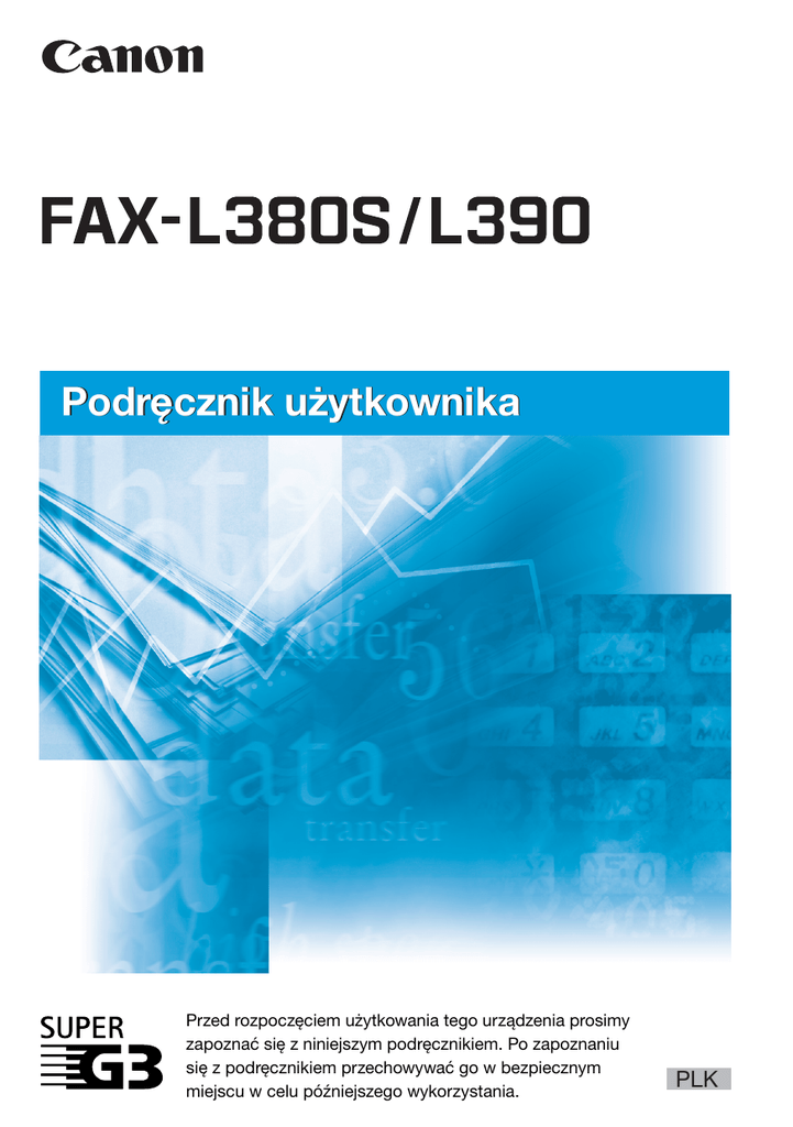 Podręcznik użytkownika Przed rozpoczęciem użytkowania tego urządzenia prosimy zapoznać się z niniejszym podręcznikiem. Po zapoznaniu się z podręcznikiem przechowywać go w bezpiecznym miejscu w celu późniejszego wykorzystania. PLK Podręcznik użytkownika FAX-L380S/L390 Informacje dotyczące podręczników dołączanych do tego urządzenia Do urządzenia dołączano poniższe podręczniki. Prosimy o zapoznanie się z nimi w celu uzyskania szczegółowych informacji. Na poniższej liście znajdują się podręczniki dołączane do wyposażenia dodatkowego. Podręczniki oznaczone tym symbolem są w postaci książkowej. • Konfiguracja telefaksu • Instalowanie CARPS • Przegląd funkcji • Konserwacja i rozwiązywanie problemów • Konfiguracja telefaksu • Sposób postępowania z dokumentami • • • • • • i papierem Wysyłanie i odbieranie faksów Szybkie wybieranie numerów Kopiowanie Konserwacja urządzenia Rozwiązywanie problemów Układ menu • Instalacja oprogramowania CARPS • Właściwości drukarki • Rozwiązywanie problemów ze sterownikiem CD-ROM Podręczniki oznaczone tym symbolem są w formie plików PDF i znajdują się na dołączanych płytach CD-ROM. Przewodnik wprowadzający Podręcznik użytkownika (niniejszy dokument) CD-ROM Instrukcja obsługi oprogramowania CD-ROM drukarki • Do przeglądania tej instrukcji w formacie PDF wymagany jest program Adobe Reader/Adobe Acrobat Reader. Jeśli Adobe Reader/Adobe Acrobat Reader nie jest zainstalowany w systemie Użytkownika, należy go zainstalować ze strony internetowej Adobe Systems Incorporated. • Dołożyliśmy wszelkich starań, aby niniejsze przewodniki omawiające telefaks były wolne od błędów i opuszczeń. Ponieważ jednak nasze produkty są ciągle rozwijane, w przypadku gdy potrzebujecie Państwo dokładnych ich specyfikacji, prosimy o kontakt z firmą Canon. WAŻNE! Dodatek C opisuje istotne informacje dotyczące funkcji charakterystycznych dla poszczególnych krajów. Jeśli w Dodatku C znajduje się kraj Użytkownika zalecamy przeczytanie tych informacji. Urządzenie niniejsze spełnia zasadnicze wymagania Dyrektywy WE 1999/5/WE. Oświadczamy, że wyrób ten jest zgodny z wymaganiami EMC Dyrektywy EC 1999/5/EC, przy znamionowym napięciu sieci zasilającej 230 V, 50 Hz, chociaż znamionowe napięcie zasilania produktu jest dostosowane do napięcia 200V-240V, 50/60 Hz. Niniejsze urządzenie zostało przetestowane w typowym systemie w celu sprawdzenia zgodności z wymaganiami technicznymi Dyrektywy EMC. Ze względu na wymagania zawarte w dyrektywie o kompatybilności elektromagnetycznej konieczne jest używanie kabli ekranowanych. Jeżeli po przeniesieniu się użytkownika do innego kraju UE pojawi się problem z urządzeniem, należy skontaktować się z biurem pomocy technicznej firmy Canon. (Tylko Europa) Nazwa modelu H12425 (FAX-L380S) H12425 (FAX-L390) Prawa autorskie Copyright ©2005 Canon Inc. Wszelkie prawa zastrzeżone. Żadna część niniejszej publikacji nie może być powielana, transmitowana i kopiowana oraz przechowywana w systemach do wyszukiwania informacji lub tłumaczona na jakikolwiek język naturalny lub komputerowy w jakiejkolwiek formie lub w jakikolwiek sposób, elektronicznie, mechanicznie, magnetycznie, optycznie, chemicznie, ręcznie czy w inny sposób bez wcześniejszego pisemnego zezwolenia firmy Canon Inc. ii Znaki handlowe Nazwa Canon® jest zastrzeżonym znakiem handlowym, a skrót UHQ™ jest znakiem handlowym firmy Canon Inc. IBM® jest zastrzeżonym znakiem handlowym. Microsoft® i Windows® są zastrzeżonymi znakami handlowymi Microsoft Corporation. Pozostałe nazwy własne i nazwy produktów mogą być znakami handlowymi lub zastrzeżonymi znakami handlowymi ich odpowiednich właścicieli. Jako partner programu ENERGY STAR® firma Canon uznała, że niniejszy produkt spełnia wymogi programu ENERGY STAR® dotyczące wydajności energetycznej. Międzynarodowy program ENERGY STAR® obejmujący sprzęt biurowy promuje oszczędność energii podczas korzystania z komputerów i innego sprzętu biurowego. Program wspiera rozwój i rozpowszechnianie produktów posiadających funkcje pozwalające na zmniejszenie poboru energii. Jest to otwarty system, w którym dobrowolnie uczestniczą właściciele przedsiębiorstw. Produkty objęte programem to sprzęt biurowy taki jak komputery, monitory, drukarki, telefaksy i kopiarki. Standardy i logo są znormalizowane wśród wszystkich uczestniczących krajów. Termin Super G3 opisuje nową generację telefaksów korzystających z modemów o szybkości 33,6 kb/s* z obsługą standardu ITU-T V.34. Szybkie telefaksy Super G3 przesyłają jedną stronę dokumentu w czasie około 3 sekund*, co oznacza zmniejszenie kosztów połączeń telefonicznych. * W oparciu o tabelę Nr 1 normy dotyczącej telefaksów (tryb standardowy) przy szybkości transmisji modemu wynoszącej 33,6 kb/s (kilobitów na sekundę) czas transmisji 1 strony danych faksowych wynosi około trzech sekund. W zależności od stanu technicznego, publiczne komutowane sieci telefoniczne (PSTN) obsługują aktualnie szybkości transmisji 28,8 kb/s lub niższe. iii Informacje o środkach bezpieczeństwa Bezpieczeństwo użytkowania urządzenia laserowego Promieniowanie laserowe może być niebezpieczne dla organizmu. Z tego powodu promieniowanie laserowe emitowane wewnątrz urządzenia jest hermetycznie zamknięte w obudowie, a urządzenie jest zamknięte pokrywą. Żadne promieniowanie laserowe nie może wydostać się z urządzenia podczas normalnej eksploatacji wyrobu przez użytkownika. Produkt ten jest klasyfikowany jako Produkt Laserowy Klasy 1 zgodnie z normą IEC 60825-1: 1993 i EN 608251: 1994. Model na napięcie 200V-240V Pokazana poniżej etykieta jest przymocowana do zespołu skanera laserowego wewnątrz obudowy urządzenia. Produkt ten jest klasyfikowany jako zgodny z normą IEC 608251: 1993 i EN60825-1: 1994 i odpowiada następujący