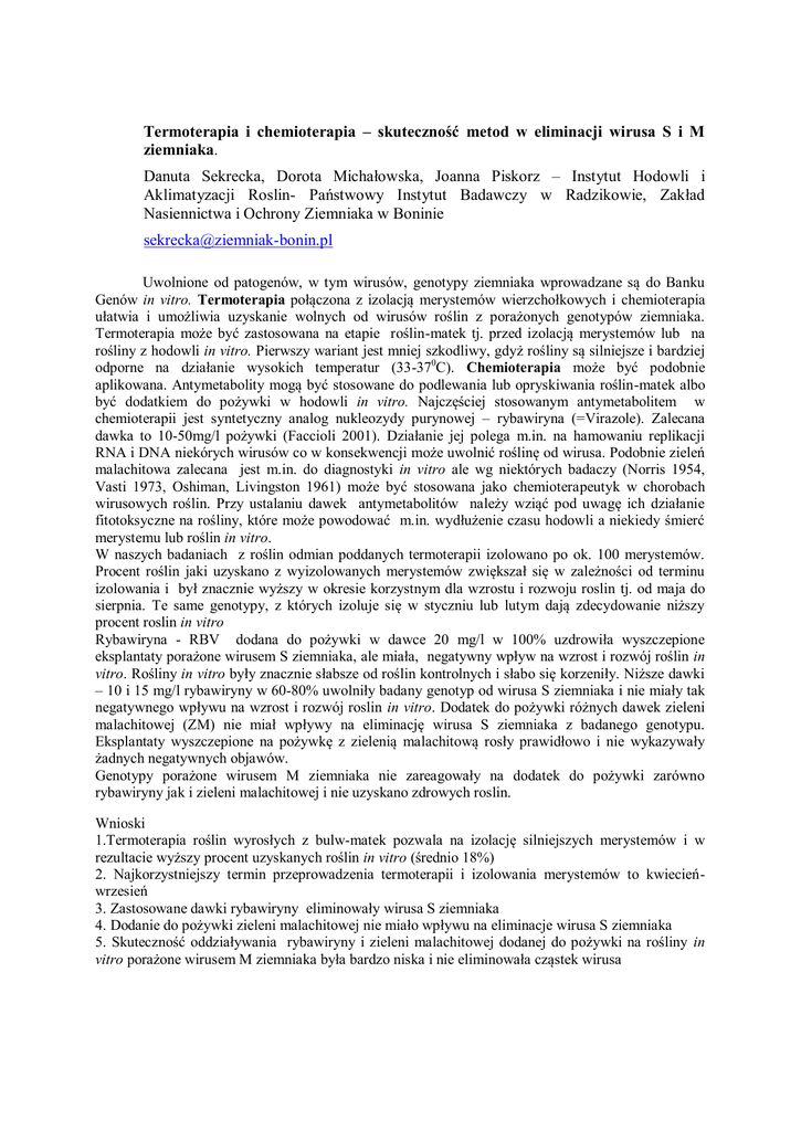 Termoterapia i chemioterapia – skuteczność metod w eliminacji wirusa S i M ziemniaka. Danuta Sekrecka, Dorota Michałowska, Joanna Piskorz – Instytut Hodowli i Aklimatyzacji Roslin- Państwowy Instytut Badawczy w Radzikowie, Zakład Nasiennictwa i Ochrony Ziemniaka w Boninie [email protected] Uwolnione od patogenów, w tym wirusów, genotypy ziemniaka wprowadzane są do Banku Genów in vitro. Termoterapia połączona z izolacją merystemów wierzchołkowych i chemioterapia ułatwia i umożliwia uzyskanie wolnych od wirusów roślin z porażonych genotypów ziemniaka. Termoterapia może być zastosowana na etapie roślin-matek tj. przed izolacją merystemów lub na rośliny z hodowli in vitro. Pierwszy wariant jest mniej szkodliwy, gdyż rośliny są silniejsze i bardziej odporne na działanie wysokich temperatur (33-370C). Chemioterapia może być podobnie aplikowana. Antymetabolity mogą być stosowane do podlewania lub opryskiwania roślin-matek albo być dodatkiem do pożywki w hodowli in vitro. Najczęściej stosowanym antymetabolitem w chemioterapii jest syntetyczny analog nukleozydy purynowej – rybawiryna (=Virazole). Zalecana dawka to 10-50mg/l pożywki (Faccioli 2001). Działanie jej polega m.in. na hamowaniu replikacji RNA i DNA niekórych wirusów co w konsekwencji może uwolnić roślinę od wirusa. Podobnie zieleń malachitowa zalecana jest m.in. do diagnostyki in vitro ale wg niektórych badaczy (Norris 1954, Vasti 1973, Oshiman, Livingston 1961) może być stosowana jako chemioterapeutyk w chorobach wirusowych roślin. Przy ustalaniu dawek antymetabolitów należy wziąć pod uwagę ich działanie fitotoksyczne na rośliny, które może powodować m.in. wydłużenie czasu hodowli a niekiedy śmierć merystemu lub roślin in vitro. W naszych badaniach z roślin odmian poddanych termoterapii izolowano po ok. 100 merystemów. Procent roślin jaki uzyskano z wyizolowanych merystemów zwiększał się w zależności od terminu izolowania i był znacznie wyższy w okresie korzystnym dla wzrostu i rozwoju roslin tj. od maja do sierpnia. Te same genotypy, z których izoluje się w styczniu lub lutym dają zdecydowanie niższy procent roslin in vitro Rybawiryna - RBV dodana do pożywki w dawce 20 mg/l w 100% uzdrowiła wyszczepione eksplantaty porażone wirusem S ziemniaka, ale miała, negatywny wpływ na wzrost i rozwój roślin in vitro. Rośliny in vitro były znacznie słabsze od roślin kontrolnych i słabo się korzeniły. Niższe dawki – 10 i 15 mg/l rybawiryny w 60-80% uwolniły badany genotyp od wirusa S ziemniaka i nie miały tak negatywnego wpływu na wzrost i rozwój roslin in vitro. Dodatek do pożywki różnych dawek zieleni malachitowej (ZM) nie miał wpływy na eliminację wirusa S ziemniaka z badanego genotypu. Eksplantaty wyszczepione na pożywkę z zielenią malachitową rosły prawidłowo i nie wykazywały żadnych negatywnych objawów. Genotypy porażone wirusem M ziemniaka nie zareagowały na dodatek do pożywki zarówno rybawiryny jak i zieleni malachitowej i nie uzyskano zdrowych roslin. Wnioski 1.Termoterapia roślin wyrosłych z bulw-matek pozwala na izolację silniejszych merystemów i w rezultacie wyższy procent uzyskanych roślin in vitro (średnio 18%) 2. Najkorzystniejszy termin przeprowadzenia termoterapii i izolowania merystemów to kwiecieńwrzesień 3. Zastosowane dawki rybawiryny eliminowały wirusa S ziemniaka 4. Dodanie do pożywki zieleni malachitowej nie miało wpływu na eliminacje wirusa S ziemniaka 5. Skuteczność oddziaływania rybawiryny i zieleni malachitowej dodanej do pożywki na rośliny in vitro porażone wirusem M ziemniaka była bardzo niska i nie eliminowała cząstek wirusa Literatura Faccioli G. 2001 Control of potato Viruses using Meristem and Stem- cutting Cultures, Thermotherapy and Chemotherapy. Ed. Virus and Virus-like Disease of Potatoes and production of Seed Potatoes. 382-385 Norris D.O. 1954 Development of virus-free stock od Green Mountain Potato by treatment with malachite green. Australian J.Agricul,Res. 5, 658-663 Vasti S.M. 1973 Effect of antiviral chemicals on production of virus X free potato tubers. Pak.J.Bot., 5(2), 139-142 Oshiman N., Livingston C.H. 1961. The effects of antiviral chemicals on potato virus X. Am.Potato J. 38: 294-299