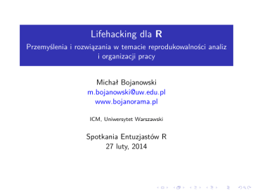 Lifehacking dla R Przemyślenia i rozwiązania w temacie reprodukowalności analiz i organizacji pracy Michał Bojanowski [email protected] www.bojanorama.pl ICM, Uniwersytet Warszawski Spotkania Entuzjastów R 27 luty, 2014 Kontekst i problem Potrzeby Istniejące rozwiązania Alternatywne rozwiązanie Podsumowanie Lifehacking dla R Wikipedia głosi Lifehack [ang. life “życie”, hack orig. “ciąć”, też “kombinować”] to ogólna nazwa sposobów i trików używanych do ułatwiania sobie życia. Cel: Jak ułatwić sobie życie pracując z R? . . . w pewnych sytuacjach. . . Michał Bojanowski <[email protected]> Lifehacking dla R ICM UW Kontekst i problem Potrzeby Istniejące rozwiązania Alternatywne rozwiązanie Podsumowanie 1 Kontekst i problem 2 Potrzeby 3 Istniejące rozwiązania 4 Alternatywne rozwiązanie 5 Podsumowanie Michał Bojanowski <[email protected]> Lifehacking dla R ICM UW Kontekst i problem Potrzeby Istniejące rozwiązania Alternatywne rozwiązanie Podsumowanie Kontekst Mamy różne źródła danych (pliki, bazy danych, web scrapping) Efektem końcowym ma być raport (tekst lub prezentacja) Analizy średniej skali Bardziej złożona niż jeden skrypt Być może nie “Big Data” In statu nascendi Względnie dużo czyszczenia i sprawdzania spójności danych Eksperymentowanie z analizami i wizualizacjami (EDA) Michał Bojanowski <[email protected]> Lifehacking dla R ICM UW Kontekst i problem Potrzeby Istniejące rozwiązania Alternatywne rozwiązanie Podsumowanie Problem/zadanie: reprodukowalne analizy Reprodukowalne analizy (reproducible research), co to jest i po co? Reprodukowalne przejście od danych surowych do raportu Wykonywane bez konieczności ręcznych interwencji Umożliwiają generowanie raportu nawet gdy zmieniają się kod, dane lub założenia Ręczne przeklejanie wyników do raportu pracochłonne i błędorodne. Dokumentacja procesu analitycznego “Trustworthy software” (Chambers 2008). Analizowanie danych to dziś pisanie software’u. Michał Bojanowski <[email protected]> Lifehacking dla R ICM UW Kontekst i problem Potrzeby Istniejące rozwiązania Alternatywne rozwiązanie Podsumowanie Pożądane własności rozwiązania Wersjonowanie plików Śledzenie zmian. Nieinteraktywne wykonywanie skryptów Wygenerowanie raportu nie powinno wymagać za każdym razem jakiś ręcznych interwencji. Caching rezultatów Nie chcemy wykonywać analiz, dla których kod źródłowy i dane się nie zmieniły. Dokumentowanie analiz Dobrze by było trzymać dokumentację i kod razem. Obliczenia równoległe Szybciej! Prostota Nie potrzebujemy dodatkowego “systemu” do zarządzania i debugowania. Michał Bojanowski <[email protected]> Lifehacking dla R ICM UW Kontekst i problem Potrzeby Istniejące rozwiązania Alternatywne rozwiązanie Podsumowanie Istniejące rozwiązania Wersjonowanie plików Git, Subversion, etc. Nieinteraktywnie Tryb wsadowy: R CMD BATCH, Rscript, r Dokumentowanie analiz Literate programming m.in. Sweave, knitr (knitr::spin!), brew Caching rezultatów cacheSweave, stashR, knitr Pakiet projectTemplate organizuje cały projekt w foldery (dane, skrypty, logi, etc.). Raczej sztywna konstrukcja. Klon GNU make? A może GNU make po prostu? Michał Bojanowski <[email protected]> Lifehacking dla R ICM UW Kontekst i problem Potrzeby Istniejące rozwiązania Alternatywne rozwiązanie Podsumowanie GNU Make Co to jest GNU make1 : Narzędzie do kompilowania programów Automatycznie określa, które fragmenty większego programu powinny być skompilowane jeszcze raz Wymaga opisania zależności pomiędzy plikami (źródła i efekty kompilacji) oraz komand niezbędnych do kompilacji. Plik Makefile. Może wykonywać operacje równolegle (make -j). Można używać w innych kontekstach, w których np. przetwarzamy jakąś kolekcję plików źródłowych (dane, skrypty, etc.) 1 www.gnu.org/software/make Michał Bojanowski <[email protected]> Lifehacking dla R ICM UW Kontekst i problem Potrzeby Istniejące rozwiązania Alternatywne rozwiązanie Podsumowanie Zawartość Makefile Makefile przede wszystkim zawiera reguły postaci target: prerequisite1 prerequistie2 .. recipe Przykład dla R: wykres.pdf: skrypt.R dane1.dat dane2.dat R CMD BATCH skrypt.R Michał Bojanowski <[email protected]> Lifehacking dla R ICM UW Kontekst i problem Potrzeby Istniejące rozwiązania Alternatywne rozwiązanie Podsumowanie “Nieoczywistości” Podzielenie analiz na moduły (podkatalogi)? make może działać “rekursywnie”, ale jest to nieefektywne (Miller 1997) pod względem obliczeń równoległych (make -j). Jednym skryptem R często generujemy wiele innych plików (np, wykresów) make zakłada, że jednym “przepisem” generujemy jeden plik wynikowy (“target”). Bynajmniej sprawy nie załatwia reguła typu: target1 target2: skrypt dane Michał Bojanowski <[email protected]> Lifehacking dla R ICM UW Kontekst i problem Potrzeby Istniejące rozwiązania Alternatywne rozwiązanie Podsumowanie GNU make z R Jak użyć GNU make efektywnie z R? Istniejące rozwiązania/szablony Rob J. Hyndman (autor m.in. forecast)2 Bardzo proste Nie śledzi wszystkich targetów Bazuje na plikach .Rout – make może się nie zatrzymać w przypadku błędów w skryptach R. Pierre Lindenbaum3 R jako główna powłoka make Wymaga pisania kodu R wewnątrz Makefile – niezbyt wygodne. Raczej “proof of concept”. 2 http://robjhyndman.com/hyndsight/makefiles/ http: //plindenbaum.blogspot.com/2014/01/parallelizing-rstats-using-make.html 3 Michał Bojanowski <[email protected]> Lifehacking dla R ICM UW Kontekst i problem Potrzeby Istniejące rozwiązania Alternatywne rozwiązanie Podsumowanie Triki GNU make z R: modułowość bez rekursywności Podkatalogi zawierają module.mk czytany przez Makefile . | ++| | | +- Makefile dir1 +- module.mk +- skrypt1.R +- dane.dat dir2 +- module.mk Michał Bojanowski <[email protected]> Lifehacking dla R ICM UW Kontekst i problem Potrzeby Istniejące rozwi