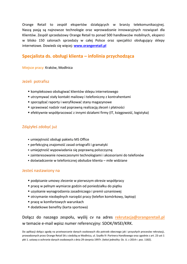 Orange Retail to zespół ekspertów działających w branży telekomunikacyjnej. Naszą pasją są najnowsze technologie oraz wprowadzanie innowacyjnych rozwiązań dla Klientów. Zespół sprzedażowy Orange Retail to ponad 500 handlowców mobilnych, eksperci w blisko 150 salonach sprzedaży w całej Polsce oraz specjaliści obsługujący sklepy internetowe. Dowiedz się więcej: www.orangeretail.pl Specjalista ds. obsługi klienta – infolinia przychodząca Miejsce pracy: Kraków, Modlnica Jeżeli potrafisz kompleksowo obsługiwać klientów sklepu internetowego utrzymywać stały kontakt mailowy i telefoniczny z kontrahentami sporządzać raporty i weryfikować stany magazynowe sprawować nadzór nad poprawną realizacją zleceń i płatności efektywnie współpracować z innymi działami firmy (IT, księgowość, logistyka) Zdążyłeś zdobyć już umiejętność obsługi pakietu MS Office perfekcyjną znajomość zasad ortografii i gramatyki umiejętność wypowiadania się poprawną polszczyzną zainteresowanie nowoczesnymi technologiami i akcesoriami do telefonów doświadczenie w telefonicznej obsłudze klienta – mile widziane Jesteś nastawiony na podpisanie umowy zlecenie w pierwszym okresie współpracy pracę w pełnym wymiarze godzin od poniedziałku do piątku uzyskanie wynagrodzenia zasadniczego i premii uznaniowej otrzymanie niezbędnych narzędzi pracy (telefon komórkowy, laptop) pracę w komfortowych warunkach dodatkowe benefity (karta sportowa) Dołącz do naszego zespołu, wyślij cv na adres [email protected] w temacie e-mail wpisz numer referencyjny: SDOK/WSEI/KRK. Do aplikacji dołącz zgodę na przetwarzanie danych osobowych dla potrzeb obecnego jak i przyszłych procesów rekrutacji, prowadzonych przez Orange Retail SA z siedzibą w Modlnica, ul. Szydło 9 i Partnera Handlowego oraz zgodnie z art. 23 ust 1 pkt 1. ustawy o ochronie danych osobowych z dnia 29 sierpnia 1997r. (tekst jednolity: Dz. U. z 2014 r. poz. 1182).