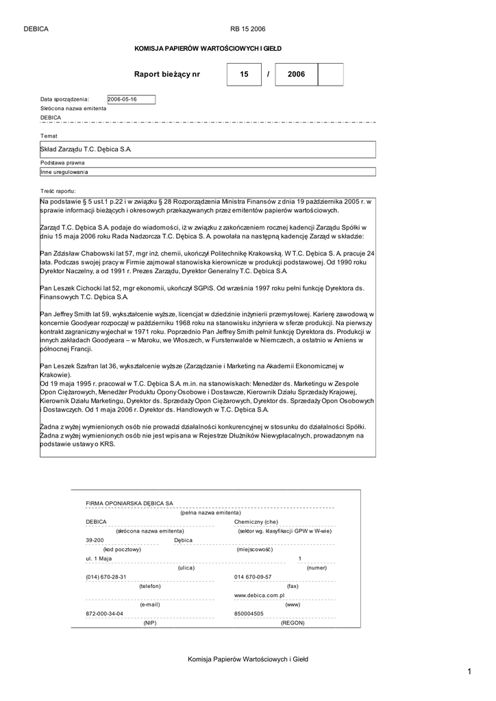 DEBICA RB 15 2006 KOMISJA PAPIERÓW WARTOŚCIOWYCH I GIEŁD Raport bieżący nr 15 / 2006 2006-05-16 Data sporządzenia: Skróc ona nazwa emitenta DEBICA Temat Skład Zarządu T.C. Dębica S.A. Podstawa prawna Treść raportu: Na podstawie § 5 ust.1 p.22 i w związku § 28 Rozporządzenia Ministra Finansów z dnia 19 października 2005 r. w sprawie informacji bieżących i okresowych przekazywanych przez emitentów papierów wartościowych. Zarząd T.C. Dębica S.A. podaje do wiadomości, iż w związku z zakończeniem rocznej kadencji Zarządu Spółki w dniu 15 maja 2006 roku Rada Nadzorcza T.C. Dębica S. A. powołała na następną kadencję Zarząd w składzie: Pan Zdzisław Chabowski lat 57, mgr inż. chemii, ukończył Politechnikę Krakowską. W T.C. Dębica S. A. pracuje 24 lata. Podczas swojej pracy w Firmie zajmował stanowiska kierownicze w produkcji podstawowej. Od 1990 roku Dyrektor Naczelny, a od 1991 r. Prezes Zarządu, Dyrektor Generalny T.C. Dębica S.A. Pan Leszek Cichocki lat 52, mgr ekonomii, ukończył SGPiS. Od września 1997 roku pełni funkcję Dyrektora ds. Finansowych T.C. Dębica S.A. Pan Jeffrey Smith lat 59, wykształcenie wyższe, licencjat w dziedzinie inżynierii przemysłowej. Karierę zawodową w koncernie Goodyear rozpoczął w październiku 1968 roku na stanowisku inżyniera w sferze produkcji. Na pierwszy kontrakt zagraniczny wyjechał w 1971 roku. Poprzednio Pan Jeffrey Smith pełnił funkcję Dyrektora ds. Produkcji w innych zakładach Goodyeara – w Maroku, we Włoszech, w Furstenwalde w Niemczech, a ostatnio w Amiens w północnej Francji. Pan Leszek Szafran lat 36, wykształcenie wyższe (Zarządzanie i Marketing na Akademii Ekonomicznej w Krakowie). Od 19 maja 1995 r. pracował w T.C. Dębica S.A. m.in. na stanowiskach: Menedżer ds. Marketingu w Zespole Opon Ciężarowych, Menedżer Produktu Opony Osobowe i Dostawcze, Kierownik Działu Sprzedaży Krajowej, Kierownik Działu Marketingu, Dyrektor ds. Sprzedaży Opon Ciężarowych, Dyrektor ds. Sprzedaży Opon Osobowych i Dostawczych. Od 1 maja 2006 r. Dyrektor ds. Handlowych w T.C. Dębica S.A. Żadna z wyżej wymienionych osób nie prowadzi działalności konkurencyjnej w stosunku do działalności Spółki. Żadna z wyżej wymienionych osób nie jest wpisana w Rejestrze Dłużników Niewypłacalnych, prowadzonym na podstawie ustawy o KRS. FIRMA OPONIARSKA DĘBICA SA (pełna nazwa emitenta) DEBICA Chemic zny (c he) (skróc ona nazwa emitenta) 39-200 (sektor wg. klasyfikac ji GPW w W-wie) Dębic a (kod poc ztowy) (miejsc owość ) ul. 1 Maja 1 (ulic a) (014) 670-28-31 (numer) 014 670-09-57 (telefon) (fax) www.debic a.c om.pl (e-mail) 872-000-34-04 (www) 850004505 (NIP) (REGON) Komisja Papierów Wartościowych i Giełd 1 DEBICA RB 15 2006 PODPISY OSÓB REPREZENTUJĄCYCH SPÓŁKĘ Data Imię i Nazwisko Stanowisko/Funkc ja 2006-05-16 Zdzisław Chabowski Prezes Zarządu/Dyrektor Generalny 2006-05-16 Leszek Cic hoc ki Członek Zarządu/Dyrektor ds. Finansowyc h Podpis Komisja Papierów Wartościowych i Giełd 2