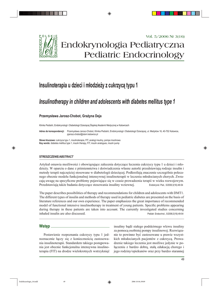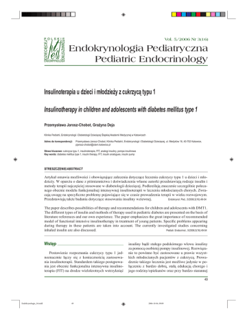 Vol. 5/2006 Nr 3(16) Endokrynologia Pediatryczna Pediatric Endocrinology Insulinoterapia u dzieci i młodzieży z cukrzycą typu 1 Insulinotherapy in children and adolescents with diabetes mellitus type 1 Przemysława Jarosz-Chobot, Grażyna Deja Klinika Pediatrii, Endokrynologii i Diabetologii Dziecięcej Śląskiej Akademii Medycznej w Katowicach Adres do korespondencji: Przemysława Jarosz-Chobot, Klinika Pediatrii, Endokrynologii i Diabetologii Dziecięcej, ul. Medyków 16, 40-752 Katowice, [email protected] Słowa kluczowe: cukrzyca typu 1, insulinoterapia, FIT, analogi insuliny, pompa insulinowa Key words: diabetes mellitus type 1, insulin therapy, FIT, insulin analogues, insulin pump STRESZCZENIE/ABSTRACT Artykuł omawia możliwości i obowiązujące zalecenia dotyczące leczenia cukrzycy typu 1 u dzieci i młodzieży. W oparciu o dane z piśmiennictwa i doświadczenia własne autorki przedstawiają rodzaje insulin i metody terapii najczęściej stosowane w diabetologii dziecięcej. Podkreślają znaczenie szczególnie polecanego obecnie modelu funkcjonalnej intensywnej insulinoterapii w leczeniu młodocianych chorych. Zwracają uwagę na specyficzne problemy pojawiające się w czasie prowadzenia terapii w wieku rozwojowym. Przedstawiają także badania dotyczące stosowania insuliny wziewnej. Endokrynol. Ped., 5/2006;3(16):49-54 The paper describes possibilities of therapy and recommendations for children and adolescents with DMT1. The different types of insulin and methods of therapy used in pediatric diabetes are presented on the basis of literature references and our own experience. The paper emphasizes the great importance of recommended model of functional intensive insulinotherapy in treatment of young patients. Specific problems appearing during therapy in these patients are taken into account. The currently investigated studies concerning inhaled insulin are also discussed. Pediatr. Endocrinol., 5/2006;3(16):49-54 Wstęp Postawienie rozpoznania cukrzycy typu 1 jednoznacznie łączy się z koniecznością zastosowania insulinoterapii. Standardem takiego postępowania jest obecnie funkcjonalna intensywna insulinoterapia (FIT) na drodze wielokrotnych wstrzyknięć insuliny bądź stałego podskórnego wlewu insuliny za pomocą osobistej pompy insulinowej. Rozwiązanie to powinno być zastosowane u prawie wszystkich młodocianych pacjentów z cukrzycą. Prowadzenie takiego leczenia jest możliwe jedynie w połączeniu z bardzo dobrą, stałą edukacją chorego i jego rodziny/opiekunów oraz przy bardzo starannej 49 Endokrynologia_16.indd 49 2006-10-04, 09:09 Praca przeglądowa Endokrynol. Ped., 5/2006;3(16):49-54 samokontroli chorego [1–4]. Dzisiejszy ogromny postęp w leczeniu cukrzycy jest przede wszystkim oparty na rozwoju technologicznym, który umożliwia powszechność i skuteczność stosowania FIT. Rodzaje insulin stosowanych w leczeniu Od lat w leczeniu chorych dzieci stosowane są wyłącznie insuliny uzyskiwane drogą rekombinacji DNA o składzie aminokwasowym dokładnie takim, jak insulina ludzka lub jej analogi, w których dokonano niewielkich modyfikacji aminokwasowych cząsteczki insuliny. Stale zwiększający się asortyment preparatów insulin różniących się działaniem stwarza szansę na indywidualny dobór modelu insulinoterapii. W chwili obecnej stosowanych jest kilkanaście preparatów insulinowych, różniących się dynamiką działania. Insulina krótkodziałająca oraz jej szybko działające analogi stanowią zasadniczy składnik leczenia metodą FIT. Podaje się je z reguły przed głównymi posiłkami oraz jako tzw. dawki korekcyjne. Są one nieodzowne w sytuacjach kryzysowych: kwasicy ketonowej, podczas zabiegów chirurgicznych czy w przypadku hiperglikemii w warunkach domowych, np. w czasie infekcji. Szybko działające analogi znalazły szerokie zastosowanie w leczeniu młodocianych chorych [2, 4–7]. Analogi są korzystne zwłaszcza w leczeniu małych dzieci, niemowląt oraz osób o aktywnym, nieuregulowanym trybie życia. Mogą być podane bezpośrednio przed posiłkiem, a ich szybkie działanie nie tylko zmniejsza poposiłkową hiperglikemię, lecz także redukuje zagrożenie poposiłkową i nocną hipoglikemią. Preparaty te mogą być także podane po posiłku, co jest bardzo korzystne u bardzo małych dzieci wykazujących niechęć do jedzenia. Z powodzeniem są również powszechnie stosowane w osobistych pompach insulinowych. Interesujący przegląd doniesień o zastosowaniu analogów w leczeniu cukrzycy przedstawiony został ostatnio przez Oiknine i wsp. [8]. Omówiono w nim dynamikę działania poszczególnych analogów, zestawiając ją z dynamiką konwencjonalnych preparatów insulin ludzkich. Obecnie powszechnie stosowane są analogi szybko działające: Lispro (Humalog), Aspart (NovoRapid) oraz Glulisine (Apidra). Pierwszym wprowadzonym w Polsce analogiem był Humalog, od kilku lat coraz szerzej stosowany jest także NovoRapid. Oba te preparaty w badaniach porównawczych oceniane są jako równorzędne w regulacji stężenia glukozy we krwi [9, 10]. Z obserwacji klinicznych wynika jednak, że różnią się nieco między sobą dynamiką działania, stąd też znajdują zastosowanie u różnych grup pacjentów. Początek działania obu preparatów jest szybki, jednak w dalszym przebiegu dają się zauważyć pewne różnice w profilu działania – czas działania NovoRapidu jest nieco dłuższy. Humalog szczególnie dobrze sprawdza się u chorych o bardzo zmiennym trybie życia, nieregularnych posiłkach i dużej aktywności fizycznej. NovoRapid wydaje się korzystniejszy w sytuacjach, gdy istotna jest nieco wolniejsza dynamika obniżania glikemii, np. u dzieci w wieku przedszkolnym. Trzeci z wymienionych preparatów Glulisine (Apidra) nie jest jeszcze w Polsce dostępny, choć publikowane są już doniesienia na temat jego stosowania [11–13]. W pracach tych, podobnie jak w przypadku innych szybko działających analogów