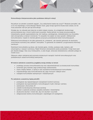 Komunikacja interpersonalna jako podstawa dobrych relacji Na jednym ze szkoleń uczestnik zapytał „Czy oddychania trzeba się uczyć?” Możecie pomyśleć, ale co to ma wspólnego z komunikacją? Bardzo dużo, gdyż wciąż ogromna liczba ludzi uważa, że nie musi pracować nad tym jak się komunikuje. Wydaje się, że człowiek jest obecnie na takim etapie rozwoju, że umiejętność skutecznego porozumiewania się z innymi ludźmi jest oczywista. Każdy jednak ma swoje przyzwyczajenia, indywidualny sposób wypowiadania się, tok myślowy, paradygmaty, doświadczenia czy chociażby stan emocjonalny w danym momencie. To wszystko ma wpływ na nasz sposób i efektywność komunikowania. Często to również główne przyczyny powstawania barier komunikacyjnych. Efektywna komunikacja to nie tylko gotowość do „mówienia”, ale również gotowość do słuchania, zrozumienia rozmówcy bez założeń i domysłów. To gotowość do dzielenia i przyjmowania informacji zwrotnych. Nośnikami komunikatów są słowa, ale również gesty, mimika, postawa ciała, dystans, jaki utrzymujemy z naszym rozmówcą. Ralph Emerson amerykański poeta powiedział „Twoja twarz jest jak otwarta księga. Gdy oczy mówią jedno, a usta drugie, wówczas doświadczony człowiek polega na mowie oczu.” Głównym celem szkolenia jest poznanie skutecznych narzędzi i technik komunikacyjnych oraz podstawowych zasad komunikacji asertywnej. W trakcie szkolenia uczestnicy pogłębią swoją wiedzę na temat: przebiegu procesu komunikowania się oraz odpowiedzialności za skuteczność komunikatu schematu góry lodowej i jego praktycznego zastosowania różnic między faktem, a opinią w celu wyrażania konstruktywnych komunikatów indywidualnego stylu komunikowania się, jego mocnych i słabych stron rodzajów komunikatów asertywnych i nieasertywnych Po szkoleniu uczestnicy będą potrafili: posługiwać się najważniejszymi narzędziami kontroli rozmowy posługiwać się wypowiedziami, komunikującymi myśli, intencje i zamiary zastosować „Komunikat JA” udzielić konstruktywnej informacji zwrotnej zadbać o spójność przekazu (aspekty werbalne i niewerbalne) skutecznie słuchać i mówić tak, aby inni słuchali i rozumieli zdiagnozować bariery komunikacyjne i zapobiegać ich wystąpieniu Grupa docelowa Szkolenie dedykowane jest dla osób, które w działalności zawodowej komunikują się zarówno z Klientami wewnętrznymi i zewnętrznymi, zajmują się prezentacją i wdrożeniami projektów, obsługą Klientów, sprzedażą, prezentacją produktów i/lub usług. Szkolenie przeznaczone jest zarówno dla kadry zarządzającej średniego szczebla, jak też szeregowych pracowników firmy. Program szkolenia Szczegółowy zakres szkolenia zostanie dopasowany do specyfiki firmy, branży oraz potrzeb Klienta. Metody pracy Szkolenie ma charakter warsztatowy. Ponad 80% czasu przeznaczone jest na ćwiczenia angażujące wszystkich uczestników w celu wypracowania i przećwiczenia konkretnych umiejętności. W trakcie szkolenia odwołujemy się do zasad efektywnego uczenia się dorosłych. Wykorzystane zostaną następujące metody pracy: burza mózgów, ćwiczenia indywidualne i grupowe, testy, gry symulacyjne, analizy case study, psychodrama. Charakter szkolenia Otwarte lub wewnętrzne realizowane w grupie od 4-16 osób lub według indywidualnych ustaleń. Czas trwania Od 2 do 6 dni. Każdy z modułów szkoleniowych trwa 90 minut. Szkolenie odbywa się w godzinach 9-17 lub w uzgodnionych indywidualnie z Klientem. Materiały szkoleniowe Materiały szkoleniowe są podsumowaniem i uzupełnieniem materiału omawianego w trakcie szkolenia. Uczestnicy otrzymują je w formie drukowanej. Miejsce realizacji szkolenia W siedzibie Klienta lub w miejscu przez niego wskazanym. Raport poszkoleniowy Po realizacji szkolenia przygotowywany jest raport zawierający podsumowanie szkolenia, najważniejsze wnioski, rekomendacje dotyczące działań na przyszłość. Wsparcie szkoleniowe W ciągu miesiąca po szkoleniu zapraszamy do kontaktu, zadawania pytań odnośnie zagadnień realizowanych na szkoleniu. Wyślij zapytanie, a przedstawimy Ci szkolenie dostosowane do specyfiki i potrzeb Twojej firmy! Zapraszamy do kontaktu, tel. 22/ 839 55 99 wew. 225 MCS sp. z o.o. sp. k., ul. Czerska 14, 00-732 Warszawa [email protected], www.mcs.edu.pl