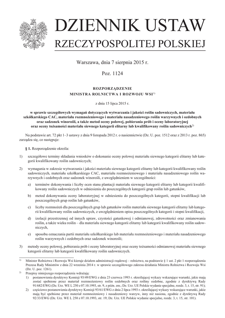 DZIENNIK USTAW RZECZYPOSPOLITEJ POLSKIEJ Warszawa, dnia 7 sierpnia 2015 r. Poz. 1124 ROZPORZĄDZENIE MINISTRA ROLNICTWA I ROZWOJU WSI 1) z dnia 15 lipca 2015 r. w sprawie szczegółowych wymagań dotyczących wytwarzania i jakości roślin sadowniczych, materiału szkółkarskiego CAC, materiału rozmnożeniowego i materiału nasadzeniowego roślin warzywnych i ozdobnych oraz sadzonek winorośli, a także metod oceny polowej, pobierania prób i oceny laboratoryjnej oraz oceny tożsamości materiału siewnego kategorii elitarny lub kwalifikowany roślin sadowniczych2) Na podstawie art. 72 pkt 1–3 ustawy z dnia 9 listopada 2012 r. o nasiennictwie (Dz. U. poz. 1512 oraz z 2013 r. poz. 865) zarządza się, co następuje: § 1. Rozporządzenie określa: 1) szczegółowe terminy składania wniosków o dokonanie oceny polowej materiału siewnego kategorii elitarny lub kategorii kwalifikowany roślin sadowniczych; 2) wymagania w zakresie wytwarzania i jakości materiału siewnego kategorii elitarny lub kategorii kwalifikowany roślin sadowniczych, materiału szkółkarskiego CAC, materiału rozmnożeniowego i materiału nasadzeniowego roślin warzywnych i ozdobnych oraz sadzonek winorośli, z uwzględnieniem w szczególności: a) terminów dokonywania i liczby ocen stanu plantacji materiału siewnego kategorii elitarny lub kategorii kwalifikowany roślin sadowniczych w odniesieniu do poszczególnych kategorii grup roślin lub gatunków, b) metod dokonywania oceny laboratoryjnej w odniesieniu do poszczególnych kategorii, stopni kwalifikacji lub poszczególnych grup roślin lub gatunków, c) liczby rozmnożeń dla poszczególnych grup lub gatunków roślin materiału siewnego kategorii elitarny lub kategorii kwalifikowany roślin sadowniczych, z uwzględnieniem opisu poszczególnych kategorii i stopni kwalifikacji, d) izolacji przestrzennej od innych upraw, czystości gatunkowej i odmianowej, zdrowotności oraz zmianowania roślin, a także wieku roślin – dla materiału siewnego kategorii elitarny lub kategorii kwalifikowany roślin sadowniczych, e) sposobu oznaczania partii materiału szkółkarskiego lub materiału rozmnożeniowego i materiału nasadzeniowego roślin warzywnych i ozdobnych oraz sadzonek winorośli; 3) 1) 2) metody oceny polowej, pobierania prób i oceny laboratoryjnej oraz oceny tożsamości odmianowej materiału siewnego kategorii elitarny lub kategorii kwalifikowany roślin sadowniczych. Minister Rolnictwa i Rozwoju Wsi kieruje działem administracji rządowej – rolnictwo, na podstawie § 1 ust. 2 pkt 1 rozporządzenia Prezesa Rady Ministrów z dnia 22 września 2014 r. w sprawie szczegółowego zakresu działania Ministra Rolnictwa i Rozwoju Wsi (Dz. U. poz. 1261). Przepisy niniejszego rozporządzenia wdrażają: 1)postanowienia dyrektywy Komisji 93/49/EWG z dnia 23 czerwca 1993 r. określającej wykazy wskazujące warunki, jakie mają zostać spełnione przez materiał rozmnożeniowy roślin ozdobnych oraz rośliny ozdobne, zgodnie z dyrektywą Rady 91/682/EWG (Dz. Urz. WE L 250 z 07.10.1993, str. 9, z późn. zm.; Dz. Urz. UE Polskie wydanie specjalne, rozdz. 3, t. 15, str. 91); 2)częściowo postanowienia dyrektywy Komisji 93/61/EWG z dnia 2 lipca 1993 r. określającej wykazy wskazujące warunki, jakie mają być spełnione przez materiał rozmnożeniowy i nasadzeniowy warzyw, inny niż nasiona, zgodnie z dyrektywą Rady 92/33/EWG (Dz. Urz. WE L 250 z 07.10.1993, str. 19; Dz. Urz. UE Polskie wydanie specjalne, rozdz. 3, t. 15, str. 101). Dziennik Ustaw –2– Poz. 1124 § 2. Wniosek o dokonanie oceny polowej materiału siewnego kategorii elitarny lub kategorii kwalifikowany roślin sadowniczych składa się w roku, w którym dany materiał ma być poddany ocenie polowej, w terminach: 1) do dnia 10 marca – dla porzeczek i agrestu; 2) do dnia 30 maja – dla gatunków innych niż wymienione w pkt 1. § 3. 1. Plantacje materiału siewnego kategorii elitarny lub kategorii kwalifikowany roślin sadowniczych powinny być zakładane z zachowaniem: 1) izolacji przestrzennej, która ma na celu oddzielenie plantacji materiału siewnego kategorii elitarny lub kategorii kwalifikowany roślin sadowniczych od źródeł obcego pyłku lub chorób i szkodników pochodzących ze zbiorowisk roślin uprawnych oraz dziko rosnących, mogących stanowić źródło obcego pyłku; 2) szczegółowych wymagań dotyczących wytwarzania materiału siewnego poszczególnych gatunków roślin sadowniczych określonych w załączniku nr 4 do rozporządzenia. 2. Izolacja przestrzenna może być zmniejszona do połowy wymaganej odległości, jeżeli plantacja jest oddzielona od źródeł, o których mowa w ust. 1 pkt 1, lasem, wzgórzami lub wysokimi budynkami. § 4. 1. Ocena polowa materiału siewnego kategorii elitarny lub kategorii kwalifikowany roślin sadowniczych obejmuje jedną lub kilka ocen stanu plantacji, w zależności od potrzeby stwierdzenia spełnienia szczegółowych wymagań określonych w załączniku nr 4 do rozporządzenia. 2. Poszczególne oceny stanu plantacji są dokonywane w terminach wynikających ze szczegółowych wymagań określonych w załączniku nr 4 do rozporządzenia. 3. Podczas oceny polowej materiału siewnego kategorii elitarny lub kategorii kwalifikowany roślin sadowniczych sprawdzeniu podlegają w szczególności: 1) dołączona do wniosku o dokonanie oceny polowej dokumentacja; 2) zgodność informacji podanych we wniosku o dokonanie oceny polowej z dołączonymi do wniosku dokumentami oraz stanem faktycznym plantacji; 3) izolacja przestrzenna; 4) oznaczenie materiału siewnego kategorii elitarny lub kategorii kwalifikowany roślin sadowniczych; 5) przedplon; 6) wyrównanie roślin; 7) czystość gatunkowa i odmianowa; 8) wiek roślin; 9) pochodzenie ocenianych roślin; 10) zdrowotność, jakość i ilość roślin. 4. Do obliczania ilości materiału siewnego kategorii elitarny lub kategorii kwalifikowany roślin sadowniczych można stosować pomocniczo: