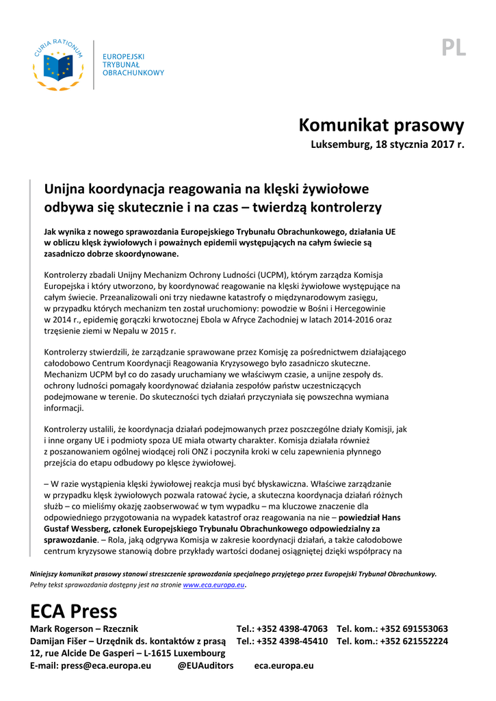 PL Komunikat prasowy Luksemburg, 18 stycznia 2017 r. Unijna koordynacja reagowania na klęski żywiołowe odbywa się skutecznie i na czas – twierdzą kontrolerzy Jak wynika z nowego sprawozdania Europejskiego Trybunału Obrachunkowego, działania UE w obliczu klęsk żywiołowych i poważnych epidemii występujących na całym świecie są zasadniczo dobrze skoordynowane. Kontrolerzy zbadali Unijny Mechanizm Ochrony Ludności (UCPM), którym zarządza Komisja Europejska i który utworzono, by koordynować reagowanie na klęski żywiołowe występujące na całym świecie. Przeanalizowali oni trzy niedawne katastrofy o międzynarodowym zasięgu, w przypadku których mechanizm ten został uruchomiony: powodzie w Bośni i Hercegowinie w 2014 r., epidemię gorączki krwotocznej Ebola w Afryce Zachodniej w latach 2014-2016 oraz trzęsienie ziemi w Nepalu w 2015 r. Kontrolerzy stwierdzili, że zarządzanie sprawowane przez Komisję za pośrednictwem działającego całodobowo Centrum Koordynacji Reagowania Kryzysowego było zasadniczo skuteczne. Mechanizm UCPM był co do zasady uruchamiany we właściwym czasie, a unijne zespoły ds. ochrony ludności pomagały koordynować działania zespołów państw uczestniczących podejmowane w terenie. Do skuteczności tych działań przyczyniała się powszechna wymiana informacji. Kontrolerzy ustalili, że koordynacja działań podejmowanych przez poszczególne działy Komisji, jak i inne organy UE i podmioty spoza UE miała otwarty charakter. Komisja działała również z poszanowaniem ogólnej wiodącej roli ONZ i poczyniła kroki w celu zapewnienia płynnego przejścia do etapu odbudowy po klęsce żywiołowej. – W razie wystąpienia klęski żywiołowej reakcja musi być błyskawiczna. Właściwe zarządzanie w przypadku klęsk żywiołowych pozwala ratować życie, a skuteczna koordynacja działań różnych służb – co mieliśmy okazję zaobserwować w tym wypadku – ma kluczowe znaczenie dla odpowiedniego przygotowania na wypadek katastrof oraz reagowania na nie – powiedział Hans Gustaf Wessberg, członek Europejskiego Trybunału Obrachunkowego odpowiedzialny za sprawozdanie. – Rola, jaką odgrywa Komisja w zakresie koordynacji działań, a także całodobowe centrum kryzysowe stanowią dobre przykłady wartości dodanej osiągniętej dzięki współpracy na Niniejszy komunikat prasowy stanowi streszczenie sprawozdania specjalnego przyjętego przez Europejski Trybunał Obrachunkowy. Pełny tekst sprawozdania dostępny jest na stronie www.eca.europa.eu. ECA Press Mark Rogerson – Rzecznik Tel.: +352 4398-47063 Tel. kom.: +352 691553063 Damijan Fišer – Urzędnik ds. kontaktów z prasą Tel.: +352 4398-45410 Tel. kom.: +352 621552224 12, rue Alcide De Gasperi – L-1615 Luxembourg E-mail: [email protected] @EUAuditors eca.europa.eu PL poziomie europejskim. Niemniej jednak kontrolerzy wykryli obszary wymagające dalszej poprawy i sformułowali następujące zalecenia pod adresem Komisji: • Komisja powinna znaleźć sposoby, jak zyskać więcej czasu na wczesnym etapie klęsk żywiołowych oraz w trakcie wyboru członków unijnych zespołów ds. ochrony ludności i na etapie ich oddelegowywania. • Komisja powinna udoskonalić platformę informacyjno-komunikacyjną wykorzystywaną na wypadek katastrof, tak aby zapewnić lepsze informacje zbiorcze na temat wnioskowanej i udzielonej pomocy, a także aby umożliwić lepsze monitorowanie priorytetów i sprawić, by platforma ta stała się bardziej przyjazna dla użytkowników. • Komisja powinna ulepszyć koordynację działań w terenie poprzez udoskonalenie sprawozdawczości, współpracę z ekspertami z dyrekcji ds. pomocy humanitarnej oraz dalsze zaangażowanie delegatur UE. • Komisja powinna udoskonalić swoją sprawozdawczość i wzmocnić rozliczalność poprzez automatyzację procesu sporządzania statystyk i obliczania wskaźników. Ponadto, jeśli chodzi o przyszłe sytuacje kryzysowe wywołujące następstwa zdrowotne, Komisja – wspólnie z Europejskim Centrum ds. Zapobiegania i Kontroli Chorób – powinna przeanalizować, w jaki sposób zoptymalizować mechanizmy oddelegowywania ekspertów w zakresie epidemiologii do krajów spoza UE. Informacje dla redaktorów Unijny Mechanizm Ochrony Ludności został pierwotnie ustanowiony w 2001 r., aby wspierać szybką i skuteczną współpracę operacyjną krajowych służb ochrony ludności. Ma on dwa główne cele: wzmacnianie współpracy pomiędzy UE i państwami uczestniczącymi (państwa członkowskie oraz sześć państw spoza UE) oraz usprawnianie koordynacji w dziedzinie ochrony ludności, tak aby zwiększyć skuteczność systemów zapobiegania klęskom naturalnym, zapewnienia gotowości na ich wystąpienie oraz reagowania na nie. Funkcjonujące w strukturach Komisji Centrum Koordynacji Reagowania Kryzysowego działa przez całą dobę i pełni rolę platformy umożliwiającej monitorowanie sytuacji kryzysowych i koordynację działań. Ułatwia ono komunikację pomiędzy państwami uczestniczącymi, państwem dotkniętym klęską żywiołową i ekspertami w terenie, rozpowszechnia informacje i wspiera współpracę między zespołami ds. ochrony ludności i pomocy humanitarnej. Funkcję pomocniczą pełni aplikacja internetowa służąca do ostrzegania i powiadamiania o sytuacjach kryzysowych. W stanie gotowości utrzymywana jest dobrowolna pula zasobów, na którą składają się zespoły pomocy doraźnej, eksperci oraz sprzęt z państw UE. Zasoby te zostają udostępnione w ramach unijnych operacji ochrony ludności na całym świecie, jeśli tylko zajdzie taka potrzeba. Począwszy od października 2014 r. zasoby do tej puli zgłosiło 10 krajów. Sprawozdanie specjalne nr 33/2016 pt. „Unijny Mechanizm Ochrony Ludności – koordynacja 2 PL reagowania na klęski żywiołowe poza terytorium UE była zasadniczo skuteczna” jest dostępne w 23 językach UE. 3