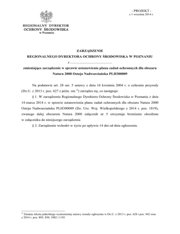 - PROJEKT z 1 września 2014 r. ZARZĄDZENIE REGIONALNEGO DYREKTORA OCHRONY ŚRODOWISKA W POZNANIU z .............................................. zmieniające zarządzenie w sprawie ustanowienia planu zadań ochronnych dla obszaru Natura 2000 Ostoja Nadwarciańska PLH300009 Na podstawie art. 28 ust. 5 ustawy z dnia 16 kwietnia 2004 r. o ochronie przyrody (Dz.U. z 2013 r. poz. 627 z późn. zm.1)) zarządza się, co następuje: § 1. W zarządzeniu Regionalnego Dyrektora Ochrony Środowiska w Poznaniu z dnia 14 marca 2014 r. w sprawie ustanowienia planu zadań ochronnych dla obszaru Natura 2000 Ostoja Nadwarciańska PLH300009 (Dz. Urz. Woj. Wielkopolskiego z 2014 r. poz. 1819), zwanego dalej obszarem Natura 2000 załącznik nr 5 otrzymuje brzmienie określone w załączniku do niniejszego zarządzenia § 2. Zarządzenie wchodzi w życie po upływie 14 dni od dnia ogłoszenia. 1) Zmiany tekstu jednolitego wymienionej ustawy zostały ogłoszone w Dz.U. z 2013 r. poz. 628 i poz. 842 oraz z 2014 r. poz. 805, 850, 1002 i 1101 Załącznik do zarządzenia Regionalnego Dyrektora Ochrony Środowiska w Poznaniu z ................................................ Określenie działań ochronnych ze wskazaniem podmiotów odpowiedzialnych za ich wykonanie i obszarów ich wdrażania Podmiot Lp. Działanie ochronne Obszar wdrażania odpowiedzialny za wykonanie Działania dotyczące ochrony czynnej siedlisk przyrodniczych oraz gatunków roślin i zwierząt i ich siedlisk 1. Działanie obligatoryjne. Płaty siedliska przyrodniczego Sprawujący nadzór Zachowanie siedliska 1340 położone na działkach nad obszarem Natura przyrodniczego położonego na ewid. o nrach 752, 757, obręb 2000 albo właściciel trwałych użytkach zielonych. Białobrzeg, gmina Pyzdry, 126, lub zarządca Ekstensywne użytkowanie 129/4, 122, 137, 141, 142, 143, nieruchomości na kośne, kośno-pastwiskowe lub 144/2, 144/1, 145, 146, 160, podstawie pastwiskowe, trwałych 306, 158, 157, 156, 155, 154, zobowiązania użytków zielonych. 153, 151, 150, 152/2, obręb podjętego w związku Działanie ciągłe realizowane w Trzcianki, gmina Pyzdry, z korzystaniem z okresie obowiązywania planu 6/1,obręb Wrąbczynek, gmina programów wsparcia zadań ochronnych. Pyzdry. z tytułu obniżenia dochodowości 2. Działanie fakultatywne. Płaty siedliska przyrodniczego Sprawujący nadzór Użytkowanie zgodne z 1340 położone na działkach nad obszarem Natura wymogami programu ewid. o nrach: 752, 757, obręb 2000 albo właściciel rolnośrodowiskowego dla Białobrzeg, gmina Pyzdry, 126, lub zarządca siedliska przyrodniczego. 129/4, 122, 137, 141, 142, 143, nieruchomości na Działanie coroczne 144/2, 144/1, 145, 146, 160, podstawie realizowane w okresie 306, 158, 157, 156, 155, 154, zobowiązania obowiązywania planu zadań 153, 151, 150, 152/2, obręb podjętego w związku ochronnych. Trzcianki, gmina Pyzdry, 6/1, z korzystaniem z obręb Wrąbczynek, gmina programów wsparcia Pyzdry. z tytułu obniżenia dochodowości 3. Usuniecie drzew i krzewów. Płaty siedliska przyrodniczego Właściwy miejscowo W drugim roku 2330 w granicach działek ewid. nadleśniczy lub obowiązywania planu zadań o nrach: 879, obręb Wrąbczyn, sprawujący nadzór ochronnych. gmina Zagórów, 209/4, obręb nad obszarem Natura Ponawianie w miarę potrzeb na Wrąbczyn Górski, gmina 2000 podstawie wyników Zagórów, 616, obręb Rataje, monitoringu wskazanego w gmina Pyzdry, 416, 414, 283, działaniu ochronnym nr 28. obręb Pietrzyków, gmina Pyzdry, 353, obręb Wrąbczynek, gmina Pyzdry, 772, obręb Dolne Grądy, gmina Pyzdry, 378/3, obręb Myślibórz, gmi. Golina, 747, 748, obręb Rumin, gmina Stare Miasto oraz płat siedliska w pododdziale 185b, obrębu 4. 5. 6. Usunięcie ekspansywnych gatunków roślin zielnych. W drugim roku obowiązywania planu zadań ochronnych. Ponawianie w miarę potrzeb na podstawie wyników monitoringu wskazanego w działaniu ochronnym nr 28. Zabezpieczenie płatów siedliska przed niszczeniem przez pojazdy. Działanie ciągłe realizowane w okresie obowiązywania planu zadań ochronnych. Zabezpieczenie płatów siedliska przed niszczeniem przez pozyskiwanie piasku. Działanie ciągłe realizowane w okresie obowiązywania planu zadań ochronnych. Kazimierz Biskupi Nadleśnictwa Konin. Płaty siedliska przyrodniczego Sprawujący nadzór 2330 położone na działce ewid. nad obszarem Natura o nrze 879, obręb Wrąbczyn, 2000 gmina Zagórów. Płaty siedliska przyrodniczego 2330 położone na działkach ewid. o nrach: 353, obręb Wrąbczynek, gmina Pyzdry, 209/4, obręb Wrąbczyn Górski, gmina Zagórów. Płaty siedliska przyrodniczego 2330 położone na działkach ewid. o nrach: 353, obręb Wrąbczynek, gmina Pyzdry, 209/4, obręb Wrąbczyn Górski, gmina Zagórów, 191/2, obręb Modła, gmina Rzgów. Płaty siedliska przyrodniczego 4030 położone na działkach ewid. o nrach: 223, obręb Modła, gmina Rzgów, 502, obręb Wrąbczyn, gmina Zagórów, 873, obręb Oleśnica, gmina Zagórów. 7. Działanie obligatoryjne. Zachowanie siedliska przyrodniczego położonego na trwałych użytkach zielonych. Ekstensywne użytkowanie kośne, kośno-pastwiskowe lub pastwiskowe, trwałych użytków zielonych. Działanie ciągłe realizowane w okresie obowiązywania planu zadań ochronnych. 8. Działanie fakultatywne. Wypasanie zgodne z wymogami siedliska. Działanie coroczne realizowane w okresie obowiązywania planu zadań ochronnych. Płaty siedliska przyrodniczego 4030 położone na działkach ewid. o nrach: 223, obręb Modła, gmina Rzgów, 502, obręb Wrąbczyn, gmina Zagórów, 873, obręb Oleśnica, gmina Zagórów. 9. Usuwanie drzew i krzewów. W drugim roku obowiązywania planu zadań ochronnych. Ponawianie w Płaty siedliska przyrodniczego 6120 położone na działce ewid. o nrze 616, obręb Rataje, gmina Pyzdry. Sprawujący nadzór nad obszarem Natura 2000 Sprawujący nadzór nad obszarem Natura 2000 Sprawujący nadzór nad obszarem Natura 