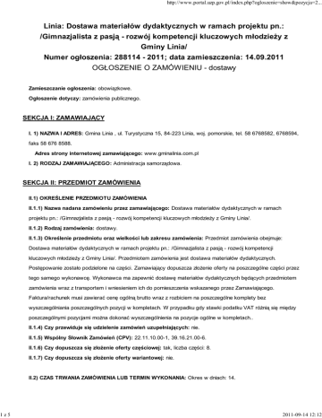 1z5 http://www.portal.uzp.gov.pl/index.php?ogloszenie=show&pozycja=2... Linia: Dostawa materiałów dydaktycznych w ramach projektu pn.: /Gimnazjalista z pasją - rozwój kompetencji kluczowych młodzieży z Gminy Linia/ Numer ogłoszenia: 288114 - 2011; data zamieszczenia: 14.09.2011 OGŁOSZENIE O ZAMÓWIENIU - dostawy Zamieszczanie ogłoszenia: obowiązkowe. Ogłoszenie dotyczy: zamówienia publicznego. SEKCJA I: ZAMAWIAJĄCY I. 1) NAZWA I ADRES: Gmina Linia , ul. Turystyczna 15, 84-223 Linia, woj. pomorskie, tel. 58 6768582, 6768594, faks 58 676 8588. Adres strony internetowej zamawiającego: www.gminalinia.com.pl I. 2) RODZAJ ZAMAWIAJĄCEGO: Administracja samorządowa. SEKCJA II: PRZEDMIOT ZAMÓWIENIA II.1) OKREŚLENIE PRZEDMIOTU ZAMÓWIENIA II.1.1) Nazwa nadana zamówieniu przez zamawiającego: Dostawa materiałów dydaktycznych w ramach projektu pn.: /Gimnazjalista z pasją - rozwój kompetencji kluczowych młodzieży z Gminy Linia/. II.1.2) Rodzaj zamówienia: dostawy. II.1.3) Określenie przedmiotu oraz wielkości lub zakresu zamówienia: Przedmiot zamówienia obejmuje: Dostawa materiałów dydaktycznych w ramach projektu pn.: /Gimnazjalista z pasją - rozwój kompetencji kluczowych młodzieży z Gminy Linia/. Przedmiotem zamówienia jest dostawa materiałów dydaktycznych. Postępowanie zostało podzielone na części. Zamawiający dopuszcza złożenie oferty na poszczególne części przez tego samego wykonawcę. Wykonawca ma zapewnić dostawę materiałów dydaktycznych będących przedmiotem zamówienia wraz z transportem i wniesieniem ich do pomieszczenia wskazanego przez Zamawiającego. Faktura/rachunek musi zawierać cenę ogólną brutto wraz z rozbiciem na poszczególne komplety bez wyszczególniania poszczególnych pozycji w kompletach. W przypadku gdy stawki podatku VAT różnią się między poszczególnymi pozycjami można dokonać wyszczególnienia na pozycje ogólne w kompletach.. II.1.4) Czy przewiduje się udzielenie zamówień uzupełniających: nie. II.1.5) Wspólny Słownik Zamówień (CPV): 22.11.10.00-1, 39.16.21.00-6. II.1.6) Czy dopuszcza się złożenie oferty częściowej: tak, liczba części: 8. II.1.7) Czy dopuszcza się złożenie oferty wariantowej: nie. II.2) CZAS TRWANIA ZAMÓWIENIA LUB TERMIN WYKONANIA: Okres w dniach: 14. 2011-09-14 12:12 2z5 http://www.portal.uzp.gov.pl/index.php?ogloszenie=show&pozycja=2... SEKCJA III: INFORMACJE O CHARAKTERZE PRAWNYM, EKONOMICZNYM, FINANSOWYM I TECHNICZNYM III.2) ZALICZKI Czy przewiduje się udzielenie zaliczek na poczet wykonania zamówienia: nie III.4) INFORMACJA O OŚWIADCZENIACH LUB DOKUMENTACH, JAKIE MAJĄ DOSTARCZYĆ WYKONAWCY W CELU POTWIERDZENIA SPEŁNIANIA WARUNKÓW UDZIAŁU W POSTĘPOWANIU ORAZ NIEPODLEGANIA WYKLUCZENIU NA PODSTAWIE ART. 24 UST. 1 USTAWY III.4.1) W zakresie wykazania spełniania przez wykonawcę warunków, o których mowa w art. 22 ust. 1 ustawy, oprócz oświadczenia o spełnieniu warunków udziału w postępowaniu, należy przedłożyć: III.4.2) W zakresie potwierdzenia niepodlegania wykluczeniu na podstawie art. 24 ust. 1 ustawy, należy przedłożyć: oświadczenie o braku podstaw do wykluczenia aktualny odpis z właściwego rejestru, jeżeli odrębne przepisy wymagają wpisu do rejestru, w celu wykazania braku podstaw do wykluczenia w oparciu o art. 24 ust. 1 pkt 2 ustawy, wystawiony nie wcześniej niż 6 miesięcy przed upływem terminu składania wniosków o dopuszczenie do udziału w postępowaniu o udzielenie zamówienia albo składania ofert, a w stosunku do osób fizycznych oświadczenie w zakresie art. 24 ust. 1 pkt 2 ustawy III.6) INNE DOKUMENTY Inne dokumenty niewymienione w pkt III.4) albo w pkt III.5) 1. Jeżeli Wykonawca nie przedstawia odpisu z właściwego rejestru zobowiązany jest dołączyć do oferty dokument, potwierdzający upoważnienie do podpisania oferty (nie dotyczy osób fizycznych nie prowadzących działalności gospodarczej). 2. Pełnomocnictwo (jeżeli dotyczy) III.7) Czy ogranicza się możliwość ubiegania się o zamówienie publiczne tylko dla wykonawców, u których ponad 50 % pracowników stanowią osoby niepełnosprawne: nie SEKCJA IV: PROCEDURA IV.1) TRYB UDZIELENIA ZAMÓWIENIA IV.1.1) Tryb udzielenia zamówienia: przetarg nieograniczony. IV.2) KRYTERIA OCENY OFERT IV.2.1) Kryteria oceny ofert: najniższa cena. IV.2.2) Czy przeprowadzona będzie aukcja elektroniczna: nie. IV.3) ZMIANA UMOWY Czy przewiduje się istotne zmiany postanowień zawartej umowy w stosunku do treści oferty, na podstawie której dokonano wyboru wykonawcy: nie IV.4) INFORMACJE ADMINISTRACYJNE IV.4.1) Adres strony internetowej, na której jest dostępna specyfikacja istotnych warunków zamówienia: 2011-09-14 12:12 3z5 http://www.portal.uzp.gov.pl/index.php?ogloszenie=show&pozycja=2... www.bip.gminalinia.com.pl Specyfikację istotnych warunków zamówienia można uzyskać pod adresem: Urząd Gminy Linia ul. Turystyczna 15 84-223 Linia Zamawiający naliczy opłatę zgodną z kosztem jej powielenia.. IV.4.4) Termin składania wniosków o dopuszczenie do udziału w postępowaniu lub ofert: 22.09.2011 godzina 10:00, miejsce: Urząd Gminy Linia ul. Turystyczna 15 84-223 Linia sekretariat. IV.4.5) Termin związania ofertą: okres w dniach: 30 (od ostatecznego terminu składania ofert). IV.4.16) Informacje dodatkowe, w tym dotyczące finansowania projektu/programu ze środków Unii Europejskiej: Projekt pn.: /Gimnazjalista z pasją - rozwój kompetencji kluczowych młodzieży z Gminy Linia/ jest współfinansowany ze środków Unii Europejskiej w ramach Europejskiego Funduszu Społecznego, w ramach Programu Operacyjnego Kapitał Ludzki, Priorytet IX - Rozwój wykształcenia i kompetencji w regionach, Poddziałanie 9.1.2. - Wyrównywanie szans edukacyjnych uczniów z grup o utrudnionym dostępie do edukacji oraz zmniejszanie różnic w jakości usług edukacyjnych.. IV.4.17) Czy przewiduje się unieważnienie postępowania o udzielenie zamówienia, w przypadku nieprzyznania 