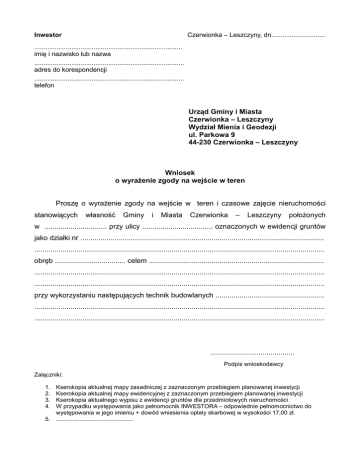 Inwestor Czerwionka – Leszczyny, dn............................. ................................................................................ imię i nazwisko lub nazwa ................................................................................. adres do korespondencji ................................................................................. telefon Urząd Gminy i Miasta Czerwionka – Leszczyny Wydział Mienia i Geodezji ul. Parkowa 9 44-230 Czerwionka – Leszczyny Wniosek o wyrażenie zgody na wejście w teren Proszę o wyrażenie zgody na wejście w teren i czasowe zajęcie nieruchomości stanowiących własność Gminy i Miasta Czerwionka – Leszczyny położonych w ............................... przy ulicy ................................... oznaczonych w ewidencji gruntów jako działki nr ......................................................................................................................... ................................................................................................................................................ obręb ................................... celem ....................................................................................... ................................................................................................................................................ ................................................................................................................................................ przy wykorzystaniu następujących technik budowlanych ...................................................... ................................................................................................................................................ ................................................................................................................................................ .......................................... Podpis wnioskodawcy Załączniki: 1. 2. 3. 4. Kserokopia aktualnej mapy zasadniczej z zaznaczonym przebiegiem planowanej inwestycji Kserokopia aktualnej mapy ewidencyjnej z zaznaczonym przebiegiem planowanej inwestycji Kserokopia aktualnego wypisu z ewidencji gruntów dla przedmiotowych nieruchomości W przypadku występowania jako pełnomocnik INWESTORA – odpowiednie pełnomocnictwo do występowania w jego imieniu + dowód wniesienia opłaty skarbowej w wysokości 17,00 zł. 5. ..............................................