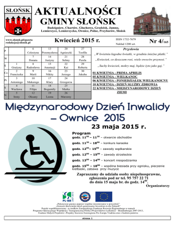 SŁOŃSK AKTUALNOŚCI GMINY SŁOŃSK Budzigniew, Chartów, Głuchowo, Grodzisk, Jamno, Lemierzyce, Lemierzycko, Ownice, Polne, Przyborów, Słońsk Kwiecień 2015 r. www.slonsk.pl/gazeta [email protected] P W 1 Grażyny 2 Cz. Franciszka 3 Pt Antoniego 4 S Wacława 5 N Ireny Ś 6 Celestyna 7 Donata 8 Radosława 9 Marii 10 Makarego 11 Filipa 12 Oksany 13 20 Przemysława Agnieszki 14 Justyny 15 Anastazji 16 Nikity 17 Klary 18 Bogumiły 19 Leona 21 Selmy 22 Kai 23 Jerzego 24 Grzegorza 25 Marka 26 Marzeny Nr 4/165 ISSN 1732-7679 Nakład 1200 szt. Przysłowia 27 Teofila „W kwietniu łagodne kwiatki, w grudniu śnieżne płatki.” 28 Pawła 29 Roberta 30 Jakuba „Kwiecień, co deszczem rosi, wiele owoców przynosi.” „Suchy kwiecień, mokry maj, będzie żyto jako gaj.” 01 KWIETNIA - PRIMA APRILIS 05 KWIETNIA - WIELKANOC 06 KWIETNIA - PONIEDZIAŁEK WIELKANOCNY 10 KWIETNIA - DZIEŃ SŁUŻBY ZDROWIA 22 KWIETNIA - MIĘDZYNARODOWY DZIEŃ ZIEMI 23 maja 2015 r. Program godz. 1100 – 1130 – otwarcie obchodów godz. 1130 – 1800 – konkurs karaoke godz. 1200– 1500 – zawody wędkarskie godz. 1200 – 1500 – zawody strzeleckie godz. 1300 – 1400 – koncert niespodzianka godz. 1500 – 1800 – wspólna biesiada przy ognisku, pieczenie kiełbaski, zabawa przy muzyce Zapraszamy do udziału osoby niepełnosprawne, zgłoszenia pod nr tel. 95 757 22 71 do dnia 15 maja br. do godz. 1400. Organizatorzy „Pokonywać granice poprzez wspólne inwestowanie w przyszłość” „Grenzen überwinden durch gemeinsame Investition in die Zukunft” Projekt współfinansowany ze środków Europejskiego Funduszu Rozwoju Regionalnego w ramach Programu Operacyjnego Współpracy Transgranicznej Polska (Województwo Lubuskie) – Brandenburgia 2007-2013, Fundusz Małych Projektów i Projekty Sieciowe Euroregionu Pro Europa Viadrina oraz z budżetu państwa strona 1 Aktualności Gminy Słońsk kwiecień 2015 strona 2 Nr 4/165 Aktualności Gminy Słońsk kwiecień 2015 Nr 4/165 Zarządzenie Nr 19/2015 Wójta Gminy Słońsk z dnia 16 marca 2015 r. w sprawie wyznaczenia miejsc przeznaczonych na bezpłatne umieszczanie urzędowych obwieszczeń wyborczych i plakatów komitetów wyborczych w trakcie kampanii wyborczej w wyborach Prezydenta Rzeczypospolitej Polskiej w 2015 r. Na podstawie art. 114 ustawy z dnia 5 stycznia 2011 r. - Kodeks wyborczy (Dz. U. z 2011 r. Nr 21, poz. 112 ze zm.) w związku z postanowieniem Marszałka Sejmu Rzeczypospolitej Polskiej z dnia 4 lutego 2015 r. o zarządzeniu wyborów Prezydenta Rzeczypospolitej Polskiej (Dz. U. z 2015 r., poz. 188) zarządzam, co następuje: § 1. Na obszarze Gminy Słońsk na czas kampanii wyborczej w wyborach Prezydenta Rzeczypospolitej Polskiej, zarządzonych na dzień 10 maja 2015 r., do bezpłatnego umieszczania urzędowych obwieszczeń i plakatów komitetów wyborczych, wyznacza się następujące miejsca: 1) 2) 3) 4) 5) 6) 7) 8) 9) 10) 11) 12) 13) 14) 15) 16) 17) SŁUP OGŁOSZENIOWY SŁUP OGŁOSZENIOWY TABLICA OGŁOSZEŃ TABLICA OGŁOSZEŃ TABLICA OGŁOSZEŃ TABLICA OGŁOSZEŃ PRZYSTANEK PKS TABLICA OGŁOSZEŃ TABLICA OGŁOSZEŃ TABLICA OGŁOSZEŃ TABLICA OGŁOSZEŃ TABLICA OGŁOSZEŃ TABLICA OGŁOSZEŃ TABLICA OGŁOSZEŃ TABLICA OGŁOSZEŃ TABLICA OGŁOSZEŃ TABLICA OGŁOSZEŃ - Słońsk ul. Plac Wolności, Słońsk ul. Marszałka Józefa Piłsudskiego, Słońsk, ul. WOP-u, Słońsk, ul. Lipowa, Słońsk, ul. 3-go Lutego, Osiedle PGR Słońsk ul. 3-go Lutego, Słońsk ul. 3-go Lutego, Lemierzyce, ul. Kościuszki, Głuchowo ul. Lemierzycka, Ownice ul. Wolności, Chartów, Przyborów, Jamno, Polne, Lemierzycko, Budzigniew, Grodzisk. § 2. Zarządzenie wchodzi w życie z dniem podpisania. § 3. Zarządzenie podaje się do publicznej wiadomości w sposób zwyczajowo przyjęty oraz w Biuletynie Informacji Publicznej. Wójt Gminy Słońsk (-) Janusz Krzyśków strona 3 Aktualności Gminy Słońsk kwiecień 2015 strona 4 Nr 4/165 Aktualności Gminy Słońsk kwiecień 2015 Nr 4/165 ZASADY FUNKCJONOWANIA PUNKTU SELEKTYWNEGO ZBIERANIA ODPADÓW KOMUNALNYCH (PSZOK) 1. PSZOK zlokalizowany jest przy Zakładzie Gospodarki Wodnościekowej w Słońsku ul. 3-GO LUTEGO 47. 2. PSZOK jest czynny pięć dni w tygodniu 7:00 – 14:30 z wyjątkiem, świąt i dni wolnych od pracy. 3. Właściciele nieruchomości samodzielnie dostarczają do PSZOK i rozładowują selektywnie zebrane odpady komunalne pod kontrolą pracownika PSZOK, który wskazuje miejsce ich zbierania. 4. Selektywnie zebrane odpady komunalne wytworzone na terenie gminy Słońsk i dostarczane do PSZOK, przyjmowane są nieodpłatnie w każdej ilości. 5. W PSZOK zbierane są odpady komunalne tj: TWORZYWA SZTUCZNE - plastikowe obudowy sprzętu AGD i RTV, wiadra, rury, listwy, koszyki plastikowe, skrzynie, beczki, itp. STYROPIAN (czysty, biały) i styropian poremontowy (zmieszany i kolorowy) – kontener, pakujemy osobo czysty, biały od poremontowego we worki własne ODPADY POREMONTOWE (budowlano-remontowe i rozbiórkowe) pochodzące z prowadzenia drobnych prac nie wymagających pozwolenia na budowę: panele; umywalki, brodziki z tworzyw, opakowania po: farbach, silikonach piankach uszczelniających, worki po cemencie itp. MAKULATURA I PAPIER – kontener z klapami GRUZ ZMIESZANY – gruz, cegły, regipsy, kafle, płytki, umywalki i muszle toaletowe ceramiczne itp. SZKŁO WORKI BRĄZOWE (odpady kuchenne) Dodatkowo na odpady, tj.: WEŁNA MINERALNA, WATA SZKLANA - oddajemy we własnych workach *zużyte baterie i akumulatory, PAPA ODPADOWA oddajemy we własnych workach *olej posmażalniczy (spożywczy), olej przepracowany TEKSTYLIA I ODZIEŻ – kontener z klapami *sprzęt oświetleniowy: świetlówki ZIELONYM, NIEBIESKIM I BRĄZOWYM ODPADY ZIELONE – POPAKOWANE W WORKACH (TRAWA) ZUŻYTE OPONY ODPADY WIELKOGABARYTOWE to przedmioty o dużych lub nietypowych rozmiarach, takie jak: meble (szafy, stoły, krzesła, sofy, komody), dywany, wózki dziecięce, suszarki na pranie, deski do prasowania, materace, pierzyny, 