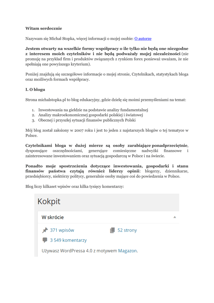 Witam serdecznie Nazywam się Michał Stopka, więcej informacji o mojej osobie: O autorze Jestem otwarty na wszelkie formy współpracy o ile tylko nie będą one niezgodne z interesem moich czytelników i nie będą podważały mojej niezależności (nie promuję na przykład firm i produktów związanych z rynkiem forex ponieważ uważam, że nie spełniają one powyższego kryterium). Poniżej znajdują się szczegółowe informacje o mojej stronie, Czytelnikach, statystykach bloga oraz możliwych formach współpracy. I. O blogu Strona michalstopka.pl to blog edukacyjny, gdzie dzielę się moimi przemyśleniami na temat: 1. Inwestowania na giełdzie na podstawie analizy fundamentalnej 2. Analizy makroekonomicznej gospodarki polskiej i światowej 3. Obecnej i przyszłej sytuacji finansów publicznych Polski Mój blog został założony w 2007 roku i jest to jeden z najstarszych blogów o tej tematyce w Polsce. Czytelnikami bloga w dużej mierze są osoby zarabiające ponadprzeciętnie, dysponujące oszczędnościami, generujące comiesięczne nadwyżki finansowe i zainteresowane inwestowaniem oraz sytuacją gospodarczą w Polsce i na świecie. Ponadto moje spostrzeżenia dotyczące inwestowania, gospodarki i stanu finansów państwa czytają również liderzy opinii: blogerzy, dziennikarze, przedsiębiorcy, niektórzy politycy, generalnie osoby mające coś do powiedzenia w Polsce. Blog liczy kilkaset wpisów oraz kilka tysięcy komentarzy: II. Nagrody i wyróżnienia Finałowa dziesiątka Ekonomiczny Blogu roku 2014: maj 2014; spośród 105 zakwalifikowanych do rywalizacji blogów wewnętrzna komisja portalu money.pl zakwalifikowała mój blog do dziesięciu finalistów Osiem giełdowych blogów, które warto znać: kwiecień 2014; wyróżnienie Gazety Giełdy Parkiet dla ciekawych blogów o inwestowaniu III. Statystyki bloga: 2532 subskrybentów newslettera Google Analytics: dane za okres październik 2014: Liczba unikalnych użytkowników: 13 239 Liczba odwiedzin bloga: 22 502 Liczba odsłon stron bloga: 41 853 Średni czas trwania wizyty: 2 minuty i 32 sekundy Wysoka lojalność: 50% użytkowników to osoby powracające na bloga Prawie 40% czytelników pochodzi z województwa mazowieckiego (Warszawa) 2305 fanów na Facebooku: Michał Stopka Inwestor Profesjonalny Według statystyk Facebooka, które reprezentują niewielką część Czytelników, blog czytają głównie mężczyźni (prawie 80%) i osoby w wieku 25-34 lat (prawie połowa fanów na Facebooku): IV. Potencjalne formy współpracy: 1. Partner artykułu Logo Partnera pojawi się przy artykule, który ukaże się na moim blogu. Usługa obejmuje również rozesłanie informacji o artykule do subskrybentów newslettera oraz w mediach społecznościowych (Facebook). Artykuł będzie zawierał wyraźną informację o Partnerze artykułu wraz z linkiem do wskazanej strony przez Partnera. Nie akceptuję zewnętrznych publikacji: artykuł przy którym pojawi się logo Partnera będzie mojego autorstwa i będzie dotyczył tematyki powiązanej z historycznymi wpisami na moim blogu. 2. Partner bloga Logo Partnera pojawi się na moim blogu przez okres jednego miesiąca (pod zapisem na newsletter po prawej stronie bloga). Ponadto Logo Partnera pojawi się przy dwóch artykułach, które ukażą się na moim blogu. Dokładnie na tych samych zasadach jak opisano w punkcie pierwszym powyżej. 3. Przygotowanie materiałów szkoleniowych, edukacyjnych lub analiz na wybrane tematy Materiały mogą dotyczyć na przykład inwestowania, gospodarki, finansów osobistych lub metod wyceny 4. Szkolenia i prelekcje na wybrane tematy Zakres tematyczny może być związany z szeroko rozumianymi rynkami kapitałowymi i gospodarką. Dzięki mojemu szkoleniu: ”Michał Stopka: praktyczna analiza gospodarki, spółek i wycena firm” mam doświadczenie w pracy z kursantami oraz umiejętność przekazywania w przystępny sposób mojej wiedzy i doświadczenia. Opinie osób, które wzięły udział w moich szkoleniach znajdują się tutaj: Szkolenia: opinie uczestników Jestem również otwarty na wszelkiego rodzaju współpracę niestandardową, szczególnie, że mam bardzo wiele pomysłów w zakresie rozbudowy merytorycznej zawartości mojego bloga V. Cennik Jeżeli jesteś zainteresowany/zainteresowana szczegółowym cennikiem proszę o kontakt. W mailu proszę podać dokładny opis na czym miałaby polegać ewentualna współpraca. Obiecuję, że odpiszę na każdego maila.