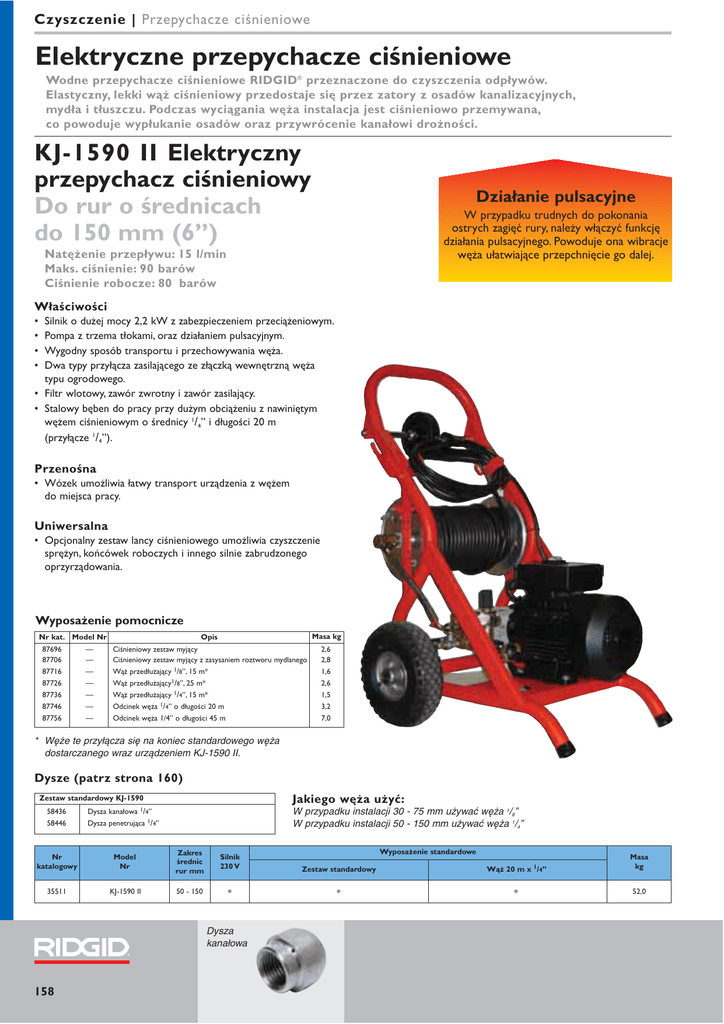 Czyszczenie | Przepychacze ciśnieniowe Elektryczne przepychacze ciśnieniowe Wodne przepychacze ciśnieniowe RIDGID® przeznaczone do czyszczenia odpływów. Elastyczny, lekki wąż ciśnieniowy przedostaje się przez zatory z osadów kanalizacyjnych, mydła i tłuszczu. Podczas wyciągania węża instalacja jest ciśnieniowo przemywana, co powoduje wypłukanie osadów oraz przywrócenie kanałowi drożności. KJ-1590 II Elektryczny przepychacz ciśnieniowy Do rur o średnicach do 150 mm (6”) Działanie pulsacyjne W przypadku trudnych do pokonania ostrych zagięć rury, należy włączyć funkcję działania pulsacyjnego. Powoduje ona wibracje węża ułatwiające przepchnięcie go dalej. Natężenie przepływu: 15 l/min Maks. ciśnienie: 90 barów Ciśnienie robocze: 80 barów Właściwości • • • • Silnik o dużej mocy 2,2 kW z zabezpieczeniem przeciążeniowym. Pompa z trzema tłokami, oraz działaniem pulsacyjnym. Wygodny sposób transportu i przechowywania węża. Dwa typy przyłącza zasilającego ze złączką wewnętrzną węża typu ogrodowego. • Filtr wlotowy, zawór zwrotny i zawór zasilający. • Stalowy bęben do pracy przy dużym obciążeniu z nawiniętym wężem ciśnieniowym o średnicy 1/4” i długości 20 m (przyłącze 1/4”). Przenośna • Wózek umożliwia łatwy transport urządzenia z wężem do miejsca pracy. Uniwersalna • Opcjonalny zestaw lancy ciśnieniowego umożliwia czyszczenie sprężyn, końcówek roboczych i innego silnie zabrudzonego oprzyrządowania. Wyposażenie pomocnicze Opis Masa kg 87696 87706 87716 — — — Ciśnieniowy zestaw myjący Ciśnieniowy zestaw myjący z zasysaniem roztworu mydlanego Wąż przedłużający 1/8”, 15 m* 2,6 2,8 1,6 87726 — Wąż przedłużający1/8”, 25 m* 2,6 87736 — Wąż przedłużający 1/4”, 15 m* 1,5 87746 87756 — — Odcinek węża 1/4” o długości 20 m Odcinek węża 1/4” o długości 45 m 3,2 7,0 Nr kat. Model Nr * WðÎe te przyłàcza sið na koniec standardowego wðÎa dostarczanego wraz urzàdzeniem KJ-1590 II. Dysze (patrz strona 160) Jakiego węża użyć: Zestaw standardowy KJ-1590 58436 Dysza kanałowa 1/4” 58446 Dysza penetrująca 1/4” Nr katalogowy Model Nr Zakres średnic rur mm Silnik 230 V Zestaw standardowy Wąż 20 m x 1/4” 35511 KJ-1590 II 50 - 150 • • • W przypadku instalacji 30 - 75 mm uÎywaç wðÎa 1/8” W przypadku instalacji 50 - 150 mm uÎywaç wðÎa 1/4” Dysza kanałowa 158 Wyposażenie standardowe Masa kg 52,0 Przepychacze ciśnieniowe | Czyszczenie Przepychacze ciśnieniowe z silnikiem benzynowym KJ-2200 Przepychacz ciśnieniowy z silnikiem benzynowym Do rur o średnicach do 150 mm (6”) Natężenie przepływu: 9 l/min. Maks. ciśnienie: 150 barów • Silnik o mocy 5,5 KM; 4-suwowy. • Odporna na korozję głowica pompy z kutego mosiądzu. • Stalowy bęben do pracy przy dużym obciążeniu z nawiniętym wężem ciśnieniowym o średnicy 1/4” i długości 33 m (KJ-2200-C) (przyłącze 1/4”). • Zacisk do łatwego zdejmowania maszyny z wózka. • Działanie pulsacyjne do pokonywania kolanek (nawet 90°). Wyposażenie pomocnicze Patrz strona 160 Zestaw standardowy KJ-2200 49272 48157 64787 Wąż 23 m x 1/8” (przyłącze 1/8”) Zawór nożny Dysza kanałowa 1/4” 64772 Dysza kanałowa 1/8” 64792 Dysza penetrująca 1/4” 64777 Dysza penetrująca 1/8” 64782 Dysza z głowicą przegubową 1/8” Zakres średnic rur mm Nr katalogowy Model Nr 63882 KJ-2200 C 30 - 150 63877 KJ-2200 30 - 150 Jakiego węża użyć: Do czyszczenia rur 30 - 75 mm uÎywaç wðÎa 1/8”, strona 160 Do czyszczenia rur 50 - 150 mm uÎywaç wðÎa 1/4”, strona 160 Wyposażenie standardowe Benzynowy silnik Zestaw standardowy Wózek H-30 Wąż 30 m x 1/4”* • • • • • • Masa kg 66,0 28,5 KJ-3000 Przepychacz ciśnieniowy z silnikiem benzynowym Do rur o średnicach do 200 mm (8”) Natężenie przepływu: 15 l/min. Maks. ciśnienie: 205 barów KJ-3000 jest najwygodniejszym i najbardziej efektywnym, z urządzeń ciśnieniowych do prac ciężkich, dostępnych na rynku. Maszyna umieszczona na zwrotnym, dwukołowym wózku o unikalnej konstrukcji, łatwo mieści się w drzwiach o standardowych rozmiarach i może być wykorzystywana w ciasnych pomieszczeniach. • Idealny do czyszczenia dużych instalacji przemysłowych oraz w obiektach użyteczności publicznej. Replaced by • Trwały silnik o mocy 13 KM; 4-suwowy. KJ-3100 • Odporna na korozję głowica pompy z kutego mosiądzu. • Działanie pulsacyjne do pokonywania kolanek i syfonów. • Stalowy bęben do pracy przy dużym obciążeniu z nawiniętym wężem o średnicy 3/8” i długości 61 m. • Bęben z wężem, dla ułatwienia transportu, można zdjąć z wózka. • NOWOŚĆ: Obecnie zestaw zawiera nóż do korzeni (patrz strona 160). Zestaw standardowy KJ-3000 — 48157 64832 64817 64822 16713 64797 47542 Bębena z wężem 61 m x 3/8” (przyłącze 1/4”) Zawór nożny Wąż do mycia 15 m x 3/8” (przyłącze 1/4”) Dysza z kanałowa 1/4” Dysza penetrująca 1/4” Głowica Root Ranger Lanca do mycia pod ciśnieniem Przyrząd do czyszczenia dysz Nr katalogowy Model Nr Zakres średnic rur mm 64882 KJ-3000 50 - 200 64892 KJ-3000 E 50 - 200 Wyposażenie pomocnicze Patrz strona 160 Jakiego węża użyć: Do czyszczenia rur 50 - 200 mm uÎywaç wðÎa 3/8”, strona 160 Wyposażenie standardowe Benzynowy silnik Zestaw standardowy Rozrusznik elektryczny* • • • • • Masa kg 97,5 102,1 * Akumulator nie jest dołàczany Sterowanie włàczaniem / wyłàczaniem za pomocà pedału zapewnia całkowità kontrolð nad wykonywanymi czynnoÊciami. Obie rðce operatora sà wolne i moÎe on wprowadziç wàÎ ciÊnieniowy do otworu instalacji i manewrowaç nim w celu pokonania kolanek i syfonów. 159 KJ-3100 NE W! KJ-3100 Water Jetter Jets 2” to 10” (50-250mm) Drain Lines The RIDGID® KJ-3100 portable water jetter gives you 205 bar actual working pressure to handle large commerc