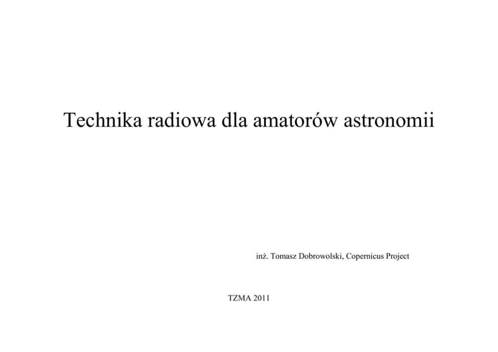 Technika radiowa dla amatorów astronomii inż. Tomasz Dobrowolski, Copernicus Project TZMA 2011 HISTORIA 1831r. - Michal Faraday odkrywa zjawisko indukcji 1864r. – James Clark Maxwell przewiduje istnienie fal radiowych 1887r. – Heinrich Hertz dowód doświadczalny 1895r. – Guglielmo Marconi „telegraf bez drutu” 1902r. – Popow „wykrywacz burz” 1931r. – K.G. Jansky fale radiowe z kosmosu 1952r. – Brown, Hazard linia wodoru FIZYKA PODZIAŁ FAL RADIOWYCH PROPAGACJA FAL ANTENY zysk energetyczny: G = 10 log ( Uout / Uin ) FALE RADIOWE A ATMOSFERA