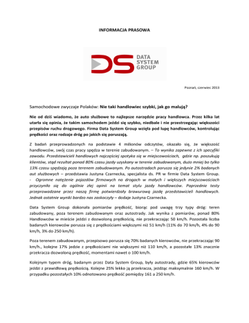 INFORMACJA PRASOWA Poznań, czerwiec 2013 Samochodowe zwyczaje Polaków: Nie taki handlowiec szybki, jak go malują? Nie od dziś wiadomo, że auto służbowe to najlepsze narzędzie pracy handlowca. Przez kilka lat utarła się opinia, że takim samochodem jeździ się szybko, niedbale i nie przestrzegając większości przepisów ruchu drogowego. Firma Data System Group wzięła pod lupę handlowców, kontrolując prędkości oraz rodzaje dróg po jakich się poruszają. Z badań przeprowadzonych na podstawie 4 milionów odczytów, okazało się, że większość handlowców, swój czas pracy spędza w terenie zabudowanym. – To wynika zapewne z ich specyfiki zawodu. Przedstawicieli handlowych najczęściej spotyka się w miejscowościach, gdzie np. poszukują klientów, stąd rezultat ponad 80% czasu jazdy uzyskany w terenie zabudowanym, dużo mniej bo tylko 13% czasu spędzają poza terenem zabudowanym. Po autostradach porusza się jedynie 2% badanych aut służbowych – przedstawia Justyna Czarnecka, specjalista ds. PR w firmie Data System Group. - Ogromne natężenie pojazdów firmowych na drogach w małych i większych miejscowościach przyczyniło się do ogólnie złej opinii na temat stylu jazdy handlowców. Poprzednie testy przeprowadzane przez naszą firmę potwierdzały brawurową jazdę przedstawicieli handlowych. Jednak ostatnie wyniki bardzo nas zaskoczyły – dodaje Justyna Czarnecka. Data System Group dokonała pomiarów prędkość, biorąc pod uwagę trzy typy dróg: teren zabudowany, poza terenem zabudowanym oraz autostrady. Jak wynika z pomiarów, ponad 80% Handlowców w mieście jeździ z dozwoloną prędkością, nie przekraczając 50 km/h. Pozostała liczba badanych kierowców porusza się z prędkościami większymi niż 51 km/h (11% do 70 km/h, 4% do 90 km/h, 3% do 250 km/h). Poza terenem zabudowanym, przepisowo porusza się 70% badanych kierowców, nie przekraczając 90 km/h., kolejne 17% jedzie z prędkościami nie większymi niż 110 km/h, a pozostałe 13% znacznie przekracza dozwoloną prędkość, momentami nawet o 100 km/h. Kolejnym typem dróg, badanym przez Data System Group, były autostrady, gdzie 65% kierowców jeździ z prawidłową prędkością. Kolejne 25% lekko ją przekracza, jeżdżąc maksymalnie 160 km/h. W przypadku pozostałych 10% odnotowano prędkość pomiędzy 161 a 250 km/h. Przedstawione wyniki obalają mit jakoby handlowcy poruszali się autami służbowymi z nadmiernymi prędkościami, nie licząc się z innymi uczestnikami ruchu drogowego. Poprawę tej sytuacji, w porównaniu z poprzednimi badaniami można wytłumaczyć kilkoma istotnymi powodami. Po pierwsze, handlowcy najwyraźniej zrozumieli zagrożenie związane z otrzymaniem punktów karnych, których większa liczba powoduje utratę prawa jazdy, a to automatycznie pozbawia stanowiska pracy i możliwości zdobycia innego zatrudnienia. Coraz częściej w firmach praktykuje się również umowy zawierane z pracownikami użytkującymi pojazd, które nakładają obowiązek przestrzegania określonej prędkości. Jako konsekwencję naruszenia umowy stosuje się m.in. karę w wysokości określonego procentu kwoty z wynagrodzenia miesięcznego. Kolejnym elementem wpływającym na ostrożniejszą jazdę autem firmowym może być umożliwienie pracownikowi korzystania z pojazdu w celach prywatnych. –Firma Data System Group oferuje swoim klientom rozwiązanie oparte o przełącznik jazda służbowa/prywatna, dzięki któremu handlowiec może wykazać w jakich celach użytkuje aktualnie pojazd. Przełącznik jazda służbowa/prywatna stosują również nasi pracownicy. Możliwość korzystania z samochodu po godzinach pracy oraz możliwość automatycznego rozliczenia kierowcy z tego typu przejazdów, sprawia, że użytkownik pojazdu zaczyna bardziej o niego dbać. Handlowiec traktuje auto służbowe jako swój prywatny samochód, który przecież nie może prezentować się gorzej niż auto sąsiada – tłumaczy Justyna Czarnecka. Najistotniejszym czynnikiem wpływającym na rozważną jazdę handlowców może okazać się stosowanie monitoringu GPS. - Coraz więcej firm zaczyna stosować tego typu rozwiązania i to nie tylko, aby kontrolować prędkości pracowników. Dzięki systemom, takim jak DSlocate oferowanym przez naszą firmę, właściciel czy osoba odpowiedzialna za flotę pojazdów może weryfikować czy pracownicy w określonym czasie faktycznie wykonują swoje obowiązki, np. odbywają spotkania z klientami, w jakim stylu prowadzą pojazd czy nawet kontrolować zużyte paliwo, weryfikując bieżące informacje o ilości tankowań lub ewentualnych upuszczeń w danym okresie – wyjaśnia Tomasz Waligóra, Prezes Data System Group. – Monitoring pojazdów to idealne rozwiązanie skutecznej kontroli pracowników, pojazdów i towarów – dodaje Tomasz Waligóra. ………………………………………………………………………………………………………………………….. INFORMACJE O FIRMIE: Firma Data System powstała w 2003 r. Jest producentem oraz dostawcą zaawansowanych technologicznie rozwiązań bazujących na technologii GPS, GSM oraz infrastrukturze sieci komórkowych. Spółka specjalizuje się również w usługach informatycznych, dostarczając dedykowane, inteligentne aplikacje wykorzystujące lokalizacje, monitoring, GPS do zwiększania efektywności i upraszczania przebiegów procesów logistycznych w przedsiębiorstwach. Rozwiązania Data System Group łączone są z wewnętrznymi systemami klienta, tworząc zintegrowane systemy logistyczne. Klientami poznańskiej firmy są m.in. Orlen Transport, PKP Cargo czy Polski Koncern Mięsny Duda. W 2010 r. spółka wypracowała przychody na poziomie 10 mln zł. DODATKOWYCH INFORMACJI UDZIELA: Justyna Czarnecka Data System Group Sp. z o.o. tel. kom. 781 42 42 42 e-mail: [email protected]; www.datasystem.pl