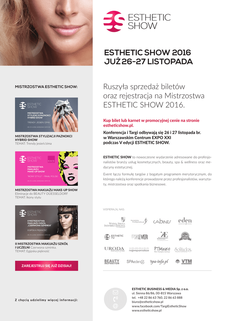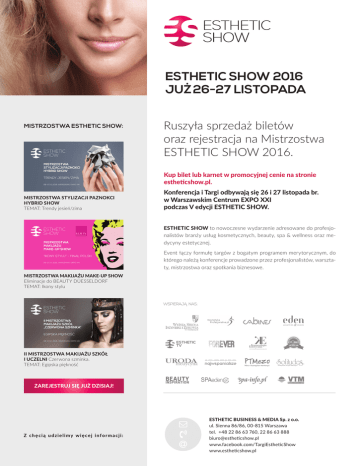 ESTHETIC SHOW 2016 JUŻ 26-27 LISTOPADA MISTRZOSTWA ESTHETIC SHOW: Ruszyła sprzedaż biletów oraz rejestracja na Mistrzostwa ESTHETIC SHOW 2016. Kup bilet lub karnet w promocyjnej cenie na stronie estheticshow.pl. MISTRZOSTWA STYLIZACJI PAZNOKCI HYBRID SHOW TEMAT: Trendy jesień/zima Konferencja i Targi odbywają się 26 i 27 listopada br. w Warszawskim Centrum EXPO XXI podczas V edycji ESTHETIC SHOW. ESTHETIC SHOW to nowoczesne wydarzenie adresowane do profesjonalistów branży usług kosmetycznych, beauty, spa & wellness oraz medycyny estetycznej. Event łączy formułę targów z bogatym programem merytorycznym, do którego należą konferencje prowadzone przez profesjonalistów, warsztaty, mistrzostwa oraz spotkania biznesowe. MISTRZOSTWA MAKIJAŻU MAKE-UP SHOW Eliminacje do BEAUTY DÜESSELDORF TEMAT: Ikony stylu WSPIERAJA˛ NAS: ESTHETIC TV II MISTRZOSTWA MAKIJAŻU SZKÓŁ I UCZELNI Czerwona szminka. TEMAT: Egipska piękność ZAREJESTRUJ SIĘ JUŻ DZISIAJ! Z c h ę c i ą u d z i e l i my w i ę c e j i n f o r m a c j i : ESTHETIC BUSINESS & MEDIA Sp. z o.o. ul. Sienna 86/86, 00-815 Warszawa tel. +48 22 86 63 760, 22 86 63 888 [email protected] www.facebook.com/TargiEstheticShow www.estheticshow.pl