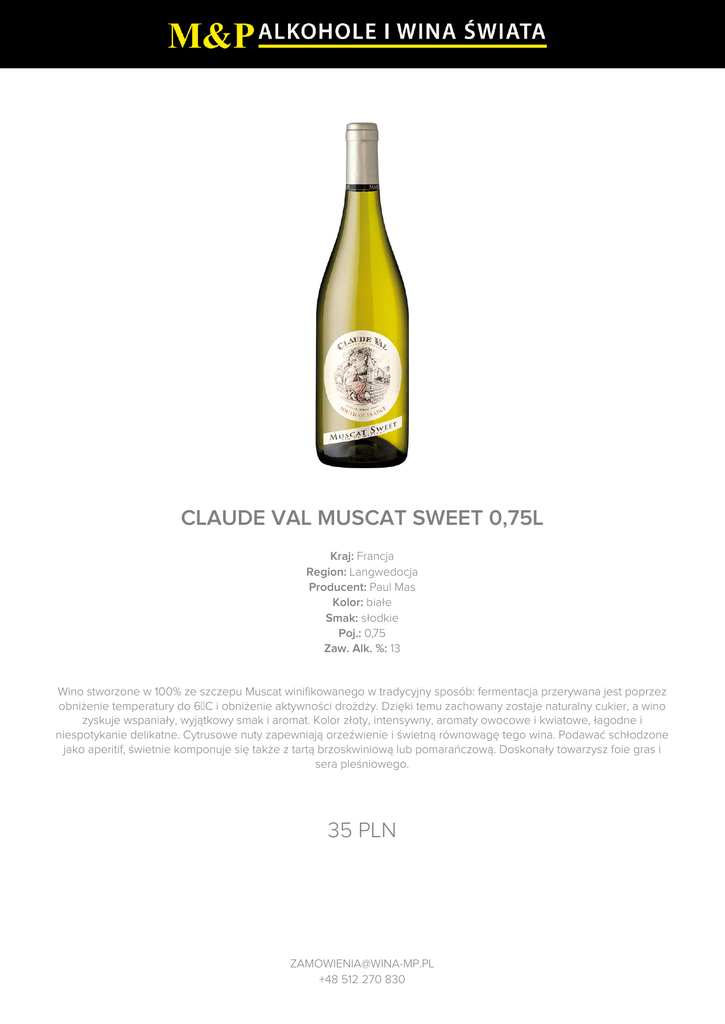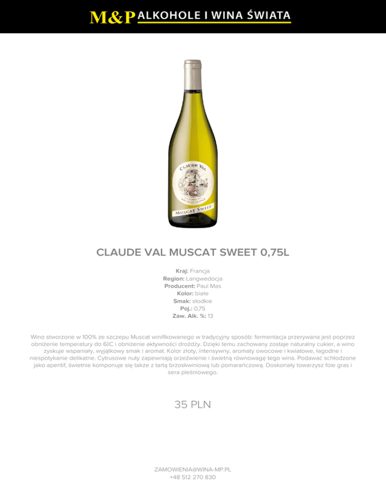 CLAUDE VAL MUSCAT SWEET 0,75L Kraj: Francja Region: Langwedocja Producent: Paul Mas Kolor: białe Smak: słodkie Poj.: 0,75 Zaw. Alk. %: 13 Wino stworzone w 100% ze szczepu Muscat winifikowanego w tradycyjny sposób: fermentacja przerywana jest poprzez obniżenie temperatury do 6°C i obniżenie aktywności drożdży. Dzięki temu zachowany zostaje naturalny cukier, a wino zyskuje wspaniały, wyjątkowy smak i aromat. Kolor złoty, intensywny, aromaty owocowe i kwiatowe, łagodne i niespotykanie delikatne. Cytrusowe nuty zapewniają orzeźwienie i świetną równowagę tego wina. Podawać schłodzone jako aperitif, świetnie komponuje się także z tartą brzoskwiniową lub pomarańczową. Doskonały towarzysz foie gras i sera pleśniowego. 35 PLN [email protected] +48 512 270 830