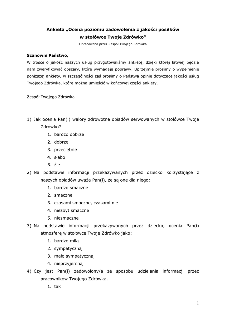 Ankieta „Ocena poziomu zadowolenia z jakości posiłków w stołówce Twoje Zdrówko” Opracowana przez Zespół Twojego Zdrówka Szanowni Państwo, W trosce o jakość naszych usług przygotowaliśmy ankietę, dzięki której łatwiej będzie nam zweryfikować obszary, które wymagają poprawy. Uprzejmie prosimy o wypełnienie poniższej ankiety, w szczególności zaś prosimy o Państwa opinie dotyczące jakości usług Twojego Zdrówka, które można umieścić w końcowej części ankiety. Zespół Twojego Zdrówka 1) Jak ocenia Pan(i) walory zdrowotne obiadów serwowanych w stołówce Twoje Zdrówko? 1. bardzo dobrze 2. dobrze 3. przeciętnie 4. słabo 5. źle 2) Na podstawie informacji przekazywanych przez dziecko korzystające z naszych obiadów uważa Pan(i), że są one dla niego: 1. bardzo smaczne 2. smaczne 3. czasami smaczne, czasami nie 4. niezbyt smaczne 5. niesmaczne 3) Na podstawie informacji przekazywanych przez dziecko, ocenia Pan(i) atmosferę w stołówce Twoje Zdrówko jako: 1. bardzo miłą 2. sympatyczną 3. mało sympatyczną 4. nieprzyjemną 4) Czy jest Pan(i) zadowolony/a ze sposobu udzielania informacji przez pracowników Twojego Zdrówka. 1. tak 1 2. raczej tak 3. raczej nie 4. nie 5) Czy poleciłby Pan(i) obiady Twojego Zdrówka rodzicom innych dzieci? 1. tak 2. nie 3. nie wiem 6) Czy jest Pan(i) zainteresowana otrzymywaniem naszego tygodniowego menu pocztą e-mail? Jeśli tak, prosimy o informację zwrotną na adres: [email protected] 7) Czy ma Pan(i) jakieś propozycje dań do naszego menu? Jeśli tak, prosimy podać ich nazwy. …………………………………………………………………………………………………………………………………… …………………………………………………………………………………………………………………………………… …………………………………………………………………………………………………………………………………… …………………………………………………………………………………………………………………………………… …………………………………………………………………………………………………………………………………… Jeśli mają Państwo, jakieś uwagi dotyczące stołówki Twoje Zdrówko prosimy o maile na adres [email protected], bądź napisanie ich poniżej. …………………………………………………………………………………………………………………………………… …………………………………………………………………………………………………………………………………… …………………………………………………………………………………………………………………………………… …………………………………………………………………………………………………………………………………… …………………………………………………………………………………………………………………………………… …………………………………………………………………………………………………………………………………… …………………………………………………………………………………………………………………………………… …………………………………………………………………………………………………………………………………… …………………………………………………………………………………………………………………………………… …………………………………………………………………………………………………………………………………… Dziękujemy za wypełnienie ankiety. 2