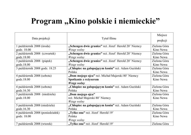 Program „Kino polskie i niemieckie” Data projekcji 1 październik 2008 (środa) godz. 18.00 2 październik 2008 (czwartek) godz.18.00 3 październik 2008 (piątek) godz.18.00 3 październik 2008 godz. 18.25 4 październik 2008 (sobota) godz.18.00 4 październik 2008 (sobota) godz.16.30 5 październik 2008 (niedziela) godz.18.00 5 październik 2008 (niedziela) godz.16.30 6 październik 2008 (poniedziałek) godz. 18.00 7 październik 2008 (wtorek) Tytuł filmu „Schengen dwie granice” reż. Józef Herold 20’ Niemcy Wstęp wolny „Schengen dwie granice” reż. Józef Herold 20’ Niemcy Wstęp wolny „Schengen dwie granice” reż. Józef Herold 20’ Niemcy Wstęp wolny „Chłopiec na galopującym koniu” reż. Adam Guziński Polska „Dom mojego ojca” reż. Michał Majerski 80’ Niemcy Spotkanie z reżyserem Wstęp wolny „Chłopiec na galopującym koniu” reż. Adam Guziński Polska „Dom mojego ojca” reż. Michał Majerski 80’ Niemcy Wstęp wolny „Chłopiec na galopującym koniu” reż. Adam Guziński Polska „Tylko ona” reż. Józef Herold 19’ Polska Wstęp wolny „Tylko ona” reż. Józef Herold 19’ Miejsce projkcji Zielona Góra Kino Newa Zielona Góra Kino Newa Zielona Góra Kino Newa Zielona Góra Kino Newa Zielona Góra Kino Newa Zielona Góra Kino Newa Zielona Góra Kino Newa Zielona Góra Kino Newa Zielona Góra Kino Newa Zielona Góra godz. 18.00 8 październik 2008 (środa) godz. 18.00 9 październik 2008 (czwartek) godz. 18.00 10 październik 2008 (piątek) godz. 18.00 11 październik 2008 (sobota) godz. 16.30 11 październik 2008 (sobota) godz.17.30 11 październik 2008 (sobota) godz.19.00 12 październik 2008 (niedziela) godz. 18.00 13 październik 2008 (poniedziałek) godz. 18.00 14 październik 2008 (wtorek) godz. 18.00 Polska Wstęp wolny „Uśpieni” reż. Wojtek Jagiełło 11’ Polska Wstęp wolny „Uśpieni” reż. Wojtek Jagiełło 11’ Polska Wstęp wolny “Cztery noce z Anną” reż. Jerzy Skolimowski Polska „Hella Hirsch i jej przyjaciele” reż. Barbara Kasper, Lothar Schuster 35’ Niemcy Spotkanie z reżyserami Wstęp wolny „Wszystko jest możliwe” reż. Brygida Dworok-Miech, Drago Hari 70’ Niemcy Spotkanie z reżyserami Wstęp wolny „Harry” reż. Robert Heber 45’ Niemcy Spotkanie z reżyserem Wstęp wolny “Cztery noce z Anną” reż. Jerzy Skolimowski Polska “Cztery noce z Anną” reż. Jerzy Skolimowski Polska “Cztery noce z Anną” reż. Jerzy Skolimowski Polska Kino Newa Zielona Góra Kino Newa Zielona Góra Kino Newa Zielona Góra Kino Newa Zielona Góra Kino Newa Zielona Góra Kino Newa Zielona Góra Kino Newa Zielona Góra Kino Newa Zielona Góra Kino Newa Zielona Góra Kino Newa 15 październik 2008 (środa) godz. 17.00 15 październik 2008 (środa) godz. 18.00 16 październik 2008 (czwartek) godz. 18.00 17 październik 2008 (piątek) godz.17.30 17 październik 2008 (piątek) godz. 18.00 18 październik 2008 (sobota) godz. 17.00 18 październik 2008 (sobota) godz. 18.00 19 październik 2008 (niedziela) godz. 18.00 20 październik 2008 (poniedziałek) godz. 18.00 21 październik 2008 (wtorek) godz. 18.00 22 październik 2008 (środa) godz.18.00 23 październik 2008 (czwartek) godz. 18.00 24 październik 2008 (piątek) „Twoja ulica moja ulica” prezentacja filmów z warsztatów filmowych Wstęp wolny “Cztery noce z Anną” reż. Jerzy Skolimowski Polska “Cztery noce z Anną” reż. Jerzy Skolimowski Polska „Schengen dwie granice” reż. Józef Herold Niemcy Wstęp wolny „Fala” reż. Dennis Gansel Niemcy „Twoja ulica moja ulica” prezentacja filmów z warsztatów filmowych Wstęp wolny „Fala” reż. Dennis Gansel Niemcy „Fala” reż. Dennis Gansel Niemcy „Fala” reż. Dennis Gansel Niemcy „Fala” reż. Dennis Gansel Niemcy „Fala” reż. Dennis Gansel Niemcy „Fala” reż. Dennis Gansel Niemcy „My Cichociemni. Głosy żyjących” reż. Paweł Kędzierski Zielona Góra Kino Newa Zielona Góra Kino Newa Zielona Góra Kino Newa Zielona Góra Kino Newa Zielona Góra Kino Newa Zielona Góra Kino Newa Zielona Góra Kino Newa Zielona Góra Kino Newa Zielona Góra Kino Newa Zielona Góra Kino Newa Zielona Góra Kino Newa Zielona Góra Kino Newa Zielona Góra godz. 19.00 24 październik 2008 godz. 20.00 25 październik 2008 (sobota) godz. 17.00 25 październik 2008 godz. 20.00 26 październik 2008 (niedziela) godz. 17.00 26 październik 2008 godz. 20.00 27 październik 2008 (poniedziałek) godz. 18.00 28 październik 2008 (wtorek) godz. 18.00 29 październik 2008 (wtorek) godz. 17.00 29 październik 2008 (środa) godz. 18.00 30 październik 2008 (czwartek) godz. 18.00 31 październik 2008 (piątek) godz. 17.00 Polska „Rysa” reż. Michał Rosa Polska „My Cichociemni. Głosy żyjących” reż. Paweł Kędzierski Polska „Rysa” reż. Michał Rosa Polska „My Cichociemni. Głosy żyjących” reż. Paweł Kędzierski Polska „Rysa” reż. Michał Rosa Polska „Rysa” reż. Michał Rosa Polska „Rysa” reż. Michał Rosa Polska „Twoja ulica moja ulica” prezentacja filmów z warsztatów filmowych Wstęp wolny „Rysa” reż. Michał Rosa Polska „Rysa” reż. Michał Rosa Polska „Twoja ulica moja ulica” prezentacja filmów z warsztatów filmowych Wstęp wolny Kino Newa Zielona Góra Kino Newa Zielona Góra Kino Newa Zielona Góra Kino Newa Zielona Góra Kino Newa Zielona Góra Kino Newa Zielona Góra Kino Newa Zielona Góra Kino Newa Zielona Góra Kino Newa Zielona Góra Kino Newa Zielona Góra Kino Newa Zielona Góra Kino Newa Projekt współfinansowany jest ze środków Europejskiego Funduszu Rozwoju Regionalnego w ramach Programu Operacyjnego Współpracy Transgranicznej Polska (Województwo Lubuskie) – Kraj Związkowy Brandenburgia 2007-2013, Fundusz Małych Projektów Euroregionalnych Sprewa – Nysa - Bóbr oraz z budżetu państwa. "Zrealizowano przy pomocy finansowej Prezydenta Miasta Zielona Góra"