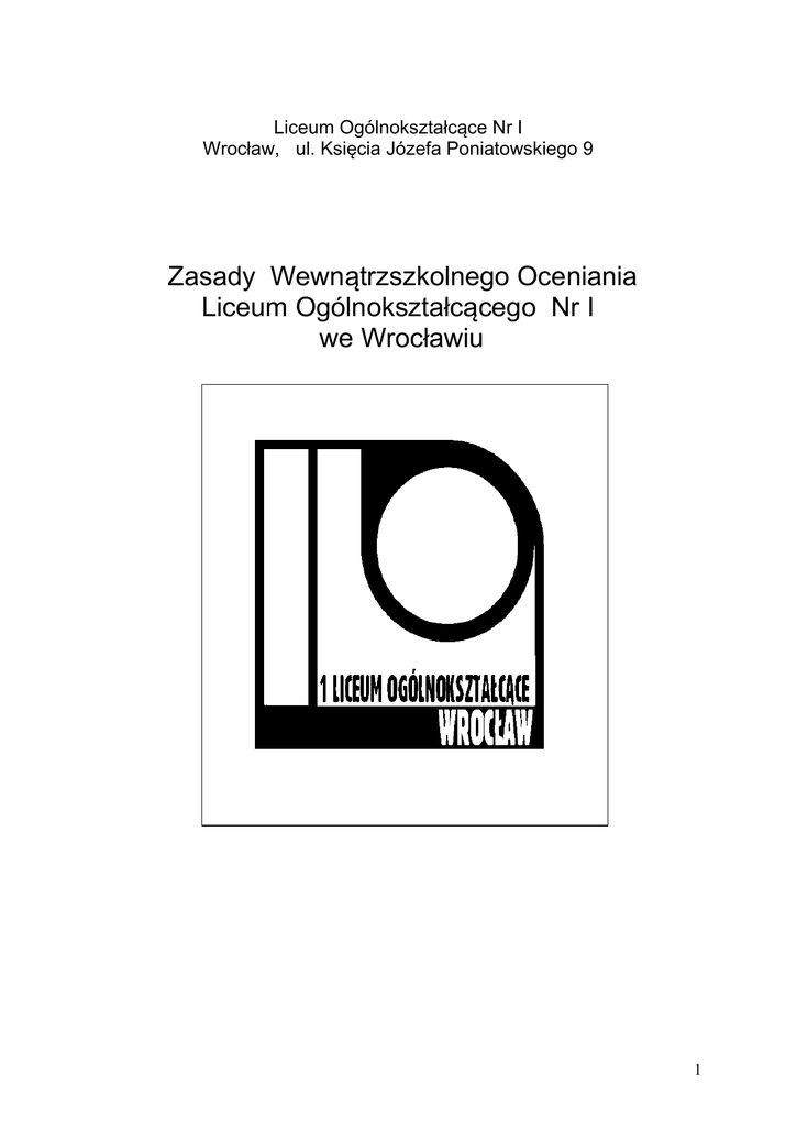 Liceum Ogólnokształcące Nr I Wrocław, ul. Księcia Józefa Poniatowskiego 9 Zasady Wewnątrzszkolnego Oceniania Liceum Ogólnokształcącego Nr I we Wrocławiu 1 Spis treści Rozdział I Podstawa prawna ............................................................ 3 Rozdział II Zakres i cele oceniania wewnątrzszkolnego .............. 3 Rozdział III Szczegółowe zasady oceniania osiągnięć uczniów .. 4 Rozdział IV Tryb i terminy egzaminów ............................................ 12 Rozdział V Kryteria określania oceny zachowania ucznia ............. 15 2 Rozdział I Podstawa prawna §1 Podstawa prawna 1. Rozporządzenie Ministra Edukacji Narodowej z dnia 30.04.2007r. w sprawie warunków i sposobu oceniania, klasyfikowania i promowania uczniów i słuchaczy Dz. U. Z 2007 r. Nr 83, poz. 562 z późniejszymi zmianami. 2. Ustawa o systemie oświaty z dnia 7 września 2001 r. z późniejszymi zmianami czyli ustawą z dnia 20 lutego 2015 r. Dz. U. z 2015 r. pozycja 357, Rozdział II Zakres i cele oceniania wewnątrzszkolnego §2 Zakres oceniania wewnątrzszkolnego 1. Ocenianie wewnątrzszkolne osiągnięć ucznia polega na: 1) rozpoznawaniu przez nauczycieli poziomu i postępów w opanowaniu przez ucznia wiadomości i umiejętności w stosunku do wymagań edukacyjnych wynikających z podstawy programowej oraz formułowaniu oceny, 2) rozpoznawaniu przez nauczycieli poziomu respektowania zapisów prawa wewnątrzszkolnego i formułowaniu oceny zachowania, 3) dokumentowaniu postępów ucznia w nauce i zachowaniu. 2. Ocenianie wewnątrzszkolne obejmuje: 1) formułowanie przez nauczycieli wymagań edukacyjnych oraz informowanie o nich uczniów i rodziców ( prawnych opiekunów ), 2) bieżące, śródroczne i roczne ocenianie według obowiązującej skali ocen i kryteriów oceniania, 3) ustalanie śródrocznych i rocznych ocen klasyfikacyjnych z obowiązkowych zajęć edukacyjnych oraz zachowania, 4) ustalanie ocen klasyfikacyjnych z obowiązkowych zajęć edukacyjnych i zachowania poprzez przeprowadzanie egzaminów i sprawdzianu wiadomości i umiejętności. 3 §3 Cele oceniania wewnątrzszkolnego 1. Informowanie ucznia o poziomie jego osiągnięć i postępach w tym zakresie. 2. Wdrażanie ucznia do systematycznej, samodzielnej pracy oraz samooceny. 3. Pomoc uczniowi w planowaniu jego rozwoju. 4. Motywowanie ucznia do dalszej pracy. 5. Dostarczanie rodzicom ( prawnym opiekunom ) i nauczycielom informacji o postępach, trudnościach i specjalnych uzdolnieniach ucznia. 6. Umożliwienie nauczycielom doskonalenia organizacji i metod pracy dydaktycznowychowawczej. 7.Rozpoznawanie przez wychowawcę klasy, nauczycieli oraz uczniów danej klasy stopnia respektowania przez ucznia zasad współżycia społecznego i norm etycznych. Rozdział III Szczegółowe zasady oceniania osiągnięć uczniów §4 Klasyfikowanie i promowanie uczniów 1. Uczniowie są klasyfikowani dwa razy w ciągu roku: 1) klasyfikacja śródroczna - w grudniu lub styczniu 2) klasyfikacja roczna: klasy III w kwietniu, klasy I i II w czerwcu, z uwzględnieniem wyników egzaminów do 31 sierpnia każdego roku. 2. W szkole obowiązuje punktowy system oceniania. 3. Oceny klasyfikacyjne śródroczne i roczne ustala się według następującej skali: a) ocena niedostateczna - poniżej 45% wymaganych punktów obowiązkowych, b) ocena dopuszczająca - od 45% wymaganych punktów obowiązkowych oraz zaliczenia wskazanych przez nauczycieli danego przedmiotu sprawdzianów na minimum 45%, c) ocena dostateczna - od 55% wymaganych punktów obowiązkowych, d) ocena dobra - od 70% wymaganych punktów obowiązkowych, e) ocena bardzo dobra- od 80% wymaganych punktów obowiązkowych f) ocenę celującą uzyskuje uczeń, który spełnił przynajmniej jeden z trzech wymienionych warunków: 1) w trakcie semestru (całego roku szkolnego) uczeń uzyskał ponad 100 % 4 punktów obowiązkowych i uzyskał minimum 70% punktów za każdy sprawdzian, 2) jest laureatem konkursu przedmiotowego o zasięgu wojewódzkim, 3) jest finalistą olimpiady przedmiotowej. 4. Ze względu na to, że w szkole obowiązuje system punktowy, nauczyciel uzasadnia oceny cząstkowe ze sprawdzianów lub oceny uzyskane podczas egzaminów, podając ilości uzyskanych punktów za poszczególne zadania, wykonane czynności np. obliczeń, ćwiczeń fizycznych, ... Zapis punktowy może być uzupełniony komentarzem w postaci podkreśleń niepoprawnych zapisów ucznia oraz wskazówek nauczyciela pomocnych w planowaniu dalszej pracy ucznia. 5. Stopień ustala nauczyciel prowadzący poszczególne zajęcia edukacyjne. 6. Ocena roczna odpowiada sumie punktów zdobytych w ciągu całego roku. 7. Oceny śródroczne i roczne ustala się w wyniku oceny osiągnięć ucznia poprzez różnorodne formy sprawdzania wiedzy i umiejętności uczniów wymienione w § 5. 8. Dyrektor szkoły zwalnia ucznia z zajęć wychowania fizycznego, informatyki: 1)na podstawie opinii: a) o ograniczonych możliwościach uczestniczenia ucznia w tych zajęciach, b) wydanej przez lekarza, c) na czas określony w w/w opinii., 2) w dokumentacji przebiegu nauczania zamiast oceny klasyfikacyjnej wpisuje się „zwolniony”, 3) zwolniony uczeń ma obowiązek być obecny na zajęciach. 9. Dyrektor szkoły zwalnia ucznia z nauki drugiego języka obcego tylko na podstawie opinii publicznej poradni psychologiczno-pedagogicznej o ograniczonych możliwościach uczestniczenia ucznia w tych zajęciach związanych z wadą słuchu lub z głęboką dysleksją rozwojową: 1) na wniosek prawnych opiekunów ucznia, 2) za zgodą rady pedagogicznej, 3) na czas określony w w/w opinii., 4) w dokumentacji przebiegu nauczania zamiast oceny klasyfikacyjnej wpisuje się „zwolniony”. 10. Uczeń może nie być klasyfikowany z jednego lub kilku przedmiotów, jeżeli brak podstaw do ustalenia oceny rocznej z powodu nieobecności ucznia na zajęciach edukacyjnych przekraczającej połowę czasu przeznaczonego na te zajęcia w szkolnym plani