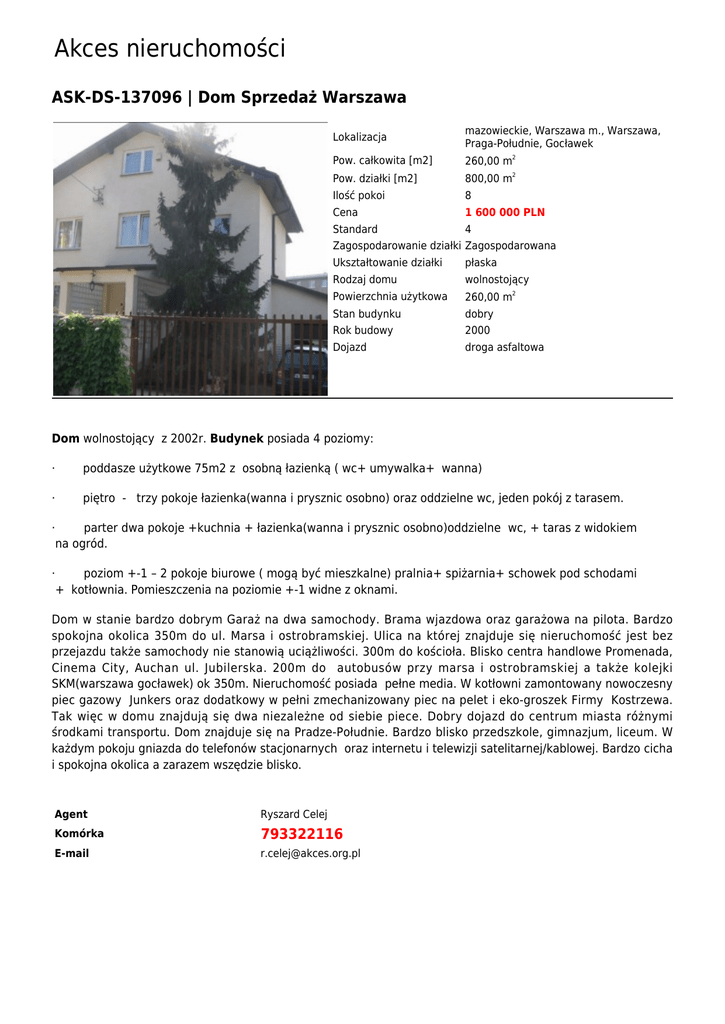Akces nieruchomości ASK-DS-137096 | Dom Sprzedaż Warszawa Lokalizacja mazowieckie, Warszawa m., Warszawa, Praga-Południe, Gocławek Pow. całkowita [m2] 260,00 m2 Pow. działki [m2] 800,00 m2 Ilość pokoi 8 Cena 1 600 000 PLN Standard 4 Zagospodarowanie działki Zagospodarowana Ukształtowanie działki płaska Rodzaj domu wolnostojący Powierzchnia użytkowa 260,00 m2 Stan budynku dobry Rok budowy 2000 Dojazd droga asfaltowa Dom wolnostojący z 2002r. Budynek posiada 4 poziomy: · poddasze użytkowe 75m2 z osobną łazienką ( wc+ umywalka+ wanna) · piętro - trzy pokoje łazienka(wanna i prysznic osobno) oraz oddzielne wc, jeden pokój z tarasem. · parter dwa pokoje +kuchnia + łazienka(wanna i prysznic osobno)oddzielne wc, + taras z widokiem na ogród. · poziom +-1 – 2 pokoje biurowe ( mogą być mieszkalne) pralnia+ spiżarnia+ schowek pod schodami + kotłownia. Pomieszczenia na poziomie +-1 widne z oknami. Dom w stanie bardzo dobrym Garaż na dwa samochody. Brama wjazdowa oraz garażowa na pilota. Bardzo spokojna okolica 350m do ul. Marsa i ostrobramskiej. Ulica na której znajduje się nieruchomość jest bez przejazdu także samochody nie stanowią uciążliwości. 300m do kościoła. Blisko centra handlowe Promenada, Cinema City, Auchan ul. Jubilerska. 200m do autobusów przy marsa i ostrobramskiej a także kolejki SKM(warszawa gocławek) ok 350m. Nieruchomość posiada pełne media. W kotłowni zamontowany nowoczesny piec gazowy Junkers oraz dodatkowy w pełni zmechanizowany piec na pelet i eko-groszek Firmy Kostrzewa. Tak więc w domu znajdują się dwa niezależne od siebie piece. Dobry dojazd do centrum miasta różnymi środkami transportu. Dom znajduje się na Pradze-Południe. Bardzo blisko przedszkole, gimnazjum, liceum. W każdym pokoju gniazda do telefonów stacjonarnych oraz internetu i telewizji satelitarnej/kablowej. Bardzo cicha i spokojna okolica a zarazem wszędzie blisko. Agent Ryszard Celej Komórka 793322116 E-mail [email protected]