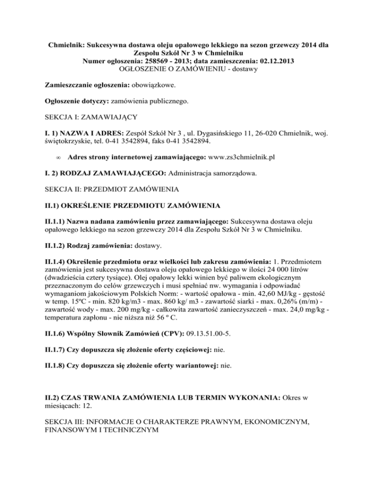 Chmielnik: Sukcesywna dostawa oleju opałowego lekkiego na sezon grzewczy 2014 dla Zespołu Szkół Nr 3 w Chmielniku Numer ogłoszenia: 258569 - 2013; data zamieszczenia: 02.12.2013 OGŁOSZENIE O ZAMÓWIENIU - dostawy Zamieszczanie ogłoszenia: obowiązkowe. Ogłoszenie dotyczy: zamówienia publicznego. SEKCJA I: ZAMAWIAJĄCY I. 1) NAZWA I ADRES: Zespół Szkół Nr 3 , ul. Dygasińskiego 11, 26-020 Chmielnik, woj. świętokrzyskie, tel. 0-41 3542894, faks 0-41 3542894. • Adres strony internetowej zamawiającego: www.zs3chmielnik.pl I. 2) RODZAJ ZAMAWIAJĄCEGO: Administracja samorządowa. SEKCJA II: PRZEDMIOT ZAMÓWIENIA II.1) OKREŚLENIE PRZEDMIOTU ZAMÓWIENIA II.1.1) Nazwa nadana zamówieniu przez zamawiającego: Sukcesywna dostawa oleju opałowego lekkiego na sezon grzewczy 2014 dla Zespołu Szkół Nr 3 w Chmielniku. II.1.2) Rodzaj zamówienia: dostawy. II.1.4) Określenie przedmiotu oraz wielkości lub zakresu zamówienia: 1. Przedmiotem zamówienia jest sukcesywna dostawa oleju opałowego lekkiego w ilości 24 000 litrów (dwadzieścia cztery tysiące). Olej opałowy lekki winien być paliwem ekologicznym przeznaczonym do celów grzewczych i musi spełniać nw. wymagania i odpowiadać wymaganiom jakościowym Polskich Norm: - wartość opałowa - min. 42,60 MJ/kg - gęstość w temp. 15ºC - min. 820 kg/m3 - max. 860 kg/ m3 - zawartość siarki - max. 0,26% (m/m) zawartość wody - max. 200 mg/kg - całkowita zawartość zanieczyszczeń - max. 24,0 mg/kg temperatura zapłonu - nie niższa niż 56 º C. II.1.6) Wspólny Słownik Zamówień (CPV): 09.13.51.00-5. II.1.7) Czy dopuszcza się złożenie oferty częściowej: nie. II.1.8) Czy dopuszcza się złożenie oferty wariantowej: nie. II.2) CZAS TRWANIA ZAMÓWIENIA LUB TERMIN WYKONANIA: Okres w miesiącach: 12. SEKCJA III: INFORMACJE O CHARAKTERZE PRAWNYM, EKONOMICZNYM, FINANSOWYM I TECHNICZNYM III.1) WADIUM Informacja na temat wadium: Nie jest wymagane wniesienie wadium ani zabezpieczenia należytego wykonania umowy. III.2) ZALICZKI III.3) WARUNKI UDZIAŁU W POSTĘPOWANIU ORAZ OPIS SPOSOBU DOKONYWANIA OCENY SPEŁNIANIA TYCH WARUNKÓW • III. 3.1) Uprawnienia do wykonywania określonej działalności lub czynności, jeżeli przepisy prawa nakładają obowiązek ich posiadania Opis sposobu dokonywania oceny spełniania tego warunku Ocena spełnienia warunków szczegółowych nastąpi na podstawie przedstawionych przez Wykonawcę dokumentów i oświadczeń. Zamawiający przy ocenie spełnienia warunków udziału w postępowaniu zastosuje formułę spełnia / nie spełnia. Nie spełnienie chociażby jednego z w/w warunków skutkować będzie wykluczeniem Wykonawcy z postępowania. III.3.2) Wiedza i doświadczenie o • Opis sposobu dokonywania oceny spełniania tego warunku W celu potwierdzenia spełnienia warunków określonych w pkt VI .1.2. Wykonawca ma obowiązek złożyć oświadczenie według wzoru określonego w załączniku nr 2 do SIWZ. III.3.3) Potencjał techniczny o • Opis sposobu dokonywania oceny spełniania tego warunku W celu potwierdzenia spełnienia warunków określonych w pkt VI .1.3. Wykonawca ma obowiązek złożyć oświadczenie według wzoru określonego w załączniku nr 2 do SIWZ. III.3.4) Osoby zdolne do wykonania zamówienia o • Opis sposobu dokonywania oceny spełniania tego warunku W celu potwierdzenia spełnienia warunków określonych w pkt VI .1.3. Wykonawca ma obowiązek złożyć oświadczenie według wzoru określonego w załączniku nr 2 do SIWZ. III.3.5) Sytuacja ekonomiczna i finansowa o • Opis sposobu dokonywania oceny spełniania tego warunku o W celu potwierdzenia spełnienia warunków określonych w pkt VI .1.4. Wykonawca ma obowiązek złożyć oświadczenie według wzoru określonego w załączniku nr 2 do SIWZ. III.4) INFORMACJA O OŚWIADCZENIACH LUB DOKUMENTACH, JAKIE MAJĄ DOSTARCZYĆ WYKONAWCY W CELU POTWIERDZENIA SPEŁNIANIA WARUNKÓW UDZIAŁU W POSTĘPOWANIU ORAZ NIEPODLEGANIA WYKLUCZENIU NA PODSTAWIE ART. 24 UST. 1 USTAWY III.4.1) W zakresie wykazania spełniania przez wykonawcę warunków, o których mowa w art. 22 ust. 1 ustawy, oprócz oświadczenia o spełnianiu warunków udziału w postępowaniu należy przedłożyć: • potwierdzenie posiadania uprawnień do wykonywania określonej działalności lub czynności, jeżeli przepisy prawa nakładają obowiązek ich posiadania, w szczególności koncesje, zezwolenia lub licencje; III.4.2) W zakresie potwierdzenia niepodlegania wykluczeniu na podstawie art. 24 ust. 1 ustawy, należy przedłożyć: • oświadczenie o braku podstaw do wykluczenia; • aktualny odpis z właściwego rejestru lub z centralnej ewidencji i informacji o działalności gospodarczej, jeżeli odrębne przepisy wymagają wpisu do rejestru lub ewidencji, w celu wykazania braku podstaw do wykluczenia w oparciu o art. 24 ust. 1 pkt 2 ustawy, wystawiony nie wcześniej niż 6 miesięcy przed upływem terminu składania wniosków o dopuszczenie do udziału w postępowaniu o udzielenie zamówienia albo składania ofert; • aktualne zaświadczenie właściwego naczelnika urzędu skarbowego potwierdzające, że wykonawca nie zalega z opłacaniem podatków, lub zaświadczenie, że uzyskał przewidziane prawem zwolnienie, odroczenie lub rozłożenie na raty zaległych płatności lub wstrzymanie w całości wykonania decyzji właściwego organu wystawione nie wcześniej niż 3 miesiące przed upływem terminu składania wniosków o dopuszczenie do udziału w postępowaniu o udzielenie zamówienia albo składania ofert; • aktualne zaświadczenie właściwego oddziału Zakładu Ubezpieczeń Społecznych lub Kasy Rolniczego Ubezpieczenia Społecznego potwierdzające, że wykonawca nie zalega z opłacaniem składek na ubezpieczenia zdrowotne i społeczne, lub potwierdzenie, że uzyskał przewidziane prawem zwolnienie, odroczenie lub rozłożenie na raty zaległych płatności lub wstrzymanie w całości wykonania decyzji właściwego organu - wystawione nie wcze