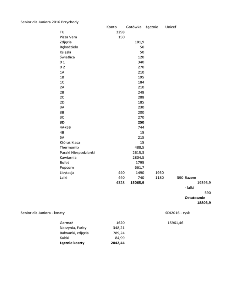 Senior dla Juniora 2016 Przychody TU Pizza Vera Zdjęcia Rękodzielo Książki Świetlica 01 02 1A 1B 1C 2A 2B 2C 2D 3A 3B 3C 3D 4A+5B 4B 5A Któraś klasa Thermomix Paczki Niespodzianki Kawiarnia Bufet Popcorn Licytacja Lalki Konto Gotówka Łącznie Unicef 3298 150 181,9 50 50 120 340 270 210 195 184 210 248 288 185 230 200 270 250 744 15 215 15 488,5 2615,3 2804,5 1795 661,7 440 1490 1930 440 740 1180 590 Razem 4328 15065,9 19393,9 - lalki 590 Ostatecznie 18803,9 Senior dla Juniora - koszty Garmaż Naczynia, Farby Bałwanki, zdjęcia Kubki Łącznie koszty SDJ2016 - zysk 1620 348,21 789,24 84,99 2842,44 15961,46