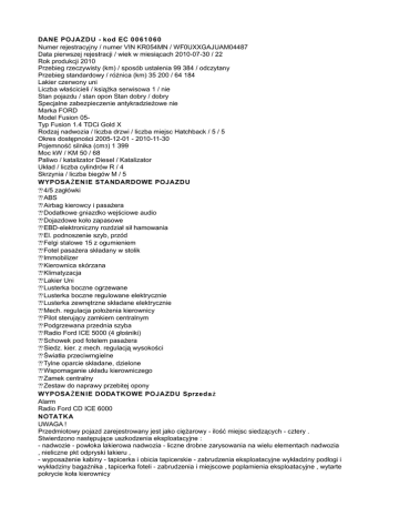 DANE POJAZDU - kod EC 0 0 6 1 0 6 0 Numer rejestracyjny / numer VIN KR054MN / WF0UXXGAJUAM04487 Data pierwszej rejestracji / wiek w miesiącach 2010-07-30 / 22 Rok produkcji 2010 Przebieg rzeczywisty (km) / sposób ustalenia 99 384 / odczytany Przebieg standardowy / różnica (km) 35 200 / 64 184 Lakier czerwony uni Liczba właścicieli / książka serwisowa 1 / nie Stan pojazdu / stan opon Stan dobry / dobry Specjalne zabezpieczenie antykradzieżowe nie Marka FORD Model Fusion 05Typ Fusion 1.4 TDCi Gold X Rodzaj nadwozia / liczba drzwi / liczba miejsc Hatchback / 5 / 5 Okres dostępności 2005-12-01 - 2010-11-30 Pojemność silnika (cm3) 1 399 Moc kW / KM 50 / 68 Paliwo / katalizator Diesel / Katalizator Układ / liczba cylindrów R / 4 Skrzynia / liczba biegów M / 5 WYPOSA Ż ENIE STANDARDOWE POJAZDU ?? 4/5 zagłówki ?? ABS ?? Airbag kierowcy i pasażera ?? Dodatkowe gniazdko wejściowe audio ?? Dojazdowe koło zapasowe ?? EBD-elektroniczny rozdział sił hamowania ?? El. podnoszenie szyb, przód ?? Felgi stalowe 15 z ogumieniem ?? Fotel pasażera składany w stolik ?? Immobilizer ?? Kierownica skórzana ?? Klimatyzacja ?? Lakier Uni ?? Lusterka boczne ogrzewane ?? Lusterka boczne regulowane elektrycznie ?? Lusterka zewnętrzne składane elektrycznie ?? Mech. regulacja położenia kierownicy ?? Pilot sterujący zamkiem centralnym ?? Podgrzewana przednia szyba ?? Radio Ford ICE 5000 (4 głośniki) ?? Schowek pod fotelem pasażera ?? Siedz. kier. z mech. regulacją wysokości ?? Światła przeciwmgielne ?? Tylne oparcie składane, dzielone ?? Wspomaganie układu kierowniczego ?? Zamek centralny ?? Zestaw do naprawy przebitej opony WYPOSA Ż ENIE DODATKOWE POJAZDU Sprzeda ż Alarm Radio Ford CD ICE 6000 NOTATKA UWAGA ! Przedmiotowy pojazd zarejestrowany jest jako ciężarowy - ilość miejsc siedzących - cztery . Stwierdzono następujące uszkodzenia eksploatacyjne : - nadwozie - powłoka lakierowa nadwozia - liczne drobne zarysowania na wielu elementach nadwozia , nieliczne pkt odpryski lakieru , - wyposażenie kabiny - tapicerka i obicia tapicerskie - zabrudzenia eksploatacyjne wykładziny podłogi i wykładziny bagażnika , tapicerka foteli - zabrudzenia i miejscowe poplamienia eksploatacyjne , wytarte pokrycie koła kierownicy - zderzak przedni - narożnik prawy - porysowany pościerany i pkt odpryski - pokrywa przednia - odpryski lakieru , drobne zarysowania - błotnik przedni prawy - nieznaczna różnica w odcieniu powłoki lakierowej , nieprawidłowe spasowanie błotnika z reflektorem przednim prawym - prawdopodobna naprawa lakiernicza błotnika , - lusterka boczne lewe i prawe - obudowy zarysowane - drzwi tylne prawe - w tylnej części nieznacznie zagniecione i zarysowane - błotnik tylny prawy - w dolnej części nieznacznie wgnieciony ,pościerany ślady zaprawki lakierniczej - zderzak tylny - w części środkowej wgnieciony , drobne zarysowania i otarcia - opony kół - BF GOODRICH 195/60 R 15 - średnie zużycie eksploatacyjne bieżników opon , - jest koło zapasowe Wykonano pomiary grubości powłoki lakierowej nadwozia elektronicznym przyrządem pomiarowym i nie stwierdzono podwyższonej grubość powłoki lakierowej na żadnym elemencie nadwozia . Jednak nieznaczna różnica w odcieniu koloru lakieru na błotniku przednim prawym i złe spasowanie blotnika wskazują , że prawdopodobnie doszło do co najmniej naprawy lakierniczej błotnika przedniego prawego - pojazd po naprawie W przedstawionej książce gwarancyjnej brak jest aktualnego wpisu o wykonaniu przeglądu gwarancyjnego w ASO FORD , ostatni wpis przy przebiegu 20.023 km w dniu 23.11.2010 r. , jest tylko jeden kpl kluczyków.