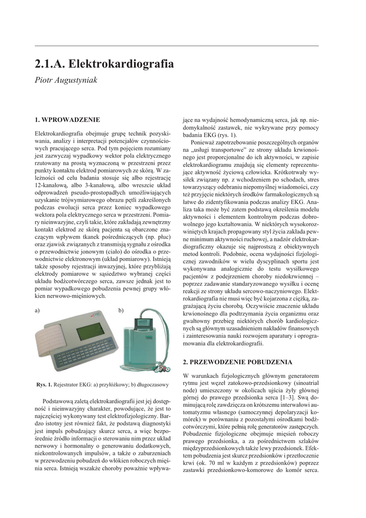 2.1.A. Elektrokardiografia Piotr Augustyniak 1. WPROWADZENIE Elektrokardiografia obejmuje grupê technik pozyskiwania, analizy i interpretacji potencja³ów czynnoœciowych pracuj¹cego serca. Pod tym pojêciem rozumiany jest zazwyczaj wypadkowy wektor pola elektrycznego rzutowany na prost¹ wyznaczon¹ w przestrzeni przez punkty kontaktu elektrod pomiarowych ze skór¹. W zale¿noœci od celu badania stosuje siê albo rejestracjê 12-kana³ow¹, albo 3-kana³ow¹, albo wreszcie uk³ad odprowadzeñ pseudo-prostopad³ych umo¿liwiaj¹cych uzyskanie trójwymiarowego obrazu pêtli zakreœlonych podczas ewolucji serca przez koniec wypadkowego wektora pola elektrycznego serca w przestrzeni. Pomiary nieinwazyjne, czyli takie, które zak³adaj¹ zewnêtrzny kontakt elektrod ze skór¹ pacjenta s¹ obarczone znacz¹cym wp³ywem tkanek poœrednicz¹cych (np. p³uc) oraz zjawisk zwi¹zanych z transmisj¹ sygna³u z oœrodka o przewodnictwie jonowym (cia³o) do oœrodka o przewodnictwie elektronowym (uk³ad pomiarowy). Istniej¹ tak¿e sposoby rejestracji inwazyjnej, które przybli¿aj¹ elektrody pomiarowe w s¹siedztwo wybranej czêœci uk³adu bodŸcotwórczego serca, zawsze jednak jest to pomiar wypadkowego pobudzenia pewnej grupy w³ókien nerwowo-miêœniowych. a) b) j¹ce na wydajnoœæ hemodynamiczn¹ serca, jak np. niedomykalnoœæ zastawek, nie wykrywane przy pomocy badania EKG (rys. 1). Poniewa¿ zapotrzebowanie poszczególnych organów na „us³ugi transportowe” ze strony uk³adu krwionoœnego jest proporcjonalne do ich aktywnoœci, w zapisie elektrokardiogramu znajduj¹ siê elementy reprezentuj¹ce aktywnoœæ ¿yciow¹ cz³owieka. Krótkotrwa³y wysi³ek zwi¹zany np. z wchodzeniem po schodach, stres towarzysz¹cy odebraniu niepomyœlnej wiadomoœci, czy te¿ przyjêcie niektórych œrodków farmakologicznych s¹ ³atwe do zidentyfikowania podczas analizy EKG. Analiza taka mo¿e byæ zatem podstaw¹ okreœlenia modelu aktywnoœci i elementem kontrolnym podczas dobrowolnego jego kszta³towania. W niektórych wysokorozwiniêtych krajach propagowany styl ¿ycia zak³ada pewne minimum aktywnoœci ruchowej, a nadzór elektrokardiograficzny okazuje siê najprostsz¹ z obiektywnych metod kontroli. Podobnie, ocena wydajnoœci fizjologicznej zawodników w wielu dyscyplinach sportu jest wykonywana analogicznie do testu wysi³kowego pacjentów z podejrzeniem choroby niedokrwiennej – poprzez zadawanie standaryzowanego wysi³ku i ocenê reakcji ze strony uk³adu sercowo-naczyniowego. Elektrokardiografia nie musi wiêc byæ kojarzona z ciê¿k¹, zagra¿aj¹c¹ ¿yciu chorob¹. Oczywiœcie znaczenie uk³adu krwionoœnego dla podtrzymania ¿ycia organizmu oraz gwa³towny przebieg niektórych chorób kardiologicznych s¹ g³ównym uzasadnieniem nak³adów finansowych i zainteresowania nauki rozwojem aparatury i oprogramowania dla elektrokardiografii. 2. PRZEWODZENIE POBUDZENIA Rys. 1. Rejestrator EKG: a) przy³ó¿kowy; b) d³ugoczasowy Podstawow¹ zalet¹ elektrokardiografii jest jej dostêpnoœæ i nieinwazyjny charakter, powoduj¹ce, ¿e jest to najczêœciej wykonywany test elektrofizjologiczny. Bardzo istotny jest równie¿ fakt, ¿e podstaw¹ diagnostyki jest impuls pobudzaj¹cy skurcz serca, a wiêc bezpoœrednie Ÿród³o informacji o sterowaniu nim przez uk³ad nerwowy i hormonalny o generowaniu dodatkowych, niekontrolowanych impulsów, a tak¿e o zaburzeniach w przewodzeniu pobudzeñ do w³ókien roboczych miêœnia serca. Istniej¹ wszak¿e choroby powa¿nie wp³ywa- W warunkach fizjologicznych g³ównym generatorem rytmu jest wêze³ zatokowo-przedsionkowy (sinoatrial node) umieszczony w okolicach ujœcia ¿y³y g³ównej górnej do prawego przedsionka serca [1–3]. Sw¹ dominuj¹c¹ rolê zawdziêcza on krótszemu interwa³owi automatyzmu w³asnego (samoczynnej depolaryzacji komórek) w porównaniu z pozosta³ymi oœrodkami bodŸcotwórczymi, które pe³ni¹ rolê generatorów zastêpczych. Pobudzenie fizjologiczne obejmuje miêsieñ roboczy prawego przedsionka, a za poœrednictwem szlaków miêdzyprzedsionkowych tak¿e lewy przedsionek. Efektem pobudzenia jest skurcz przedsionków i przet³oczenie krwi (ok. 70 ml w ka¿dym z przedsionków) poprzez zastawki przedsionkowo-komorowe do komór serca. Piotr Augustyniak Elektrokardiografia Równoczeœnie z akcj¹ mechaniczn¹ przedsionków pobudzenie jest przewodzone szlakiem miêdzywêz³owym podstawowym (Bachmanna) lub którymœ z zapasowych (Wenckebacha lub Thorela) do wêz³a przedsionkowo-komorowego (atrioventricular node). Wêze³ ten le¿y na granicy przedsionków i komór serca na przegrodzie oddzielaj¹cej praw¹ i lew¹ jego stronê w geometrycznym centrum serca. Szczególn¹ cech¹ wêz³a AV jest bardzo niewielka prêdkoœæ przewodzenia bodŸców. Podczas, gdy w pozosta³ych czêœciach uk³adu bodŸcoprzewodz¹cego wynosi ona ok. 4 m/s, w komórkach wêz³a AV prêdkoœæ ta wynosi zaledwie 0,05 m/s. Na d³ugoœci szlaku przewodzenia zwi¹zanej z rozmiarami wêz³a powstaje wiêc „linia opóŸniaj¹ca” bodziec o ok. 120 ms. OpóŸnienie to zapewnia synchroniczn¹ pracê przedsionków i komór serca, a jednoczeœnie wystarczaj¹ca iloœæ czasu na przemieszczenie 140 g krwi z przedsionków do komór. Z wêz³a przedsionkowo-komorowego pobudzenie jest przewodzone pêczkiem Hisa w przegrodzie miêdzykomorowej. Pocz¹tkowy jego odcinek posiada zdolnoœæ automatyzmu w³asnego o czêstotliwoœci ok. 50/min i mo¿e pe³niæ rolê zapasowego generatora rytmu. Ok. 1 cm poni¿ej wêz³a AV pêczek Hisa rozga³êzia siê na wi¹zkê praw¹ i lew¹, nastêpnie od wi¹zki lewej odga³êzia siê jeszcze wi¹zka przednia obejmuj¹c œcianê komory lewej. Wi¹zki prawa i lewa przewodz¹ pobudzenie do koniuszka serca gdzie nastêpuje ich obfite rozga³êzianie w postaci tzw. w³ókien Purkiniego wstêpuj¹cych po obu zewnêtrznych œcianach miêœnia roboczego komór. W³ókna Purkiniego s¹ ostatnim elementem uk³adu bodŸcoprzewodz