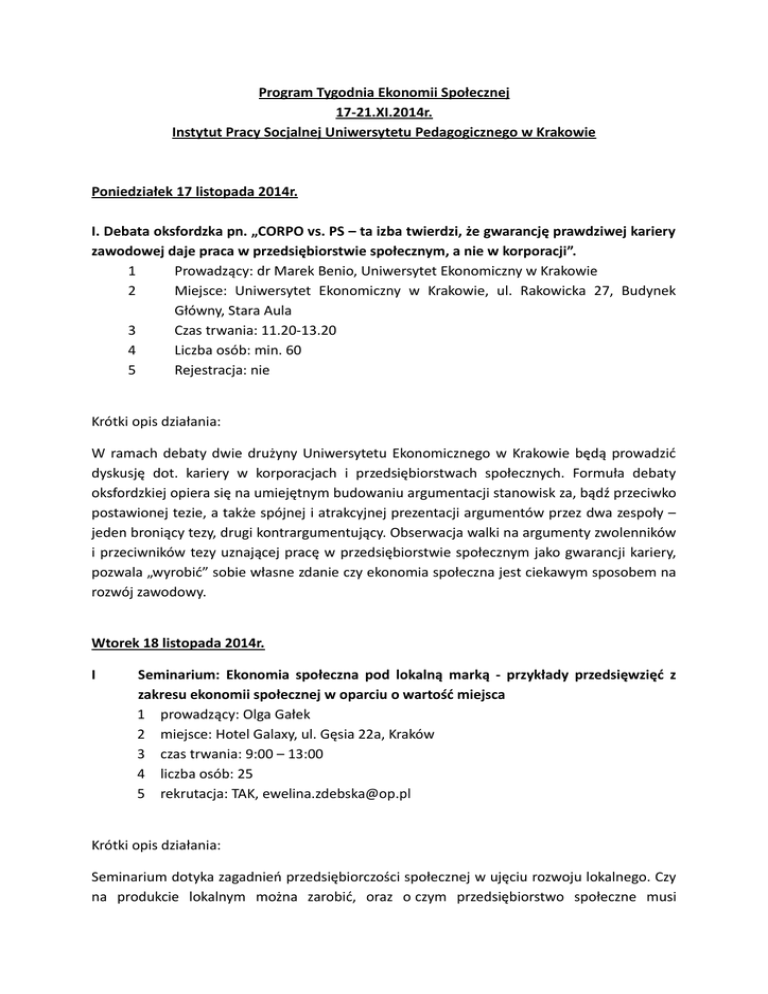 Program Tygodnia Ekonomii Społecznej 17-21.XI.2014r. Instytut Pracy Socjalnej Uniwersytetu Pedagogicznego w Krakowie Poniedziałek 17 listopada 2014r. I. Debata oksfordzka pn. „CORPO vs. PS – ta izba twierdzi, że gwarancję prawdziwej kariery zawodowej daje praca w przedsiębiorstwie społecznym, a nie w korporacji”. 1 Prowadzący: dr Marek Benio, Uniwersytet Ekonomiczny w Krakowie 2 Miejsce: Uniwersytet Ekonomiczny w Krakowie, ul. Rakowicka 27, Budynek Główny, Stara Aula 3 Czas trwania: 11.20-13.20 4 Liczba osób: min. 60 5 Rejestracja: nie Krótki opis działania: W ramach debaty dwie drużyny Uniwersytetu Ekonomicznego w Krakowie będą prowadzić dyskusję dot. kariery w korporacjach i przedsiębiorstwach społecznych. Formuła debaty oksfordzkiej opiera się na umiejętnym budowaniu argumentacji stanowisk za, bądź przeciwko postawionej tezie, a także spójnej i atrakcyjnej prezentacji argumentów przez dwa zespoły – jeden broniący tezy, drugi kontrargumentujący. Obserwacja walki na argumenty zwolenników i przeciwników tezy uznającej pracę w przedsiębiorstwie społecznym jako gwarancji kariery, pozwala „wyrobić” sobie własne zdanie czy ekonomia społeczna jest ciekawym sposobem na rozwój zawodowy. Wtorek 18 listopada 2014r. I Seminarium: Ekonomia społeczna pod lokalną marką - przykłady przedsięwzięć z zakresu ekonomii społecznej w oparciu o wartość miejsca 1 prowadzący: Olga Gałek 2 miejsce: Hotel Galaxy, ul. Gęsia 22a, Kraków 3 czas trwania: 9:00 – 13:00 4 liczba osób: 25 5 rekrutacja: TAK, [email protected] Krótki opis działania: Seminarium dotyka zagadnień przedsiębiorczości społecznej w ujęciu rozwoju lokalnego. Czy na produkcie lokalnym można zarobić, oraz o czym przedsiębiorstwo społeczne musi pamiętać prowadząc swoją działalność opartą o walory dziedzictwa kulturowego, krajobrazowego, lokalnych zasobów. Jak wykreować produkt, który może stać się wizytówką regionu i przyczynić się do rozwoju lokalnego? Na te pytania będzie można uzyskać odpowiedz podczas warsztatu. II 1 2 3 4 5 Gra interaktywna: Chłopska Szkoła Biznesu z nakładką ES Prowadzący: ROPS miejsce: Uniwersytet Pedagogiczny, Kraków, os. Stalowe 17, sala 212 czas trwania: od 9.00 -11.00 liczba osób: 20-28 (parzysta liczba uczestników) rejestracja: TAK, adres: [email protected] Krótki opis gry: Chłopska Ekonomia Społeczna (CES) to dodatek do Chłopskiej Szkoły Biznesu opracowany przez Małopolski Instytut Kultury, we współpracy z ROPS. Pozwala on na realizowanie warsztatów i zajęć wprowadzających w tematykę ekonomii społecznej oraz społecznej odpowiedzialności biznesu. W klasycznej wersji Chłopskiej Szkoły Biznesu uczestnicy rozgrywki nastawieni są na pomnażanie majątku i wygrywa ten, kto w trakcie rozgrywki zarobi najwięcej złotych górskich. Natomiast podczas rozgrywki z wykorzystaniem Chłopskiej Ekonomii Społecznej uczestnicy, podobnie jak w wersji klasycznej, poddani są prawom wolnego rynku, ale ich celem nie jest wyłącznie zarabianie pieniędzy, lecz także aktywna działalność na rzecz lokalnej społeczności i realizowanie fundacji na jej rzecz np. szpitala miejskiego, szkoły, orkiestry dętej itp. Środa, 19 listopada III Wizyta Studyjna "Pensjonat "U Pana Cogito" - miejsca pracy dla osób niepełnosprawnych w branży turystycznej 1 2 3 4 5 6 prowadzący: Agnieszka Lewanowska-Banach Data: 19.11.2014 miejsce: ul. Bałuckiego 6, Kraków czas trwania: 8.30 -10.30 liczba osób: 10 rejestracja: Tak, e-mail: [email protected] Krótki opis działania: Podczas wizyty studyjnej uczestnicy będą mieli możliwość zapoznania się z historią powstania oraz rozwoju zakładu aktywności zawodowej i spółki z o.o., jako miejsc pracy dla osób niepełnosprawnych, z metodami pozyskiwania klientów oraz szerszą strategię rynkową, specyfikę działalności prowadzonej z pracownikami z niepełnosprawnością psychiczną w branży turystycznej. IV Warsztaty „Wprowadzenie do zagadnień Job coachingu, jako narzędzia aktywizacji społeczno-zawodowej” 1 Prowadzący: Małgorzata Stolarska 2 Data: 19.11.2014 3 miejsce: Uniwersytet Pedagogiczny, Kraków, os. Stalowe 17, sala 101 4 czas trwania: 9.00-13.00 5 liczba osób: 25 6 rejestracja: Tak, e-mail: [email protected] Krótki opis działania: Warsztat ma na celu zapoznanie studentów z nowatorską metodą aktywizacji społecznozawodowej osób zagrożonych wykluczeniem społecznym zwaną job coachingiem. W trakcie zajęć omówione zostaną metody i techniki pracy, które można wykorzystać w pracy m.in. z osobami niepełnosprawnymi, długotrwale bezrobotnymi, powracającymi na rynek pracy po długiej przerwie zawodowej. Specyfiką tych grup jest niski poziom poczucia własnej wartości, nieadekwatne oczekiwania oraz negatywne przekonania, które niejednokrotnie decydują o braku jakiejkolwiek aktywności na rynku pracy. Długofalowym celem wsparcia w job coachingu jest uzyskanie nowej jakości w życiu klientów, wypróbowanie jej w praktyce, korygowanie działań do momentu uzyskania pożądanych kształtów oraz utrwalenie nawyków zarówno na poziomie myślenia jak działania. V Interaktywna gra z warsztatem: "Kwestia Czasu" czyli jak zarządzać przedsiębiorstwem społecznym. 1 Prowadzący: dr Łukasz Hajduk 2 miejsce: Uniwersytet Pedagogiczny, Kraków, os. Stalowe 17, sala 212 3 czas trwania: 9.00-11.00 4 liczba osób: 15 5 rejestracja: Tak, e-mail: [email protected] Zarządzanie przedsiębiorstwem społecznym wymaga od nas wielu różnorodnych kompetencji. Jedną z nich jest umiejętne zarządzanie czasem. Przecież tak wiele dzieje się na raz – szkolenie z radzenia sobie ze stresem, dostarczenie poprawionego projektu do biura, realizacja priorytetowego zamówienia a na dodatek przyjęcie wizyty studyjnej – i to wszystko w jednym dniu. Gra „Kwestia Czasu” to symulator mechanizmów, współzależności i stawianych w organizacji wyzwań. Gra kszta