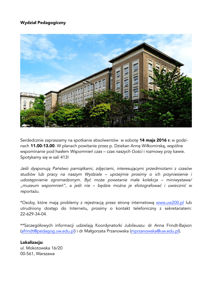 Wydział Pedagogiczny Serdedcznie zapraszamy na spotkanie absolwentów w sobotę 14 maja 2016 r. w godzinach 11.00-13.00. W planach powitanie przez p. Dziekan Annę Wiłkomirską, wspólne wspominanie pod hasłem Wspomnień czas – czas naszych Gości i rozmowy przy kawie. Spotykamy się w sali 413! Jeśli dysponują Państwo pamiątkami, zdjęciami, interesującymi przedmiotami z czasów studiów lub pracy na naszym Wydziale – uprzejmie prosimy o ich przyniesienie i udostępnienie zgromadzonym. Być może powstanie mała kolekcja – miniwystawa/ „muzeum wspomnień”, a jeśli nie – będzie można je sfotografować i uwiecznić w reportażu. *Osoby, które mają problemy z rejestracją przez stronę internetową www.uw200.pl lub utrudniony dostęp do Internetu, prosimy o kontakt telefoniczny z sekretariatem: 22-629-34-04. **Szczegółowych informacji udzielają Koordynatorki Jubileuszu: dr Anna Frindt-Bajson ([email protected]) i dr Małgorzata Przanowska ([email protected]). Lokalizacja: ul. Mokotowska 16/20 00-561, Warszawa