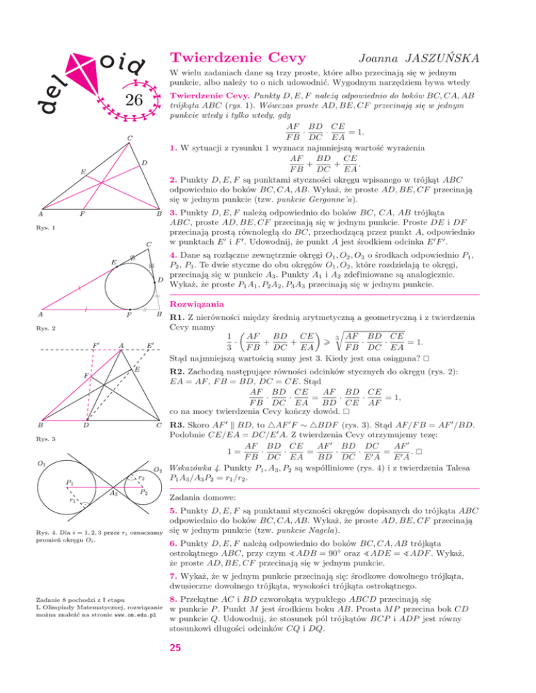 Twierdzenie Cevy Joanna JASZUŃSKA W wielu zadaniach dane są trzy proste, które albo przecinają się w jednym punkcie, albo należy to o nich udowodnić. Wygodnym narzędziem bywa wtedy 26 Rys. 1 Twierdzenie Cevy. Punkty D, E, F należą odpowiednio do boków BC, CA, AB trójkąta ABC (rys. 1). Wówczas proste AD, BE, CF przecinają się w jednym punkcie wtedy i tylko wtedy, gdy AF BD CE · · = 1. F B DC EA 1. W sytuacji z rysunku 1 wyznacz najmniejszą wartość wyrażenia BD CE AF + + . FB DC EA 2. Punkty D, E, F są punktami styczności okręgu wpisanego w trójkąt ABC odpowiednio do boków BC, CA, AB. Wykaż, że proste AD, BE, CF przecinają się w jednym punkcie (tzw. punkcie Gergonne’a). 3. Punkty D, E, F należą odpowiednio do boków BC, CA, AB trójkąta ABC, proste AD, BE, CF przecinają się w jednym punkcie. Proste DE i DF przecinają prostą równoległą do BC, przechodzącą przez punkt A, odpowiednio w punktach E ′ i F ′ . Udowodnij, że punkt A jest środkiem odcinka E ′ F ′ . 4. Dane są rozłączne zewnętrznie okręgi O1 , O2 , O3 o środkach odpowiednio P1 , P2 , P3 . Te dwie styczne do obu okręgów O1 , O2 , które rozdzielają te okręgi, przecinają się w punkcie A3 . Punkty A1 i A2 zdefiniowane są analogicznie. Wykaż, że proste P1 A1 , P2 A2 , P3 A3 przecinają się w jednym punkcie. Rozwiązania Rys. 2 R1. Z nierówności między średnią arytmetyczną a geometryczną i z twierdzenia Cevy mamy r 1 BD CE BD CE AF 3 AF · + + · · = 1. 3 FB DC EA F B DC EA Stąd najmniejszą wartością sumy jest 3. Kiedy jest ona osiągana? R2. Zachodzą następujące równości odcinków stycznych do okręgu (rys. 2): EA = AF , F B = BD, DC = CE. Stąd AF BD CE AF BD CE · · = · · = 1, F B DC EA BD CE AF co na mocy twierdzenia Cevy kończy dowód. Rys. 3 R3. Skoro AF ′ k BD, to △AF ′ F ∼ △BDF (rys. 3). Stąd AF/F B = AF ′ /BD. Podobnie CE/EA = DC/E ′ A. Z twierdzenia Cevy otrzymujemy tezę: AF ′ BD DC AF ′ AF BD CE · · = · · ′ = ′ . 1= F B DC EA BD DC E A EA Wskazówka 4. Punkty P1 , A3 , P2 są współliniowe (rys. 4) i z twierdzenia Talesa P1 A3 /A3 P2 = r1 /r2 . Zadania domowe: Rys. 4. Dla i = 1, 2, 3 przez ri oznaczamy promień okręgu Oi . 5. Punkty D, E, F są punktami styczności okręgów dopisanych do trójkąta ABC odpowiednio do boków BC, CA, AB. Wykaż, że proste AD, BE, CF przecinają się w jednym punkcie (tzw. punkcie Nagela). 6. Punkty D, E, F należą odpowiednio do boków BC, CA, AB trójkąta ostrokątnego ABC, przy czym <) ADB = 90◦ oraz <) ADE = <) ADF . Wykaż, że proste AD, BE, CF przecinają się w jednym punkcie. 7. Wykaż, że w jednym punkcie przecinają się: środkowe dowolnego trójkąta, dwusieczne dowolnego trójkąta, wysokości trójkąta ostrokątnego. Zadanie 8 pochodzi z I etapu L Olimpiady Matematycznej, rozwiązanie można znaleźć na stronie www.om.edu.pl 8. Przekątne AC i BD czworokąta wypukłego ABCD przecinają się w punkcie P . Punkt M jest środkiem boku AB. Prosta M P przecina bok CD w punkcie Q. Udowodnij, że stosunek pól trójkątów BCP i ADP jest równy stosunkowi długości odcinków CQ i DQ. 25