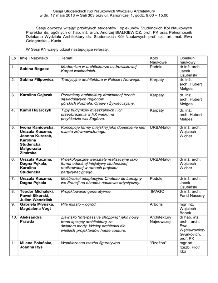 Sesja Studenckich Kół Naukowych Wydziału Architektury w dn. 17 maja 2013 w Sali 303 przy ul. Kanoniczej 1, godz. 9.00 – 15.00 Sesję otworzył witając przybyłych studentów i opiekunów Studenckich Kół Naukowych Prorektor ds. ogólnych dr hab. inż. arch. Andrzej BIAŁKIEWICZ, prof. PK oraz Pełnomocnik Dziekana Wydziału Architektury ds. Studenckich Kół Naukowych prof. szt. art. mal. Ewa Gołogórska – Kucia. W Sesji KN wzięły udział następujące referaty: Lp Imię i Nazwisko Temat 1. Sabina Bogacz Modernizm w architekturze uzdrowiskowej Karpat wschodnich. 2. Sabina Filipowicz Tradycyjna architektura w Polsce i Norwegii. Karpaty 3. Karolina Gajczak Przemiany architektury drewnianej trzech sąsiadujących regionów górskich Podhala, Orawy i Żywiecczyzny. Karpaty dr. inż. arch. Hubert Mełges 4. Kamil Hojarczyk Typy budynków mieszkalnych i ich przeobrażenia w XX wieku na przykładzie wsi Zagórze. Karpaty dr. inż. arch. Hubert Mełges 5. Iwona Kaniowska, Urszula Kuczma, Joanna Kurczab, Karolina Studencka, Małgorzata Zimirska Koncepcje farmy miejskiej jako dopełnienie idei miasta zrównoważonego. URBANator dr inż. arch. Wojciech Wicher 6. Urszula Kuczma, Dagna Pękala, Karolina Studencka Proekologiczne warsztaty realizacyjne jako forma oddolnej inicjatywy studenckiej realizowanej w ramach projektu partycypacyjnego. URBANator dr inż. arch. Wojciech Wicher 7. Urszula Kuczma, Dagna Pękala Możliwości adaptacyjne Chateau de Lumigny we Francji na ośrodek naukowo-artystyczny. Podole 8. Teodor Michalski, Paweł Sikorski, Julian Wandzilak Gabriela Młyńska, Magdalena Vogt Projektowanie generatywne. IMAGO dr inż. arch. Jacek Czubiński dr inż. arch. Farid Nassery Piła miasto – ogród. Arboris 10. Aleksandra Prawda Zjawisko "interpassive shopping" jako nowy trend łączący architekturę ze światem mody. Wielcy architekci dla wielkich projektantów haute couture. Architektury Najnowszej 11. Milena Polańska, Joanna Ryś Współczesna rzeźba figuratywna. "Rzeźba" 9. Koło Naukowe Podole Opiekun naukowy dr inż. arch. Jacek Czubiński dr. inż. arch. Hubert Mełges mgr inż. Wojciech Bobek dr hab. inż. arch. arch. Ewa WęcławowiczGyurkovich, prof. PK mgr art. rzeźb. Piotr Idzi 12. Paweł Sikorski, Teodor Michalski, Paweł Żeromski 13. Izabella Słysz STRUKTURA. IMAGO dr inż. arch. Farid Nassery Metoda RGBG jako kompleksowa metoda planowania przestrzennego na przykładzie Amsterdamse Bos w Amsterdamie. Karpaty dr. inż. arch. Hubert Mełges 14. Julian Wandzilak, Paweł Żeromski, Teodor Michalski Open source w pracowni architekta. IMAGO dr inż. arch. Farid Nassery 15. Marta Wierzcholska, Radosław Bałaziński Na drodze poszukiwania narzędzi architektury projektowanej cyfrowo - Tesselacje i inne operacje topologiczne. Architektury Najnowszej dr hab. inż. arch. arch. Ewa WęcławowiczGyurkovich, prof. PK 16. Magdalena Vogt, Iwona Kluza Zabytki architektury krajobrazu Dolnego Śląska i Opolszczyzny. Arboris mgr inż. Wojciech Bobek 17. Ewelina Zwolak Wczesnośredniowieczny zespół osadniczy w Stradowie. Historii Architektury i Konserwacji Zabytków prof. zw. dr hab. inż. arch. Andrzej Kadłuczka Jury SSKN 2013 Wydziału Architektury: prof. dr hab. Zdzisława Tołłoczko, dr inż. arch. Barbara Zin, dr inż. arch. Piotr Kotucha, dr inż. arch. Farid Nassery pod przewodnictwem prof. szt. art. mal. Ewy Gołogórskiej – Kuci, z 17 referatów wyłoniło 6 referaty, które nagrodzono. Pozostałe referaty otrzymają dyplomy potwierdzające uczestnictwo w Sesji. Nagrodzone referaty: I miejsce: Marta Wierzcholska, Radosław Bałaziński Na drodze poszukiwania narzędzi architektury projektowanej cyfrowo - Tesselacje i inne operacje topologiczne. Koło Naukowe Architektury Najnowszej Opiekun naukowy: dr hab. inż. arch. Ewa Węcławowicz-Gyurkovich, prof. PK II miejsca: Sabina Filipowicz Tradycyjna architektura w Polsce i Norwegii. Koło Naukowe Karpaty Opiekun naukowy: dr. inż. arch. Hubert Mełges Julian Wandzilak, Paweł Żeromski, Teodor Michalski Open source w pracowni architekta. Koło Naukowe IMAGO Opiekun naukowy: dr inż. arch. Farid Nassery III miejsca: Teodor Michalski, Paweł Sikorski, Julian Wandzilak Projektowanie generatywne. Koło Naukowe IMAGO Opiekun naukowy: dr inż. arch. Farid Nassery Izabella Słysz Metoda RGBG jako kompleksowa metoda planowania przestrzennego na przykładzie Amsterdamse Bos w Amsterdamie. Tradycyjna architektura w Polsce i Norwegii. Koło Naukowe Karpaty Opiekun naukowy: dr. inż. arch. Hubert Mełges Kamil Hojarczyk Typy budynków mieszkalnych i ich przeobrażenia w XX wieku na przykładzie wsi Zagórze. Koło Naukowe Karpaty Opiekun naukowy: dr. inż. arch. Hubert Mełges Przyznano także dyplom za opracowanie plakatu promującego Studencką Sesje Kół Naukowych Wydziału Architektury 2013. Paweł Sikorski, Koło Naukowe IMAGO Opiekun naukowy: dr inż. arch. Farid Nassery dr inż. arch. Farid Nassery Sekretarz przy Pełnomocniku Dziekana Wydziału Architektury ds. Studenckich Kół Naukowych prof. szt. art. mal. Ewa Gołogórska – Kucia.