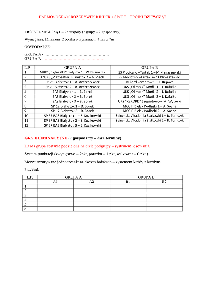 HARMONOGRAM ROZGRYWEK KINDER + SPORT – TRÓJKI DZIEWCZĄT TRÓJKI DZIEWCZĄT – 23 zespoły (2 grupy – 2 gospodarzy) Wymagania: Minimum 2 boiska o wymiarach: 4,5m x 7m GOSPODARZE: GRUPA A - …………………………………………… GRUPA B – ………………………………………….. L.P 1 2 3 4 5 6 7 8 9 10 11 12 GRUPA A MUKS „Piętnastka” Białystok 1 – W.Kaczmarek MUKS „Piętnastka” Białystok 2 – A. Piech SP 21 Białystok 1 – A. Ambrożewicz SP 21 Białystok 2 – A. Ambrożewicz BAS Białystok 1 – B. Borek BAS Białystok 2 – B. Borek BAS Białystok 3 – B. Borek SP 12 Białystok 1 – B. Borek SP 12 Białystok 2 – B. Borek SP 37 BAS Białystok 1 – Z. Kozikowski SP 37 BAS Białystok 2 – Z. Kozikowski SP 37 BAS Białystok 3 – Z. Kozikowski GRUPA B ZS Płociczno –Tartak 1 – M.Klimaszewski ZS Płociczno –Tartak 2– M.Klimaszewski Rekord Zambrów 1 – Ł. Kujawa UKS „Olimpik” Mońki 1 – J. Rafałko UKS „Olimpik” Mońki 2 – J. Rafałko UKS „Olimpik” Mońki 3 – J. Rafałko UKS "REKORD" Szepietowo – M. Wysocki MOSiR Bielsk Podlaski 1 – A. Sosna MOSiR Bielsk Podlaski 2 – A. Sosna Sejneńska Akademia Siatkówki 1 – B. Tomczyk Sejneńska Akademia Siatkówki 2 – B. Tomczyk GRY ELIMINACYJNE (2 gospodarzy – dwa terminy) Każda grupa zostanie podzielona na dwie podgrupy – systemem losowania. System punktacji (zwycięstwo – 2pkt, porażka – 1 pkt, walkower – 0 pkt.) Mecze rozgrywane jednocześnie na dwóch boiskach – systemem każdy z każdym . Przykład: L.P. GRUPA A A1 1 2 3 4 5 6 GRUPA B A2 B1 B2 ĆWIERĆFINAŁ ( 2 gospodarzy – jeden termin) 5 zespołów z największą ilością punktów z każdej podgrupy – 20 zespołów Podział 20 zespołów na dwie grupy C i D – metodą losowania Podział grupy C i D (po 10 zespołów) na dwie podgrupy – po 5 zespołów – systemem losowania System punktacji (zwycięstwo – 2pkt, porażka – 1 pkt, walkower – 0 pkt.) Mecze rozgrywane jednocześnie na dwóch boiskach w podgrupach – systemem każdy z każdym. Przykład: L.P. GRUPA C C1 GRUPA D C2 D1 D2 1 2 3 4 5 PÓŁFINAŁ (1 gospodarz – jeden termin) Po 3 drużyny z największą ilością punktów z podgrup C i D – 12 zespołów Podział 12 zespołów na dwie podgrupy – 6 zespołów – systemem losowania System punktacji (zwycięstwo – 2pkt, porażka – 1 pkt, walkower – 0 pkt.) Mecze rozgrywane jednocześnie na dwóch boiskach w podgrupach– systemem każdy z każdym. L.P. GRUPA E E1 E2 1 2 3 4 5 6 FINAŁ (1 gospodarz – jeden termin) – miejsca 1-8 Po 4 drużyny z PÓŁFINAŁU z podgrup E1 oraz E2 z największą ilością punktów (8 zespołów) System punktacji (zwycięstwo – 2pkt, porażka – 1 pkt, walkower – 0 pkt.) Mecze rozgrywane jednocześnie na dwóch boiskach – systemem każdy z każdym .