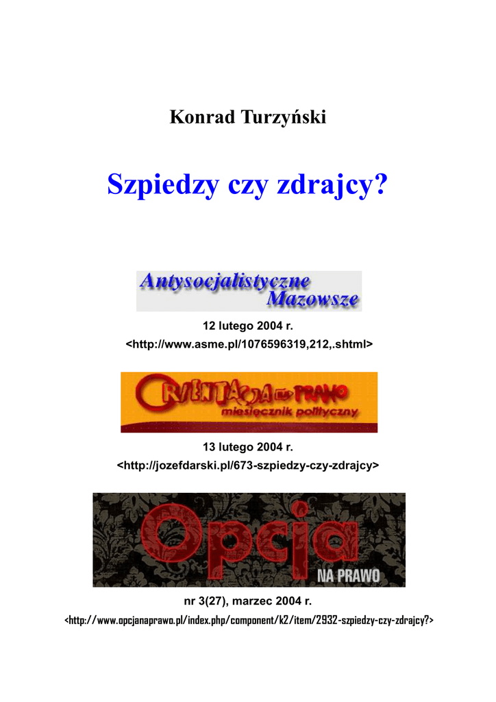 Konrad Turzyński Szpiedzy czy zdrajcy? 12 lutego 2004 r. <http://www.asme.pl/1076596319,212,.shtml> 13 lutego 2004 r. <http://jozefdarski.pl/673-szpiedzy-czy-zdrajcy> nr 3(27), marzec 2004 r. <http://www.opcjanaprawo.pl/index.php/component/k2/item/2932-szpiedzy-czy-zdrajcy?> Co pewien czas pojawiają się wypowiedzi oceniające działalność wywiadowczą płk. Ryszarda Kuklińskiego dodatnio i ujemnie, zależnie od punktów widzenia wypowiadających się. Ci, którzy zarzucają mu zdradę, uważają na ogół (i nie bez sporej dawki racji!), że w przeciwnym razie za zdrajców trzeba by uznać tych, którzy wiernie służyli PRL i jej sojusznikom, z ZSRS na czele. Do punktów widzenia służących za podstawę oceny płk. Kuklińskiego pragnę dorzucić jeszcze jeden – porównawczy. W dziejach Polski można znaleźć postacie, których aktywność przez pewien czas polegała na służeniu bezpośrednio państwu innemu niż niepodległe państwo polskie. Jedną z nich jest znany i ceniony pisarz XIX-wieczny, Józef Ignacy Kraszewski. Został on skazany na karę więzienia przez sąd w zaborze pruskim za szpiegostwo na rzecz Francji i odsiedział wyrok. Państwo, któremu Kraszewski służył swoją szpiegowską robotą, nie było jego ojczyzną, nie było niepodległą Polską – po prostu dlatego, że takowej wtedy na mapie Europy nie było. Czy Polacy mają powód wstydzić się za takiego rodaka? Czy ulice albo place, których on jest patronem, zostały mu niesłusznie "przyznane"? Wolne żarty. Jest przecież jasne, że służył wywiadowi Napoleona Bonapartego dlatego, że liczył na to, iż w ten sposób osłabia jednego z zaborców (Prusy), a więc – pośrednio – działa na korzyść przyszłej niepodległości swojego ojczystego kraju. Mniej więcej w tym samym czasie w zaborze rosyjskim żył Romuald Traugutt. Przez sporo lat był zawodowym oficerem w armii rosyjskiej, a więc wtedy służył zaborcy, i to ochotniczo, bowiem do zawodowej służby wojskowej nie można było wstąpić inaczej niż dobrowolnie. Gdy wybuchło powstanie styczniowe, był mu przeciwny, gdyż był przekonany (już wtedy i, jak wiadomo, słusznie), że powstanie jest skazane na klęskę. Jednak w sytuacji krytycznej podjął się nie tylko przejścia na stronę powstańczą, ale także – dowodzenia powstaniem; uczynił to tylko po to, żeby zminimalizować nieuchronne straty. W końcu schwytano go, skazano na śmierć i publicznie powieszono. Za to, że jako poddany i jako żołnierz "zdradził" – Rosję i jej cara (łamiąc rzeczywiście przy tym żołnierską przysięgę wierności carowi!). Pomimo wcześniejszej służby w armii jednego z naszych nieprzyjaciół – rosyjskiego zaborcy – Traugutt od dawna zalicza się do polskich bohaterów narodowych, a ponadto od niedawna jest "kandydatem na ołtarze". A przecież jego rola w powstaniu, jak też ono samo, bezpośrednią korzyść przyniosły raczej innym państwom: Turcji, Francji i Anglii (które niedawno przedtem walczyły wspólnie przeciwko Rosji w tzw. wojnie krymskiej), gdyż do odzyskania niepodległości przez Polskę musiało minąć jeszcze ponad pół wieku. I tu można spytać podobnie jak w wypadku Kraszewskiego. Odpowiedzi byłyby też bardzo podobne. Różnica byłaby tylko w tożsamości zaborcy i w większym "asortymencie" form nielojalności wobec niego. Jeszcze inny przykład, z bliższej przeszłości. Znany przedwojenny polski sportowiec (pływak i "waterpolista"), Jerzy Szajnowicz-Iwanow, który jako syn Polki i Rosjanina, oficera carskiej armii, a potem emigranta, nie posiadał przez większość swojego życia obywatelstwa polskiego (udało się mu je nabyć dopiero w latach trzydziestych), po powtórnym małżeństwie matki znalazł się w Grecji. Tam zastała go II wojna światowa. Do Wojska Polskiego odtwarzanego na Bliskim Wschodzie nie przyjęto go właśnie z powodu późnego nabycia obywatelstwa RP. Za to zwerbował go wywiad brytyjski, któremu oddał usługi porównywane potem do rozmiarów działalności dywizji piechoty (!) na froncie. Organizował nie tylko działalność wywiadowczą, ale także dywersyjną przeciwko wojskom włoskim i niemieckim okupującym Grecję. Dopiero po trzecim aresztowaniu nie udało mu się uciec – niemieccy okupanci skazali go na śmierć i rozstrzelali. Historię jego poczynań w okupowanej Grecji przedstawił 31 lat temu ciekawy film "Agent nr 1" Aleksandra Ścibor-Rylskiego nakręcony na podstawie książki Stanisława Strumpf-Wojtkiewicza pod tym samym tytułem. Czy powinniśmy potępiać Szajnowicza-Iwanowa za to, że swoje życie (skutecznie) naraził na przedwczesny koniec w walce między dwoma obcymi mocarstwami? Albo za to, że służył wywiadowi obcego państwa? Pod tym drugim zarzutem rzeczywiście po II wojnie światowej skazano na śmierć lub straszne więzienie, zwykle przedtem ich torturując, wielu polskich patriotów z Polski Podziemnej i z Polskich Sił Zbrojnych za Zachodzie. (Więc pewnie los JS-I w latach czterdziestych albo pięćdziesiątych w tak zwanej Polsce Ludowej byłby nie lepszy niż ten, który zgotowali mu hitlerowcy.) Nie wiem, czy jego imieniem nazwano w Polsce ulicę, plac lub jakąś instytucję, czy ma pomnik albo tablicę pamiątkową. Ale jeżeli tak, to może on również "ma" (pomnik albo ulicę) niesłusznie, skoro był szpiegiem na usługach obcego państwa? Niepodległa Polska istniała (chociaż przede wszystkim pod względem prawnym, bowiem faktycznie Rządowi RP na Uchodźctwie podlegały tylko niektóre agendy, i to wyłącznie podziemne albo "emigracyjne"), a on jednak służył brytyjskim mocodawcom... I na dokładkę postać literacka, sprzed z górą trzech wieków: płk. Andrzej Kmicic. Fikcja fikcją, ale z Kimicicem identyfikowało się w duchu już wielu Polaków, więc warto przyjrzeć się temu zmyślonemu patriocie i bohaterowi. Do służby w odłamie wojsk Rzeczypospolitej kolaborującym z okupantem szwedzki