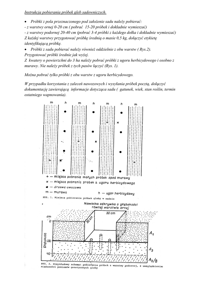 Instrukcja pobierania próbek gleb sadowniczych. Próbki z pola przeznaczonego pod założenie sadu należy pobierać: - z warstwy ornej 0-20 cm ( pobrać 15-20 próbek i dokładnie wymieszać) - z warstwy podornej 20-40 cm (pobrać 3-4 próbki z każdego dołka i dokładnie wymieszać) Z każdej warstwy przygotować próbkę średnią o masie 0,5 kg, dołączyć etykietę identyfikującą próbkę. Próbki z sadu pobierać należy również oddzielnie z obu warstw ( Rys.2). Przygotować próbki średnie jak wyżej. Z kwatery o powierzchni do 3 ha należy pobrać próbki z ugoru herbicydowego i osobno z murawy. Nie należy próbek z tych pasów łączyć (Rys. 1). Można pobrać tylko próbki z obu warstw z ugoru herbicydowego. W przypadku korzystania z zaleceń nawozowych i wysyłania próbek pocztą, dołączyć dokumentację zawierającą informacje dotycząca sadu ( gatunek, wiek, stan roślin, termin ostatniego wapnowania).