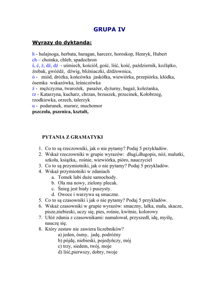 GRUPA IV Wyrazy do dyktanda: h - hulajnoga, herbata, huragan, harcerz, horoskop, Henryk, Hubert ch – choinka, chleb, spadochron ś, ć, ź, dź, dż - uśmiech, kościół, gość, liść, kość, październik, koźlątko, źrebak, gwóźdź, dźwig, bliźniaczki, dżdżownica, ó - miód, dróżka, końcówka jaskółka, wiewiórka, przepiórka, kłódka, ósemka wskazówka, leśniczówka ż - mężczyzna, twarożek, pasażer, dyżurny, bagaż, koleżanka, rz - Katarzyna, kucharz, chrzan, brzuszek, przecinek, Kołobrzeg, rzodkiewka, orzech, talerzyk u - podarunek, murarz, muchomor pszczoła, pszenica, kształt, PYTANIA Z GRAMATYKI 1. Co to są rzeczowniki, jak o nie pytamy? Podaj 5 przykładów. 2. Wskaż rzeczowniki w grupie wyrazów: długi,długopis, nóż, malutki, szkoła, książka,. rośnie, wiewiórka, pióro, nauczyciel 3. Co to są przymiotniki, jak o nie pytamy? Podaj 5 przykladów. 4. Wskaż przymiotniki w zdaniach a. Tomek lubi duże samochody. b. Ola ma nowy, zielony plecak. c. Śnieg jest biały i puszysty. d. Owoce i warzywa są smaczne. 5. Co to są czasowniki i jak o nie pytamy? Podaj 5 przykladów. 6. Wskaż czasowniki w grupie wyrazów: smaczny, lalka, mała, skacze, pisze,niebieski, uczy się, pies, rośnie, kwitnie, kolorowy 7. Ułóż zdania z czasownikami: namalował, przyszedł, idę, myślę, nauczę się. 8. Który zestaw nie zawiera liczebników? a) jeden, ósmy, jadę, podróżny b) pójdę, niebieski, pojedyńczy, mój c) trzy, siedem, twój, moje d) liść,pierwszy, dobry, twoje 9. Jakie znasz rodzaje zdań? Podaj przykłady. 10. Podaj 3 zdania pytające- zamień na oznajmujące. 11. Podaj 3 zdania oznajmujące- zamień na rozkazujące. 12. Podaj 3 zdania rozkazujące- zamień na pytające. 13. Utwórz rodzinę wyrazów od słów: kościół, cukier, las, szkoła. 14. Kiedy piszemy wielkie litery- podaj przykłady. 15. Jakie znasz czasy czasowników, nazwij je i podaj przykłady. 16. Wymień znaki przestankowe, kiedy je używamy? 17. Rozwiń następujące zdania: a. Pada deszcz. b. Nauczyciel uczy. c. Hania czyta. PYTANIA Z GEOGRAFII 1. Pokaż na mapie Polskę i jej granice. 2. Wymień i pokaż na mapie 6 największych polskich miast. 3. Nazwij i pokaż polskie morze.Pokaż największe miasta leżące nad nim. 4. Nazwij i pokaż góry w Polsce ( pasma górskie). 5. Wymień i pokaż największe rzeki w Polsce. 6. Pokaż Wisłę i największe miasta leżące nad nią. 7. Pokaż z jakich gór wypływa Wisła i do jakiego wpada morza? 8. Jakie miasto było pierwszą stolicą Polski, jakie drugą i jakie jest obecną. Pokaż te miasta na mapie. 9. Jakie znasz jeziora w Polsce? Pokaż na mapie. 10. Jakie bogactwa naturalne posiada Polska? 11. Czy wiesz gdzie jest Śląsk? Mazowsze? Mazury? 12. Czy wiesz gdzie urodził się i mieszkał Mikołaj Kopernik? Pokaż na mapie. 13. Gdzie chciałbyś spędzić wakacje w Polsce? Pokaż na mapie. 14. Jaką porę roku lubisz najbardziej i dlaczego? 15. Jakie państwa są sąsiadami Polski? - Pokaż na mapie. 16. Jakie parki narodowe są w Polsce?- Pokaż na mapie. PYTANIA Z HISTORII I LITERATURY Dynastia Piastów 1. 2. 3. 4. 5. 6. 7. Jak powstał gród Gniezno- opowiedz legendę . Opowiedz legendę Postrzyżyny Ziemowita. Kim był Mieszko? Co o nim wiesz? W którym roku i od kogo Polska przyjęła chrzest? Kto był pierwszym królem Polski? Co o nim wiesz? Opowiedz legendę „O wdowim groszu.” Co musiał zrobić Bolesław Chrobry aby móc sprowadzić ciało św. Wojciecha do Polski? 8. Jakim królem był Bolesław Śmiały? 9. Z kim walczył Bolesław Krzywousty na Psim Polu? Wyjaśnij nazwę pola bitwy. 10. Dlaczego po śmierci Bolesława Krzywoustego Polska została podzielona? 11. Na czym polegał testament Bolesława Krzywoustego? 12. Dlaczego Polska osłabła po śmierci Bolesława Krzywoustego? 13. Kto to byli Krzyżacy i co robili w Polsce? 14. Kto to byli Tatarzy i dlaczego ludzie bali się ich? 15. Co zrobił Władysław Łokietek? 16. Kiedy i kto złączył małe księstwa w jedną Polskę? 17. Co wiesz o Władysławie Łokietku? 18. Jakim królem był Kazimierz Wielki? 19. Wymień królów z dynastii Piastów. 20. Którego króla z dynastii Piastów polubiłeś(łaś) i dlaczego? 21. Powiedz pierwszą zwrotkę i refren Hymnu Polskiego. 22. Jak wygląda godło i flaga Polski? 23. Co wiesz o Janie Pawle II? 24. Kim był Fryderyk Chopin? Co o nim wiesz? 25. Co wiesz o Mikołaju Koperniku? Zestawy pytań dla grupy IV przygotowała: Wanda Pejas Krystyna Lechańska Grazyna Stanowska