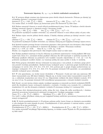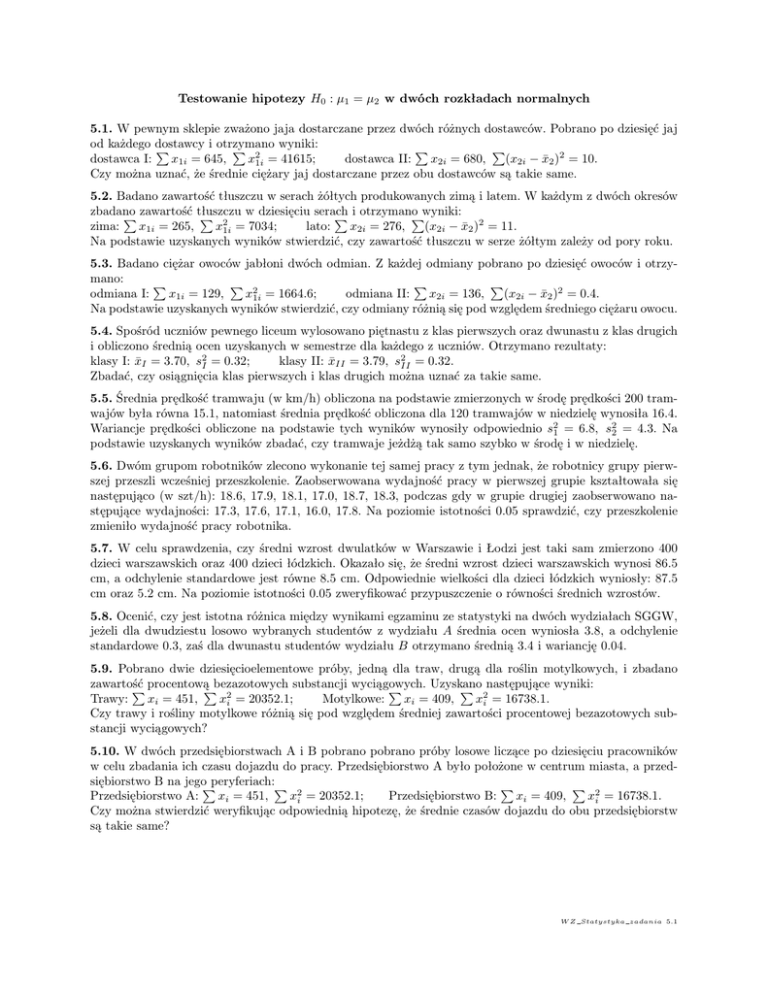 Testowanie hipotezy H0 : µ1 = µ2 w dwóch rozkładach normalnych 5.1. W pewnym sklepie zważono jaja dostarczane przez dwóch różnych dostawców. Pobrano po dziesięć jaj od każdego dostawcy i otrzymano P P 2 wyniki: P P dostawca I: x1i = 645, x1i = 41615; dostawca II: x2i = 680, (x2i − x̄2 )2 = 10. Czy można uznać, że średnie ciężary jaj dostarczane przez obu dostawców są takie same. 5.2. Badano zawartość tłuszczu w serach żółtych produkowanych zimą i latem. W każdym z dwóch okresów zbadano P zawartość tłuszczu P 2 w dziesięciu serach P i otrzymano Pwyniki: 2 zima: x1i = 265, x1i = 7034; lato: x2i = 276, (x2i − x̄2 ) = 11. Na podstawie uzyskanych wyników stwierdzić, czy zawartość tłuszczu w serze żółtym zależy od pory roku. 5.3. Badano ciężar owoców jabłoni dwóch odmian. Z każdej odmiany pobrano po dziesięć owoców i otrzymano: P P 2 P P odmiana I: x1i = 129, x1i = 1664.6; odmiana II: x2i = 136, (x2i − x̄2 )2 = 0.4. Na podstawie uzyskanych wyników stwierdzić, czy odmiany różnią się pod względem średniego ciężaru owocu. 5.4. Spośród uczniów pewnego liceum wylosowano piętnastu z klas pierwszych oraz dwunastu z klas drugich i obliczono średnią ocen uzyskanych w semestrze dla każdego z uczniów. Otrzymano rezultaty: klasy I: x̄I = 3.70, s2I = 0.32; klasy II: x̄II = 3.79, s2II = 0.32. Zbadać, czy osiągnięcia klas pierwszych i klas drugich można uznać za takie same. 5.5. Średnia prędkość tramwaju (w km/h) obliczona na podstawie zmierzonych w środę prędkości 200 tramwajów była równa 15.1, natomiast średnia prędkość obliczona dla 120 tramwajów w niedzielę wynosiła 16.4. Wariancje prędkości obliczone na podstawie tych wyników wynosiły odpowiednio s21 = 6.8, s22 = 4.3. Na podstawie uzyskanych wyników zbadać, czy tramwaje jeżdżą tak samo szybko w środę i w niedzielę. 5.6. Dwóm grupom robotników zlecono wykonanie tej samej pracy z tym jednak, że robotnicy grupy pierwszej przeszli wcześniej przeszkolenie. Zaobserwowana wydajność pracy w pierwszej grupie kształtowała się następująco (w szt/h): 18.6, 17.9, 18.1, 17.0, 18.7, 18.3, podczas gdy w grupie drugiej zaobserwowano następujące wydajności: 17.3, 17.6, 17.1, 16.0, 17.8. Na poziomie istotności 0.05 sprawdzić, czy przeszkolenie zmieniło wydajność pracy robotnika. 5.7. W celu sprawdzenia, czy średni wzrost dwulatków w Warszawie i Łodzi jest taki sam zmierzono 400 dzieci warszawskich oraz 400 dzieci łódzkich. Okazało się, że średni wzrost dzieci warszawskich wynosi 86.5 cm, a odchylenie standardowe jest równe 8.5 cm. Odpowiednie wielkości dla dzieci łódzkich wyniosły: 87.5 cm oraz 5.2 cm. Na poziomie istotności 0.05 zweryfikować przypuszczenie o równości średnich wzrostów. 5.8. Ocenić, czy jest istotna różnica między wynikami egzaminu ze statystyki na dwóch wydziałach SGGW, jeżeli dla dwudziestu losowo wybranych studentów z wydziału A średnia ocen wyniosła 3.8, a odchylenie standardowe 0.3, zaś dla dwunastu studentów wydziału B otrzymano średnią 3.4 i wariancję 0.04. 5.9. Pobrano dwie dziesięcioelementowe próby, jedną dla traw, drugą dla roślin motylkowych, i zbadano zawartość substancji wyciągowych. Uzyskano P procentowąPbezazotowych P P 2następujące wyniki: Motylkowe: xi = 409, xi = 16738.1. Trawy: xi = 451, x2i = 20352.1; Czy trawy i rośliny motylkowe różnią się pod względem średniej zawartości procentowej bezazotowych substancji wyciągowych? 5.10. W dwóch przedsiębiorstwach A i B pobrano pobrano próby losowe liczące po dziesięciu pracowników w celu zbadania ich czasu dojazdu do pracy. Przedsiębiorstwo A było położone w centrum miasta, a przedsiębiorstwo B na jegoPperyferiach:P P P 2 Przedsiębiorstwo A: xi = 451, x2i = 20352.1; Przedsiębiorstwo B: xi = 409, xi = 16738.1. Czy można stwierdzić weryfikując odpowiednią hipotezę, że średnie czasów dojazdu do obu przedsiębiorstw są takie same? W Z Statystyka zadania 5.1 Testowanie hipotezy H0 : p1 = p2 5.11. Wysunięto przypuszczenie, że jakość produkcji pewnego wyrobu po wprowadzeniu nowej, tańszej technologii nie uległa zmianie. Wylosowano próbę 120 sztuk tego wyrobu spośród wyprodukowanych starą technologią i otrzymano 12 sztuk złych. Wśród 160 wylosowanych sztuk wyprodukowanych nową technologią było 20 sztuk wadliwych. Czy wysunięte przypuszczenie można w świetle uzyskanych wyników uznać za uzasadnione? 5.12. W pewnej szkole rozeszła się plotka, że uczniowie chcą ogolić dyrektora. Nauczyciel matematyki zapytał o to 150 dziewcząt i 200 chłopców. Dziewięćdziesięciu chłopców i 70% dziewcząt odpowiedziało twierdząco. Czy można uznać, że chęć ogolenia dyrektora zależy od płci? 5.13. Na 200 przebadanych szczurów u 60 stwierdzono objawy obniżonego refleksu. Wśród chorych szczurów tylko 20 dostawało pewien preparat P , a wszystkich szczurów karmionych tym preparatem było 80. Czy można uznać, że karmienie preparatem P wpływa na obniżenie refleksu u szczurów? 5.14. Badano, czy młodzież męska nosząca modną fryzurę ma inne wyniki niż pozostali młodzieńcy. W tym celu zbadano 492 uczniów i okazało się, że wśród 94 modnych młodzieńców aż 51 miało złe wyniki w nauce. Wszystkich źle uczących się było 245. Czy na tej podstawie można sądzić, że fryzura ma wpływ na wyniki nauczania? 5.15. Na 180 przebadanych studentów i studentek stwierdzono, że 100 zdało egzamin ze statystyki. Wśród 130 studentek egzaminu nie zaliczyło 55. Czy można na tej podstawie uznać, że wynik egzaminu zależy od płci zdającego? 5.16. Wysunięto przypuszczenie, że pacjenci z objawem klinicznej niewydolności oddechowej charakteryzują się zawyżonym poziomem aktywności pewnego enzymu. Wśród 357 pacjentów zanotowano 49 z niewydolnością oddechową, natomiast wśród 43 pacjentów o podwyższonej aktywności enzymu niewydolnością oddecho