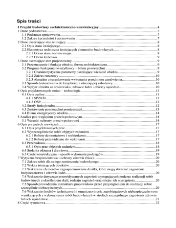 Spis treści I Projekt budowlany architektoniczno-konstrukcyjny................................................................4 1 Dane podstawowe.........................................................................................................................7 1.1 Podstawa opracowania..........................................................................................................7 1.2 Zakres i przedmiot i opracowania .........................................................................................7 2 Dane określające stan istniejący ...................................................................................................8 2.1 Opis stanu istniejącego..........................................................................................................8 2.2 Ekspertyza techniczna istniejących elementów budowlanych ...............................................8 2.2.1 Ocena stanu technicznego..............................................................................................8 2.2.2 Ocena końcowa.............................................................................................................9 3 Dane określające stan projektowany ............................................................................................9 3.1 Przeznaczenie i funkcja obiektu, forma architektoniczna.......................................................9 3.2 Program funkcjonalno-użytkowy – bilans powierzchni.........................................................9 3.2.1 Charakterystyczne parametry określające wielkość obiektu...........................................9 3.2.2 Zakres rzeczowy .........................................................................................................10 3.2.3 Aktualne uwarunkowania wykonania przedmiotu zamówienia....................................10 3.3 Sposób dostosowania do krajobrazu i otaczającej zabudowy...............................................10 3.4 Wpływ obiektu na środowisko, zdrowie ludzi i obiekty sąsiednie........................................10 4 Opis projektowanych zmian – technologia..................................................................................11 4.1 Opis ogólny.........................................................................................................................11 4.1.1 SPZRM........................................................................................................................11 4.1.2 OSP.............................................................................................................................12 4.2 Strefy funkcjonalne.............................................................................................................12 4.3 Zestawienie powierzchni pomieszczeń................................................................................13 4.4 Bilans energetyczny obiektu................................................................................................14 5 Analiza pod względem przeciwpożarowym................................................................................14 5.1 Warunki ochrony przeciwpożarowej....................................................................................14 6 Opis przyjętych rozwiązań..........................................................................................................17 6.1 Opis projektowanych prac...................................................................................................17 6.2 Wyszczególnienie robót objętych zadaniem........................................................................17 6.2.1 Roboty demontażowe i rozbiórkowe............................................................................17 6.2.2 Roboty przewidziane do wykonania............................................................................17 6.3 Przebudowa.........................................................................................................................18 6.3.1 Opis prac objętych zadaniem.......................................................................................18 6.4 Stolarka okienna i drzwiowa...............................................................................................19 6.5 Część konstrukcyjna – sposób wykonania podciągów.........................................................19 7 Wytyczne bezpieczeństwa i ochrony zdrowia (bioz)...................................................................20 7.1 Zakres robót dla całego zamierzenia budowlanego..............................................................20 7.2 Wykaz istniejących obiektów..............................................................................................20 7.3 Wskazanie elementów zagospodarowania działki, które mogą stwarzać zagrożenie bezpieczeństwa i zdrowia ludzi..................................................................................................20 7.4 Wskazanie dotyczące przewidywanych zagrożeń występujących podczas realizacji robót budowlanych z określeniem skali, rodzaju zagrożeń oraz miejsc ich wystąpienia......................20 7.5 Sposób prowadzenia instruktażu pracowników przed przystąpieniem do realizacji robót szczególnie niebezpiecznych......................................................................................................20 7.6 Wskazanie środków technicznych i organizacyjnych, zapobiegających niebezpieczeństwom wynikających z wykonywania robót budowlanych w strefach szczególnego zagrożenia zdrowia lub ich sąsiedztwie.....................................................................................................................21 8 Część rysunkowa........................................................................................................................22 A1 Plan Sytuacyjny Skala 1:1000........................................22 A2 Rzut parteru – technolog