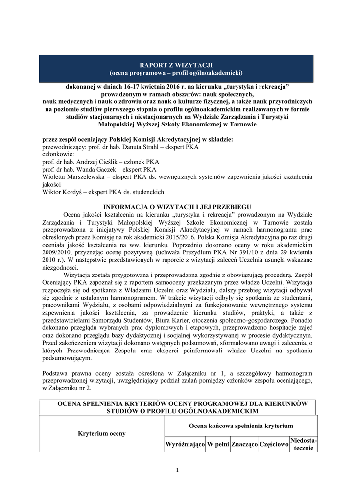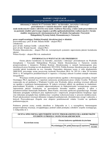 RAPORT Z WIZYTACJI (ocena programowa – profil ogólnoakademicki) dokonanej w dniach 16-17 kwietnia 2016 r. na kierunku „turystyka i rekreacja” prowadzonym w ramach obszarów: nauk społecznych, nauk medycznych i nauk o zdrowiu oraz nauk o kulturze fizycznej, a także nauk przyrodniczych na poziomie studiów pierwszego stopnia o profilu ogólnoakademickim realizowanych w formie studiów stacjonarnych i niestacjonarnych na Wydziale Zarządzania i Turystyki Małopolskiej Wyższej Szkoły Ekonomicznej w Tarnowie przez zespół oceniający Polskiej Komisji Akredytacyjnej w składzie: przewodniczący: prof. dr hab. Danuta Strahl – ekspert PKA członkowie: prof. dr hab. Andrzej Cieślik – członek PKA prof. dr hab. Wanda Gaczek – ekspert PKA Wioletta Marszelewska – ekspert PKA ds. wewnętrznych systemów zapewnienia jakości kształcenia jakości Wiktor Kordyś – ekspert PKA ds. studenckich INFORMACJA O WIZYTACJI I JEJ PRZEBIEGU Ocena jakości kształcenia na kierunku „turystyka i rekreacja” prowadzonym na Wydziale Zarządzania i Turystyki Małopolskiej Wyższej Szkole Ekonomicznej w Tarnowie została przeprowadzona z inicjatywy Polskiej Komisji Akredytacyjnej w ramach harmonogramu prac określonych przez Komisję na rok akademicki 2015/2016. Polska Komisja Akredytacyjna po raz drugi oceniała jakość kształcenia na ww. kierunku. Poprzednio dokonano oceny w roku akademickim 2009/2010, przyznając ocenę pozytywną (uchwała Prezydium PKA Nr 391/10 z dnia 29 kwietnia 2010 r.). W następstwie przedstawionych w raporcie z wizytacji zaleceń Uczelnia usunęła wskazane niezgodności. Wizytacja została przygotowana i przeprowadzona zgodnie z obowiązującą procedurą. Zespół Oceniający PKA zapoznał się z raportem samooceny przekazanym przez władze Uczelni. Wizytacja rozpoczęła się od spotkania z Władzami Uczelni oraz Wydziału, dalszy przebieg wizytacji odbywał się zgodnie z ustalonym harmonogramem. W trakcie wizytacji odbyły się spotkania ze studentami, pracownikami Wydziału, z osobami odpowiedzialnymi za funkcjonowanie wewnętrznego systemu zapewnienia jakości kształcenia, za prowadzenie kierunku studiów, praktyki, a także z przedstawicielami Samorządu Studentów, Biura Karier, otoczenia społeczno-gospodarczego. Ponadto dokonano przeglądu wybranych prac dyplomowych i etapowych, przeprowadzono hospitacje zajęć oraz dokonano przeglądu bazy dydaktycznej i socjalnej wykorzystywanej w procesie dydaktycznym. Przed zakończeniem wizytacji dokonano wstępnych podsumowań, sformułowano uwagi i zalecenia, o których Przewodnicząca Zespołu oraz eksperci poinformowali władze Uczelni na spotkaniu podsumowującym. Podstawa prawna oceny została określona w Załączniku nr 1, a szczegółowy harmonogram przeprowadzonej wizytacji, uwzględniający podział zadań pomiędzy członków zespołu oceniającego, w Załączniku nr 2. OCENA SPEŁNIENIA KRYTERIÓW OCENY PROGRAMOWEJ DLA KIERUNKÓW STUDIÓW O PROFILU OGÓLNOAKADEMICKIM Ocena końcowa spełnienia kryterium Kryterium oceny Wyróżniająco W pełni Znacząco Częściowo 1 Niedostatecznie 1. Jednostka sformułowała koncepcję kształcenia i realizuje na ocenianym kierunku studiów program kształcenia umożliwiający osiągnięcie zakładanych efektów kształcenia 2. Liczba i jakość kadry naukowodydakty-cznej oraz prowadzone w jednostce badania naukowe zapewniają realizację programu kształcenia na ocenianym kierunku oraz osiągnięcie przez studentów zakładanych efektów kształcenia 3. Współpraca z otoczeniem społecznym, gospodarczym lub kulturalnym w procesie kształcenia 4. Jednostka dysponuje infrastrukturą dydaktyczną i naukową umożliwiającą realizację programu kształcenia o profilu ogólnoakademickim i osiągnięcie przez studentów zakładanych efektów kształcenia, oraz prowadzenie badań naukowych 5. Jednostka zapewnia studentom wsparcie w procesie uczenia się, prowadzenia badań i wchodzenia na rynek pracy 6. W jednostce działa skuteczny wewnętrzny system zapewniania jakości kształcenia zorientowany na ocenę realizacji efektów kształcenia i doskonalenia programu kształcenia oraz podniesienie jakości na ocenianym kierunku studiów x x x x x x 1. Jednostka sformułowała koncepcję kształcenia i realizuje na ocenianym kierunku studiów program kształcenia umożliwiający osiągnięcie zakładanych efektów kształcenia. 1.1. Koncepcja kształcenia na ocenianym kierunku studiów jest zgodna z misją i strategią rozwoju uczelni, odpowiada celom określonym w strategii jednostki oraz w polityce zapewnienia jakości, a także uwzględnia wzorce i doświadczenia krajowe i międzynarodowe właściwe dla danego zakresu kształcenia.* 1.2 Plany rozwoju kierunku uwzględniają tendencje zmian zachodzących w dziedzinach nauki i dyscyplinach naukowych, z których kierunek się wywodzi, oraz są zorientowane na potrzeby otoczenia społecznego, gospodarczego lub kulturalnego, w tym w szczególności rynku pracy. 1.3 Jednostka przyporządkowała oceniany kierunek studiów do obszaru/obszarów kształcenia oraz wskazała dziedzinę/dziedziny nauki oraz dyscyplinę/dyscypliny naukowe, do których odnoszą się efekty kształcenia dla ocenianego kierunku. 1.4. Efekty kształcenia zakładane dla ocenianego kierunku studiów są spójne z wybranymi efektami kształcenia dla obszaru/obszarów kształcenia, poziomu i profilu ogólnoakademickiego, do którego/których kierunek ten został przyporządkowany, określonymi w Krajowych Ramach Kwalifikacji dla Szkolnictwa Wyższego, sformułowane w sposób zrozumiały i pozwalający na stworzenie systemu ich weryfikacji. W przypadku kierunków studiów, o których mowa w art. 9b, oraz kształcenia przygotowującego do wykonywania zawodu nauczyciela, o którym mowa w art. 9c ustawy z dnia 27 lipca 2005 r. - Prawo o szkolnictwie wyższym (Dz. U. z 2012 r. poz. 572, z późn. zm.), efekty kształcenia są także zgodne ze standardami kształcen