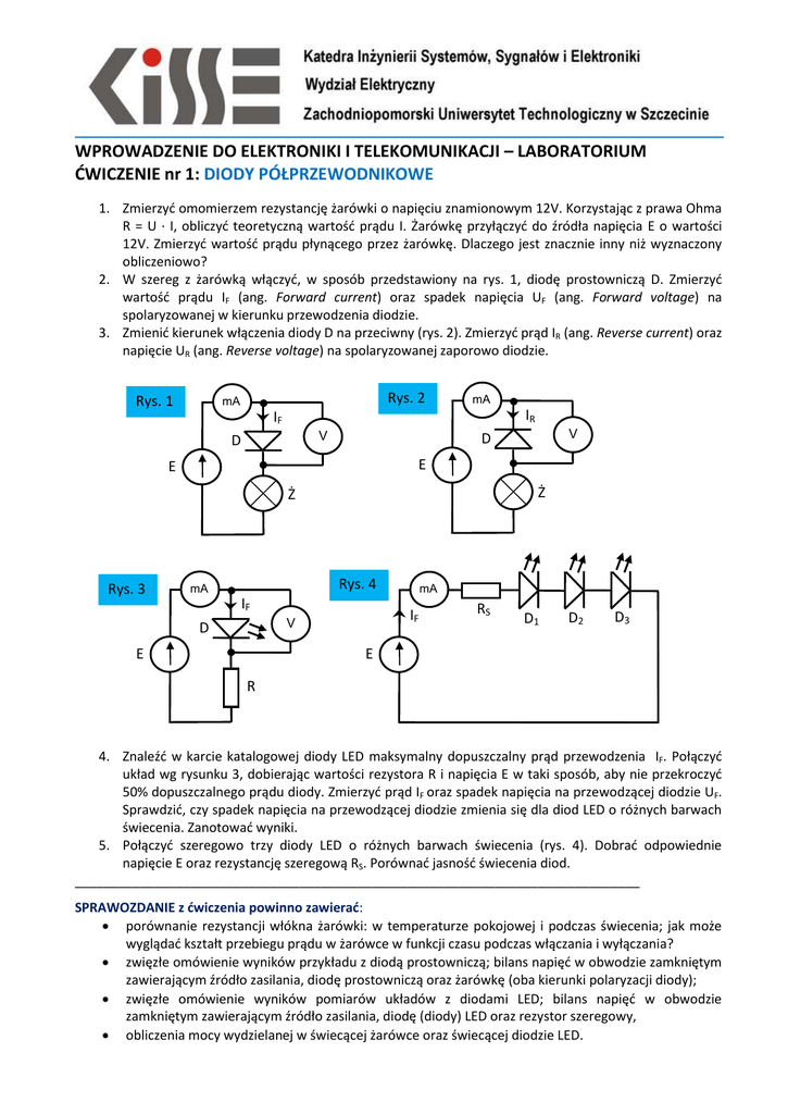 WPROWADZENIE DO ELEKTRONIKI I TELEKOMUNIKACJI – LABORATORIUM ĆWICZENIE nr 1: DIODY PÓŁPRZEWODNIKOWE 1. Zmierzyć omomierzem rezystancję żarówki o napięciu znamionowym 12V. Korzystając z prawa Ohma R = U ∙ I, obliczyć teoretyczną wartość prądu I. Żarówkę przyłączyć do źródła napięcia E o wartości 12V. Zmierzyć wartość prądu płynącego przez żarówkę. Dlaczego jest znacznie inny niż wyznaczony obliczeniowo? 2. W szereg z żarówką włączyć, w sposób przedstawiony na rys. 1, diodę prostowniczą D. Zmierzyć wartość prądu IF (ang. Forward current) oraz spadek napięcia UF (ang. Forward voltage) na spolaryzowanej w kierunku przewodzenia diodzie. 3. Zmienić kierunek włączenia diody D na przeciwny (rys. 2). Zmierzyć prąd IR (ang. Reverse current) oraz napięcie UR (ang. Reverse voltage) na spolaryzowanej zaporowo diodzie. Rys. 1 Rys. 2 mA mA IR IF V D E E Ż Ż Rys. 3 V D Rys. 4 mA IF IF V D E mA RS D1 D2 D3 E R 4. Znaleźć w karcie katalogowej diody LED maksymalny dopuszczalny prąd przewodzenia IF. Połączyć układ wg rysunku 3, dobierając wartości rezystora R i napięcia E w taki sposób, aby nie przekroczyć 50% dopuszczalnego prądu diody. Zmierzyć prąd IF oraz spadek napięcia na przewodzącej diodzie UF. Sprawdzić, czy spadek napięcia na przewodzącej diodzie zmienia się dla diod LED o różnych barwach świecenia. Zanotować wyniki. 5. Połączyć szeregowo trzy diody LED o różnych barwach świecenia (rys. 4). Dobrać odpowiednie napięcie E oraz rezystancję szeregową RS. Porównać jasność świecenia diod. ______________________________________________________________________________ SPRAWOZDANIE z ćwiczenia powinno zawierać: porównanie rezystancji włókna żarówki: w temperaturze pokojowej i podczas świecenia; jak może wyglądać kształt przebiegu prądu w żarówce w funkcji czasu podczas włączania i wyłączania? zwięzłe omówienie wyników przykładu z diodą prostowniczą; bilans napięć w obwodzie zamkniętym zawierającym źródło zasilania, diodę prostowniczą oraz żarówkę (oba kierunki polaryzacji diody); zwięzłe omówienie wyników pomiarów układów z diodami LED; bilans napięć w obwodzie zamkniętym zawierającym źródło zasilania, diodę (diody) LED oraz rezystor szeregowy, obliczenia mocy wydzielanej w świecącej żarówce oraz świecącej diodzie LED.